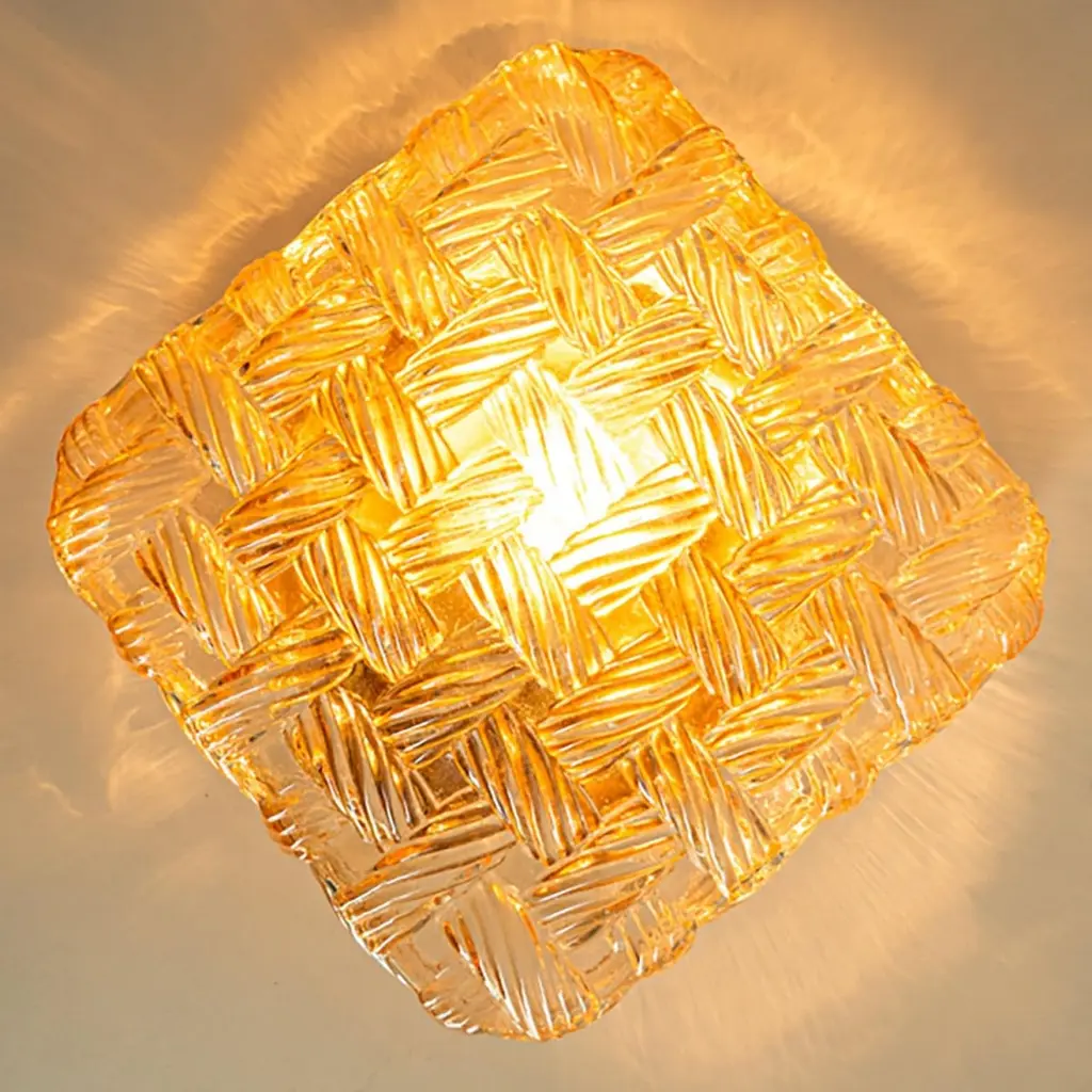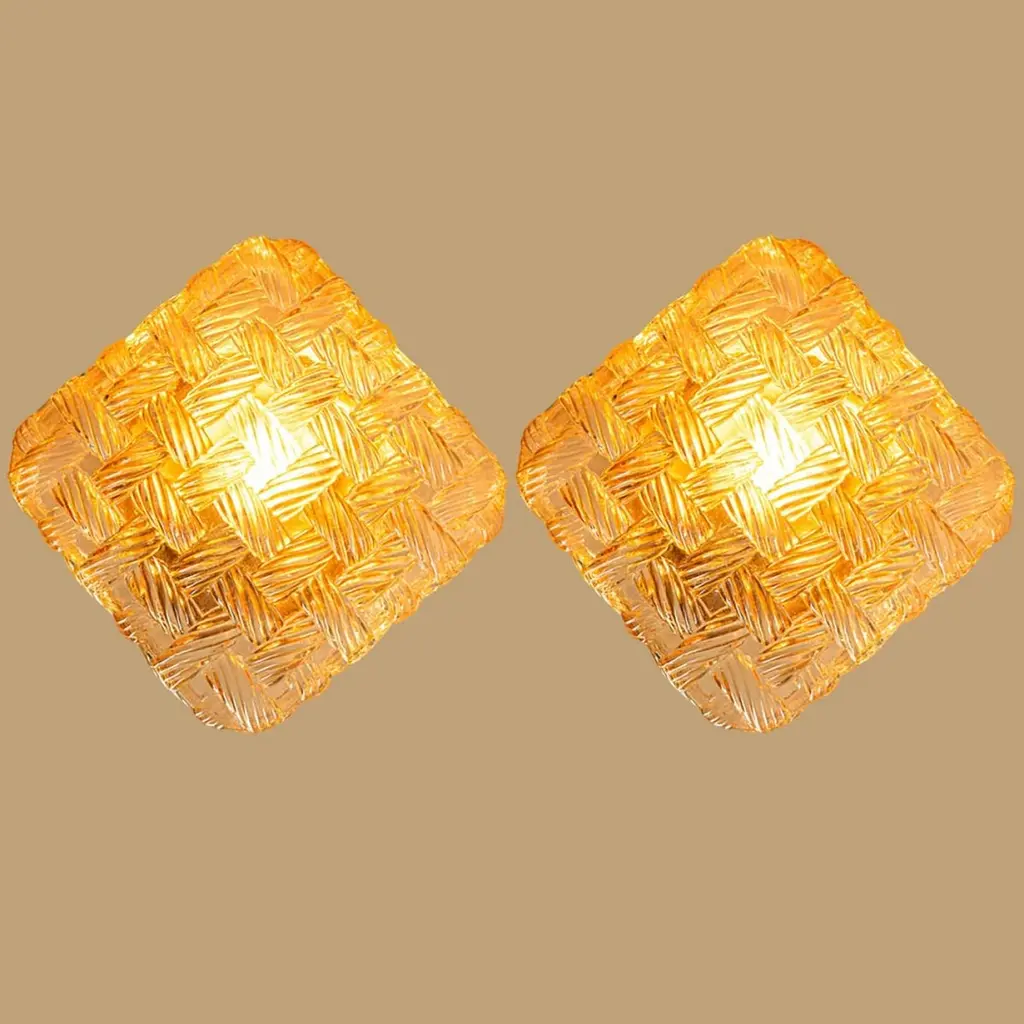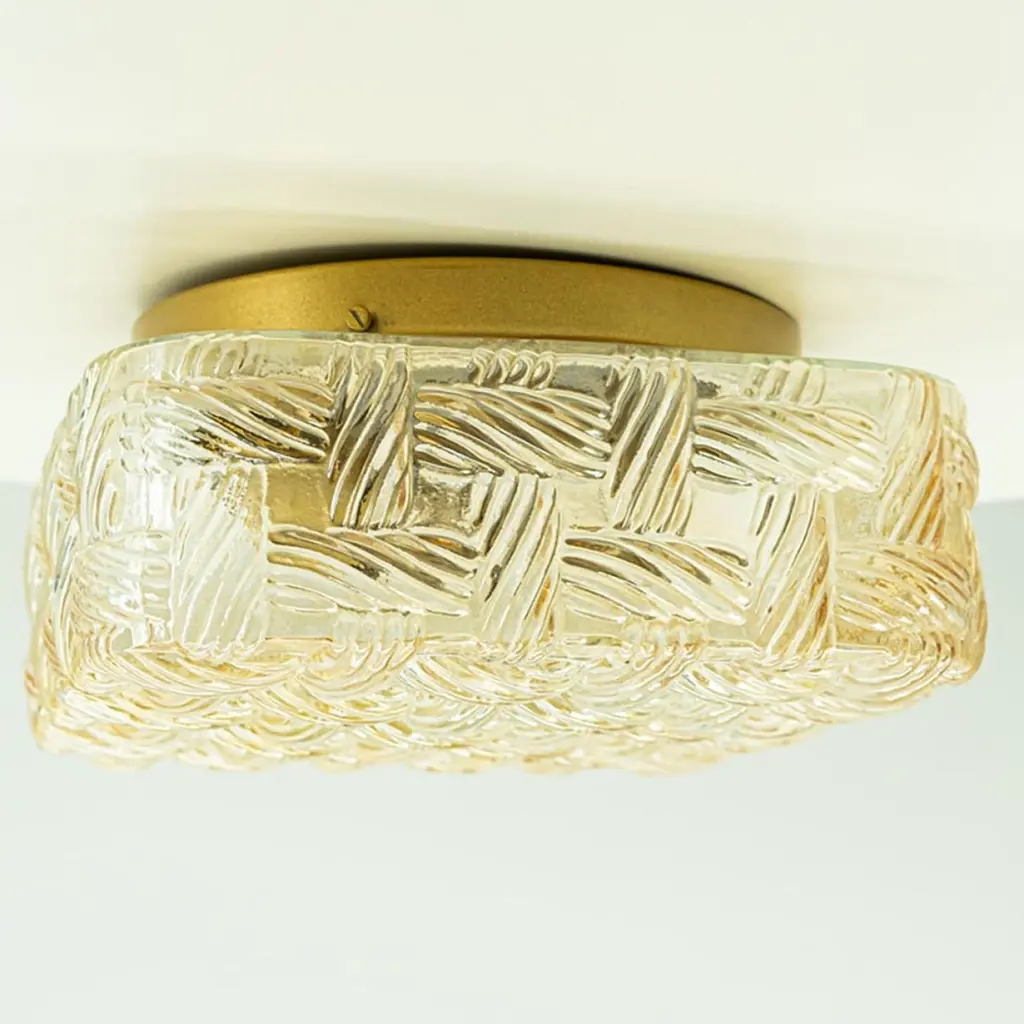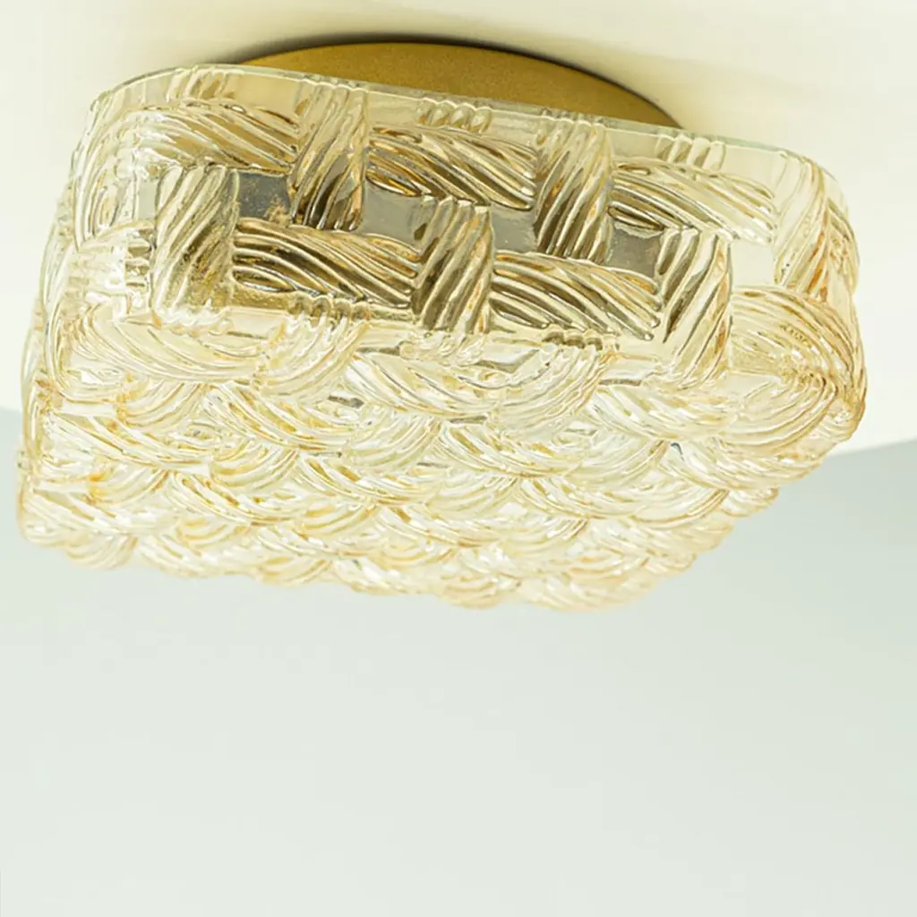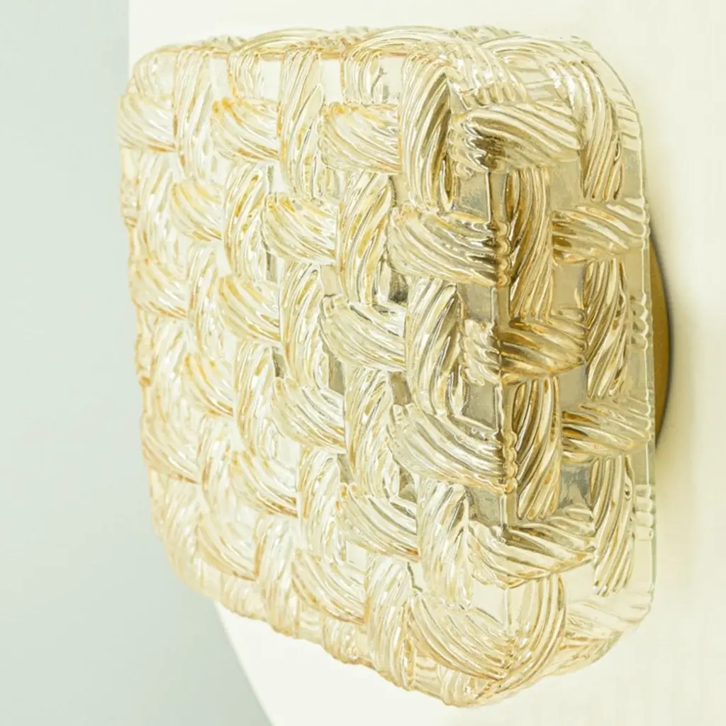 Square Amber Glass Flush Mounts in the style of Helena Tynell, Germany 1960. The glass is designed to appear woven. The square glass is mounted on a gold colored metal back plate.Cleaned, well-wired and ready to use.Please notice the price is for one piece.Dimensions:Height: 7.87" (20 cm)Width: 7.87" (20 cm)Depth: 4.33" ( 11 cm)