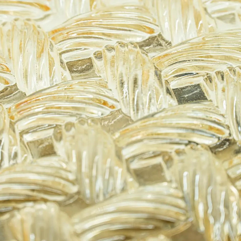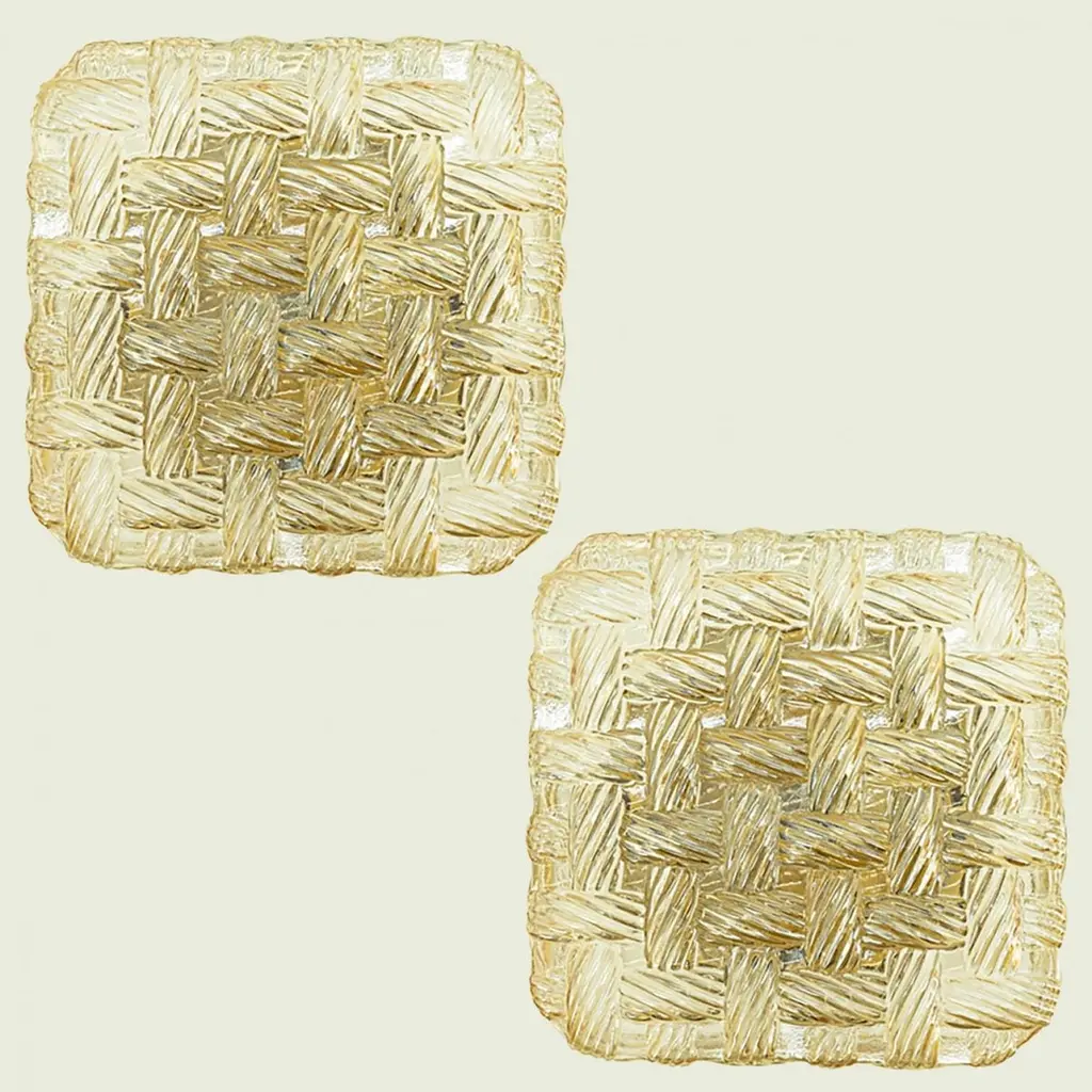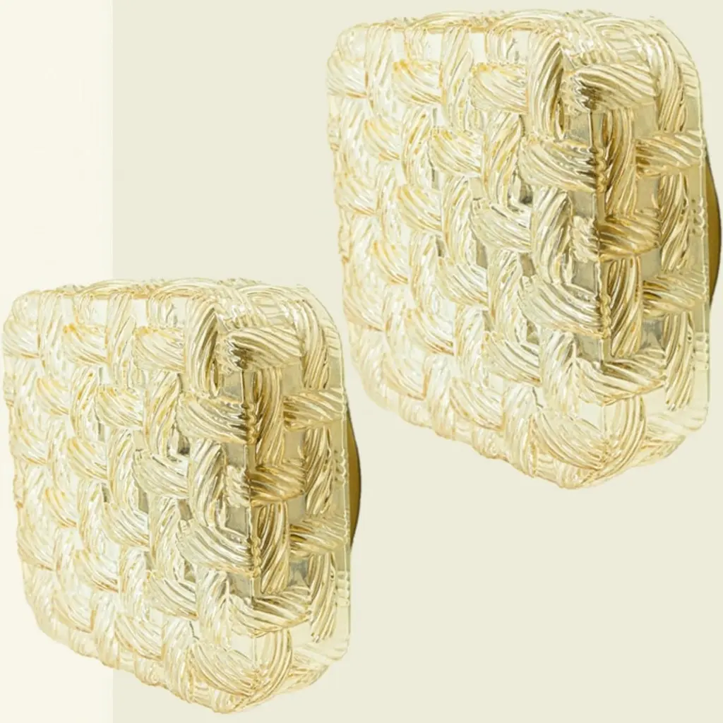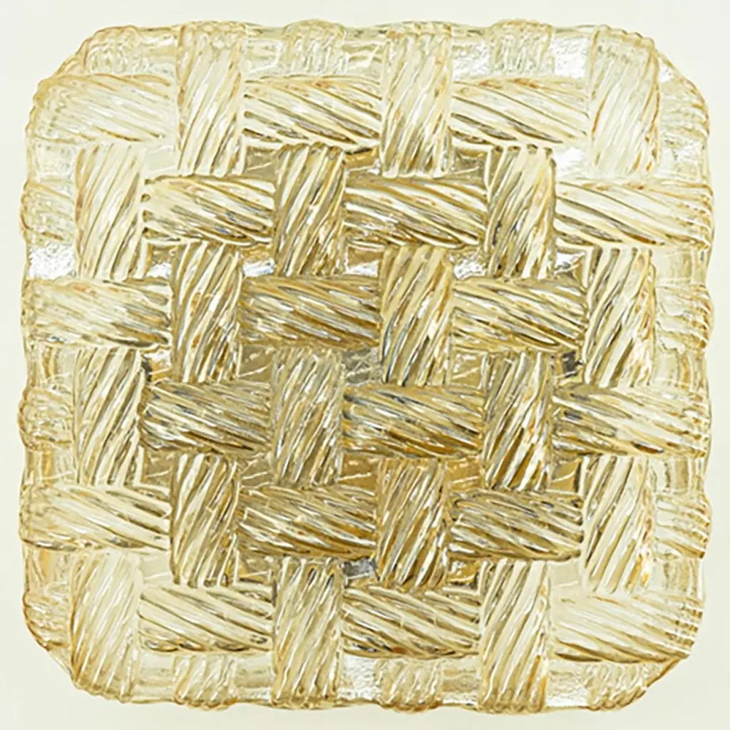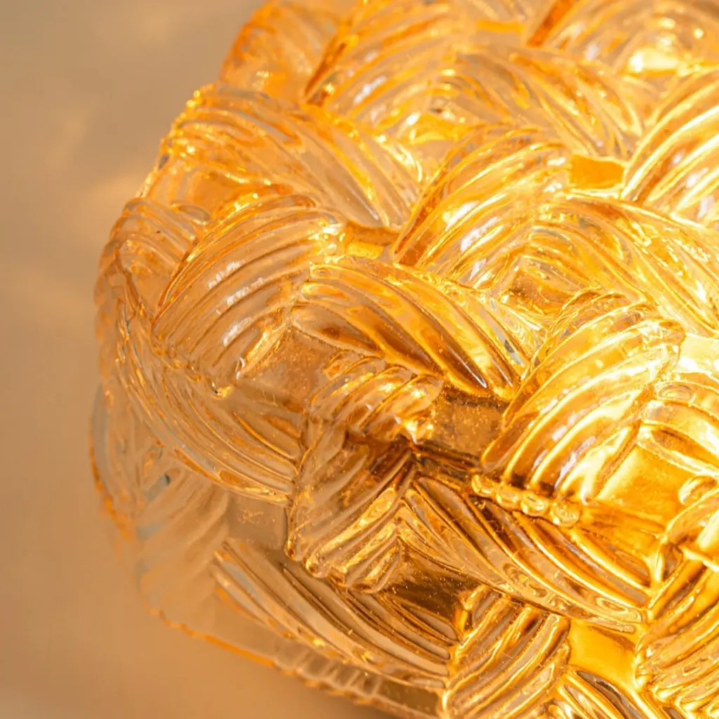 Square Amber Glass Flush Mounts in the style of Helena Tynell, Germany 1960. The glass is designed to appear woven. The square glass is mounted on a gold colored metal back plate.Cleaned, well-wired and ready to use.Please notice the price is for one piece.Dimensions:Height: 7.87" (20 cm)Width: 7.87" (20 cm)Depth: 4.33" ( 11 cm)