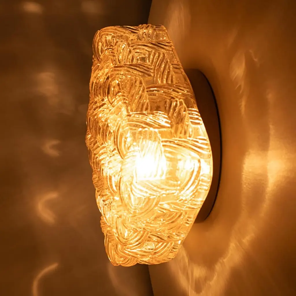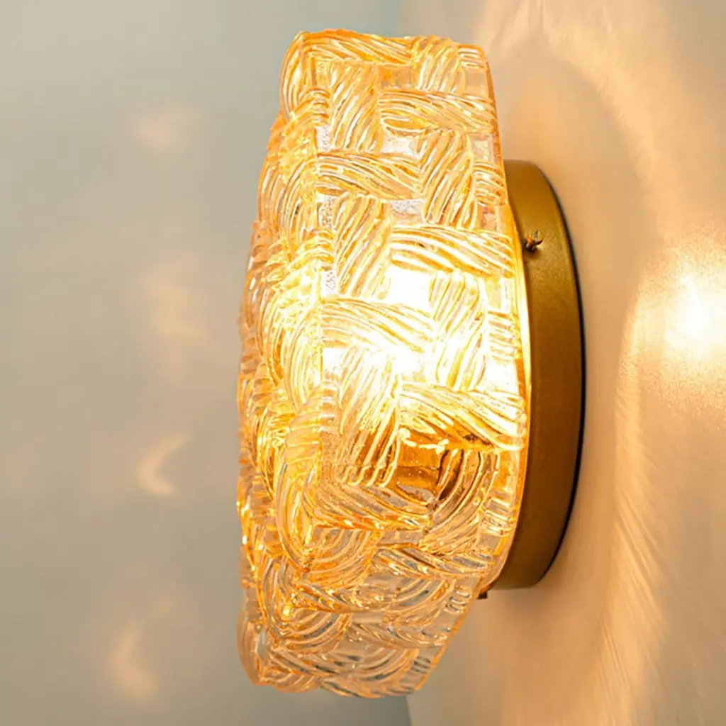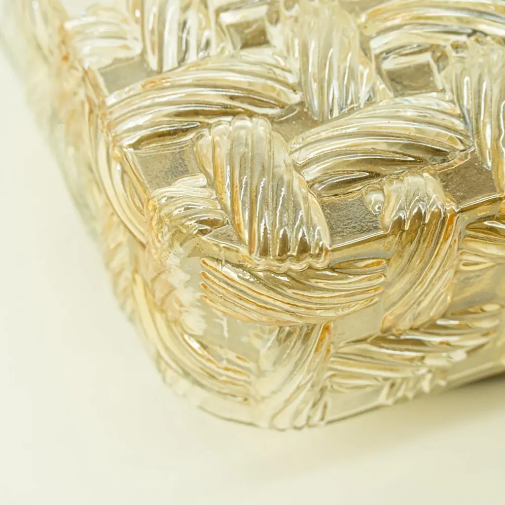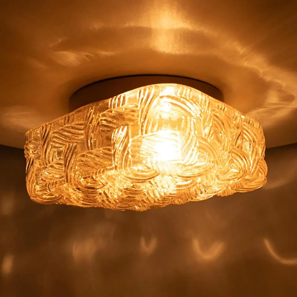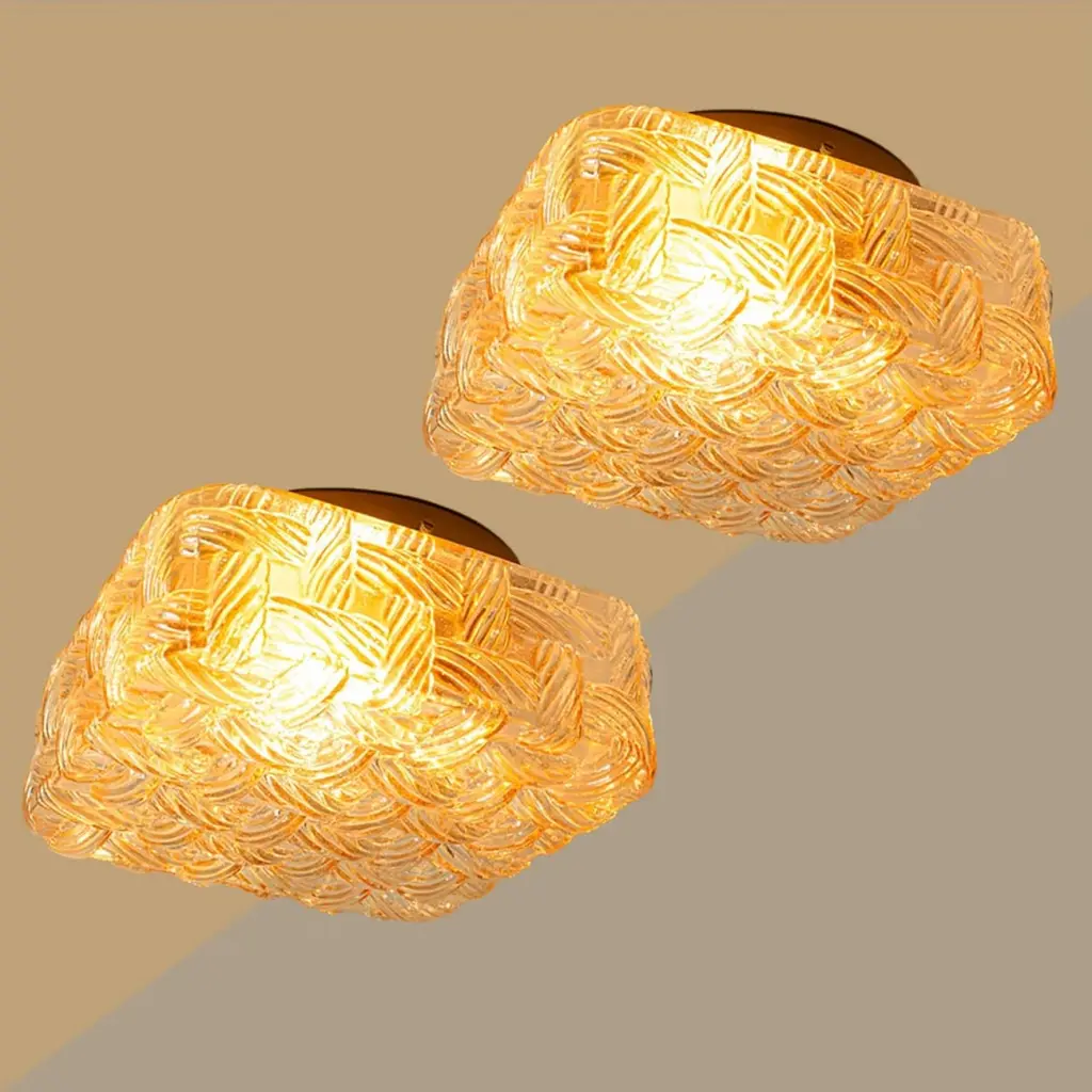 Square Amber Glass Flush Mounts in the style of Helena Tynell, Germany 1960. The glass is designed to appear woven. The square glass is mounted on a gold colored metal back plate.Cleaned, well-wired and ready to use.Please notice the price is for one piece.Dimensions:Height: 7.87" (20 cm)Width: 7.87" (20 cm)Depth: 4.33" ( 11 cm)