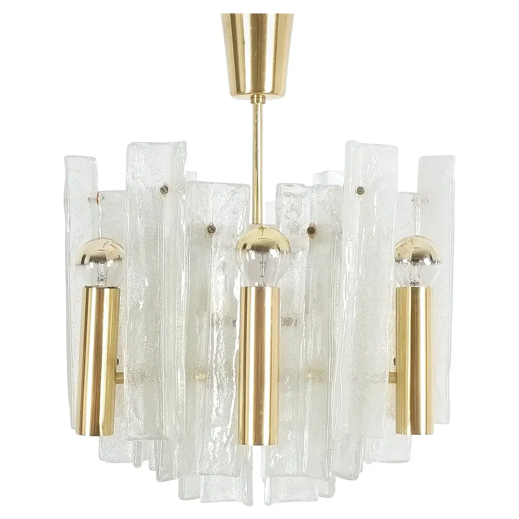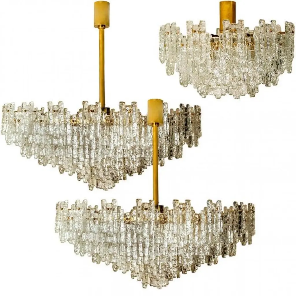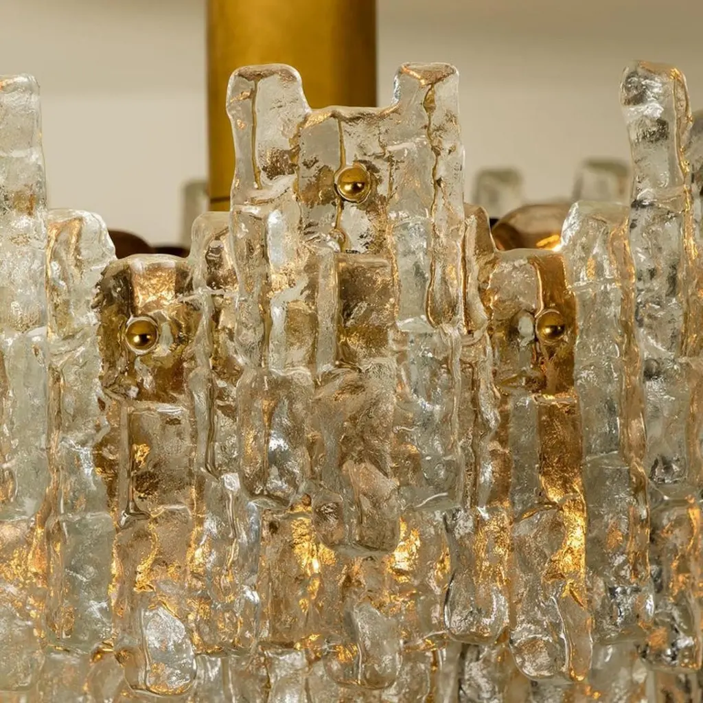 1 of the 2 exceptional, huge, clean and modern ballroom flush mount by J.T. Kalmar Leuchten from the 1960s. The chandelier consists layers with several hand blown textured glass shades mounted on a brass frame arranged in concentric rings.This size high-end Kalmar flush mount is exceptional and very rare to find. I opportunity that you don t see often. 2 pieces available. Also chandeliers and wall lights available from the same model series.This flush is comfortable with many decor periods. Real eye catchers. The high quality textured handmade shades beautifully reflecting the light. Filling a room with a soft, warm and welcoming glow.The size flush mount: Height 15.8" (40 cm) x diameter 27.7 (70 cm).The high-end flush mount is in very good vintage condition. Cleaned, well-wired and ready to use. All shades in this elegant level arrangement are without chips or cracks. The flush mount ... E27 screw light bulbs up to 40 watts each and is LED compatible.