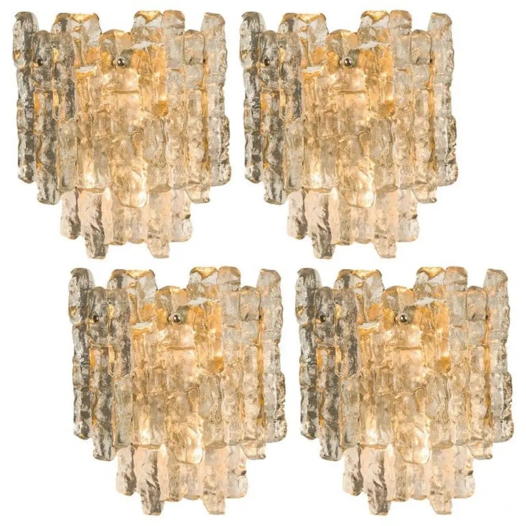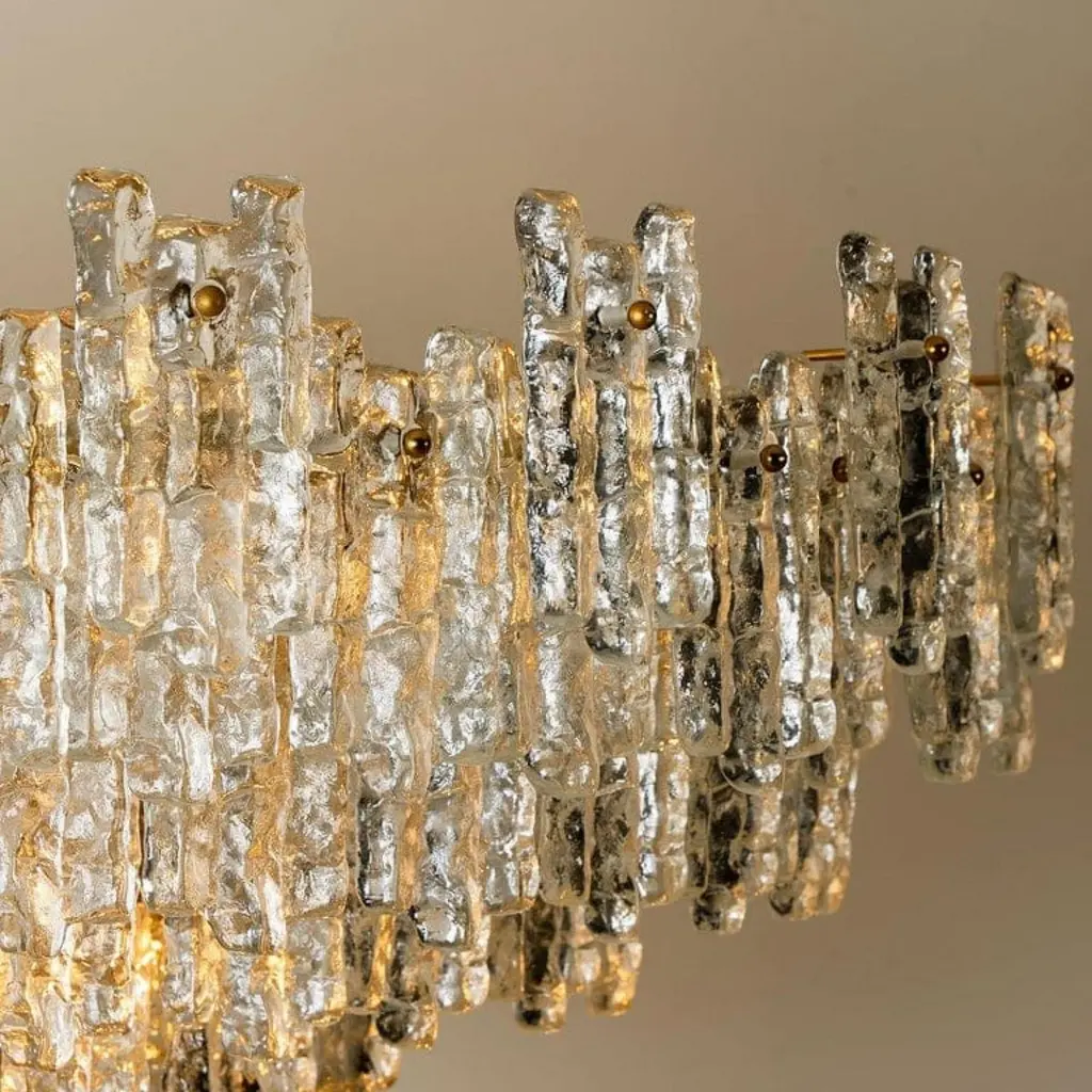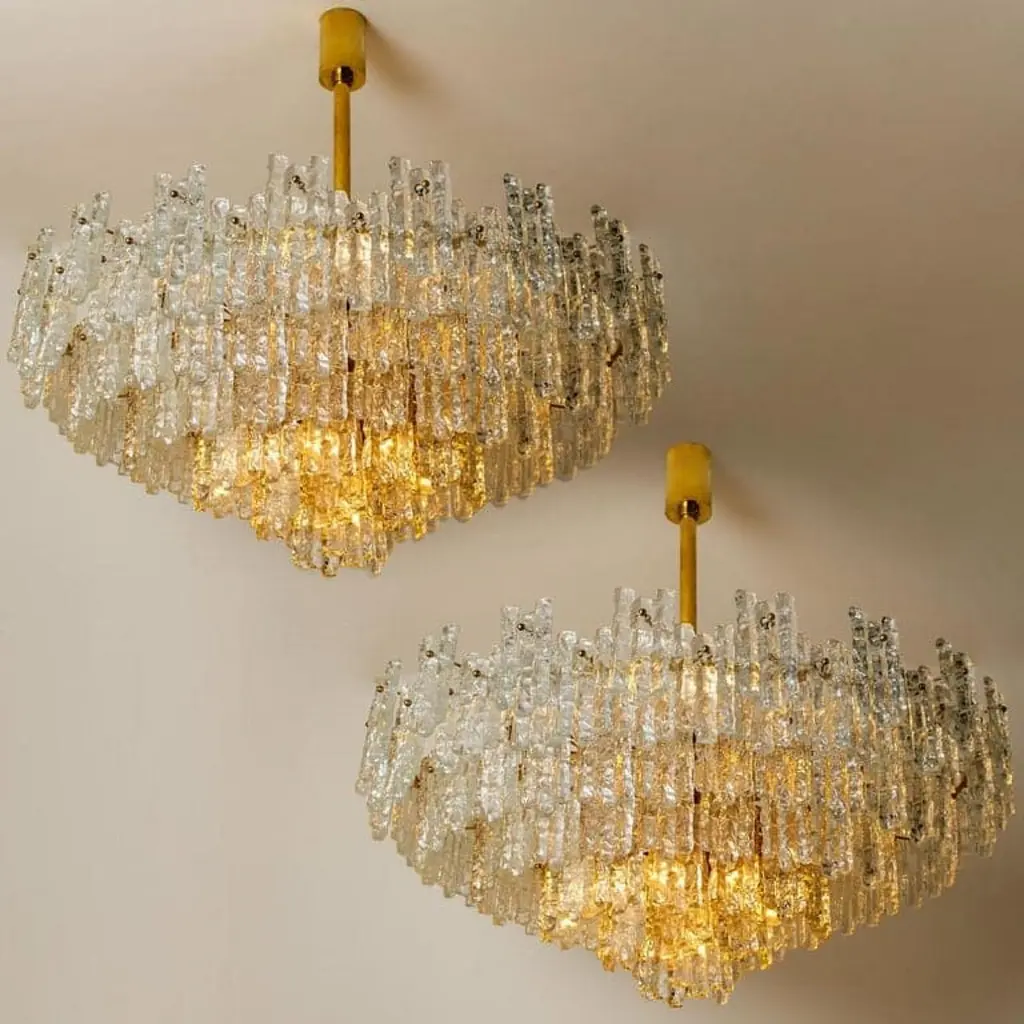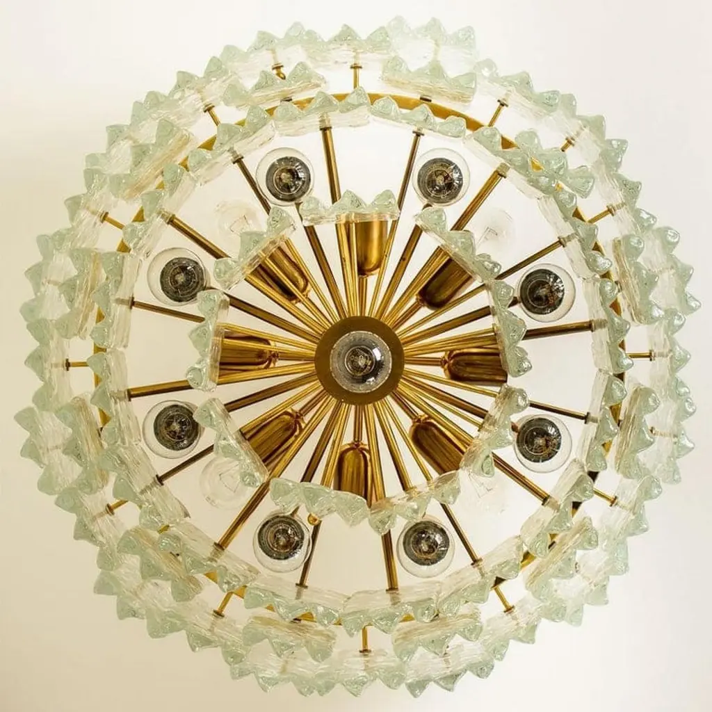 1 of the 2 exceptional, huge, clean and modern ballroom flush mount by J.T. Kalmar Leuchten from the 1960s. The chandelier consists layers with several hand blown textured glass shades mounted on a brass frame arranged in concentric rings.This size high-end Kalmar flush mount is exceptional and very rare to find. I opportunity that you don t see often. 2 pieces available. Also chandeliers and wall lights available from the same model series.This flush is comfortable with many decor periods. Real eye catchers. The high quality textured handmade shades beautifully reflecting the light. Filling a room with a soft, warm and welcoming glow.The size flush mount: Height 15.8" (40 cm) x diameter 27.7 (70 cm).The high-end flush mount is in very good vintage condition. Cleaned, well-wired and ready to use. All shades in this elegant level arrangement are without chips or cracks. The flush mount ... E27 screw light bulbs up to 40 watts each and is LED compatible.