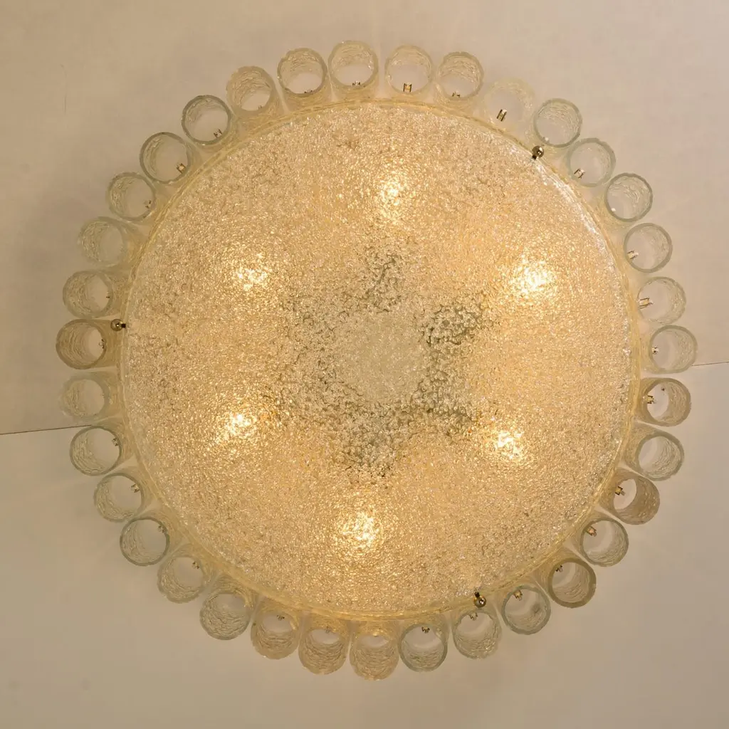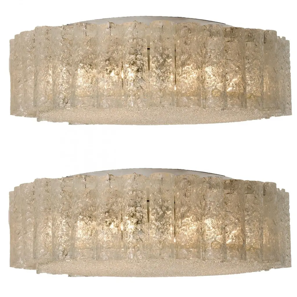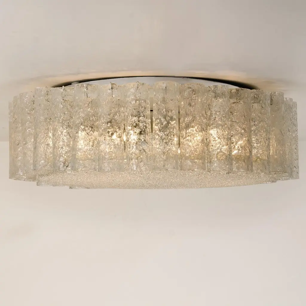 Two large Doria flush mount chandeliers, organic glass tubes surrounding a central glass diffuser mounted with minimal exposed hardware for a clean and elegant look.The stylish elegance of this lamp suits many environment, from Mid Century to Hollywood Regency, from Danish modern to Space Age and contemporary interiorThe price is per lamp. They will be sold individually or as pair.Cleaned and well-wired, in full working order and ready to use. The frame is in very good condition. The flush mounts can be disassembled and the crystals individually wrapped for easy transport. Each light fixture takes six medium base bulbs up to 60 watts per bulb.
