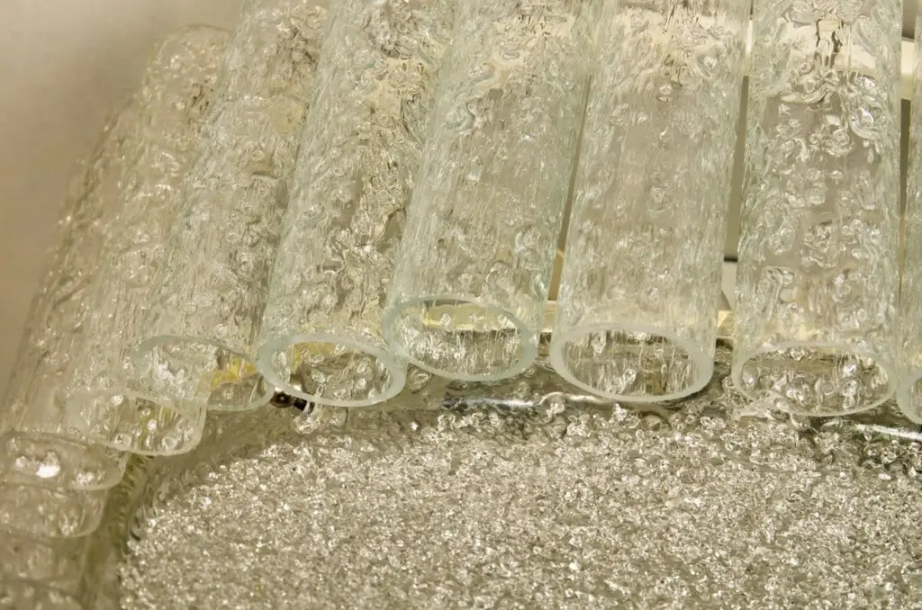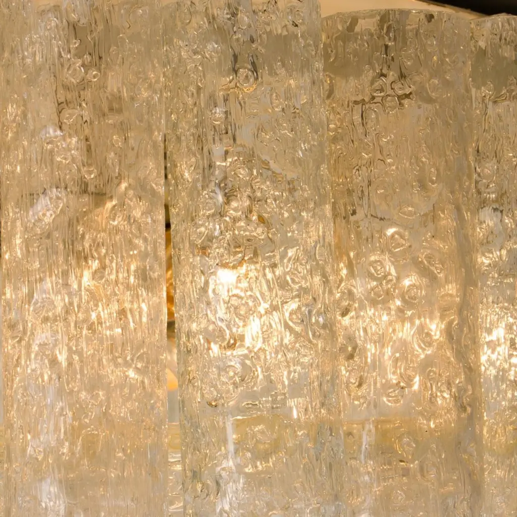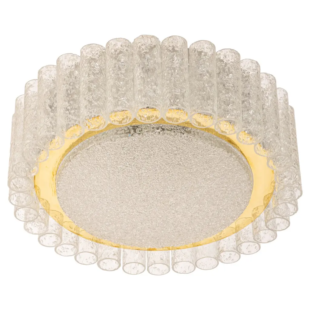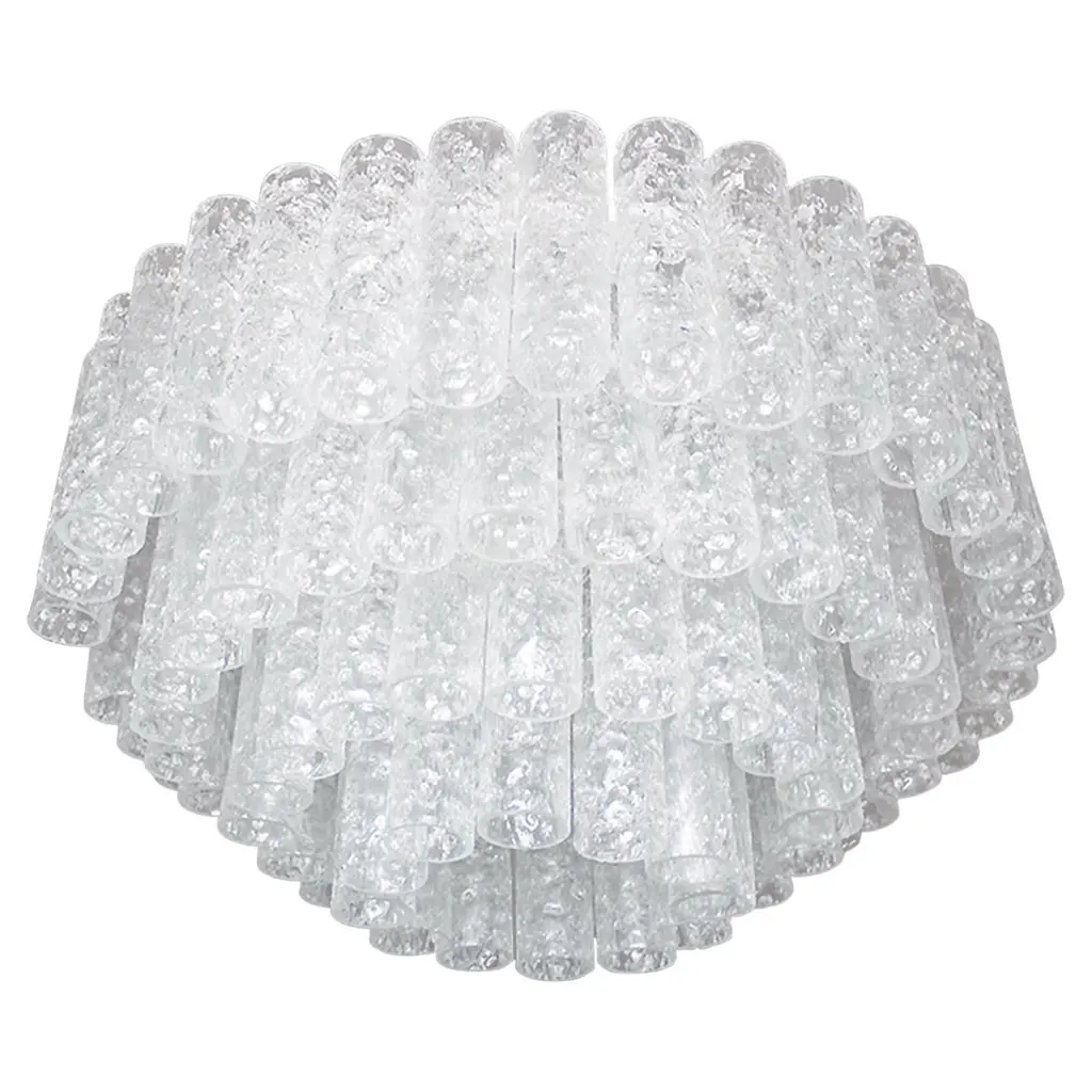Two large Doria flush mount chandeliers, organic glass tubes surrounding a central glass diffuser mounted with minimal exposed hardware for a clean and elegant look.The stylish elegance of this lamp suits many environment, from Mid Century to Hollywood Regency, from Danish modern to Space Age and contemporary interiorThe price is per lamp. They will be sold individually or as pair.Cleaned and well-wired, in full working order and ready to use. The frame is in very good condition. The flush mounts can be disassembled and the crystals individually wrapped for easy transport. Each light fixture takes six medium base bulbs up to 60 watts per bulb.