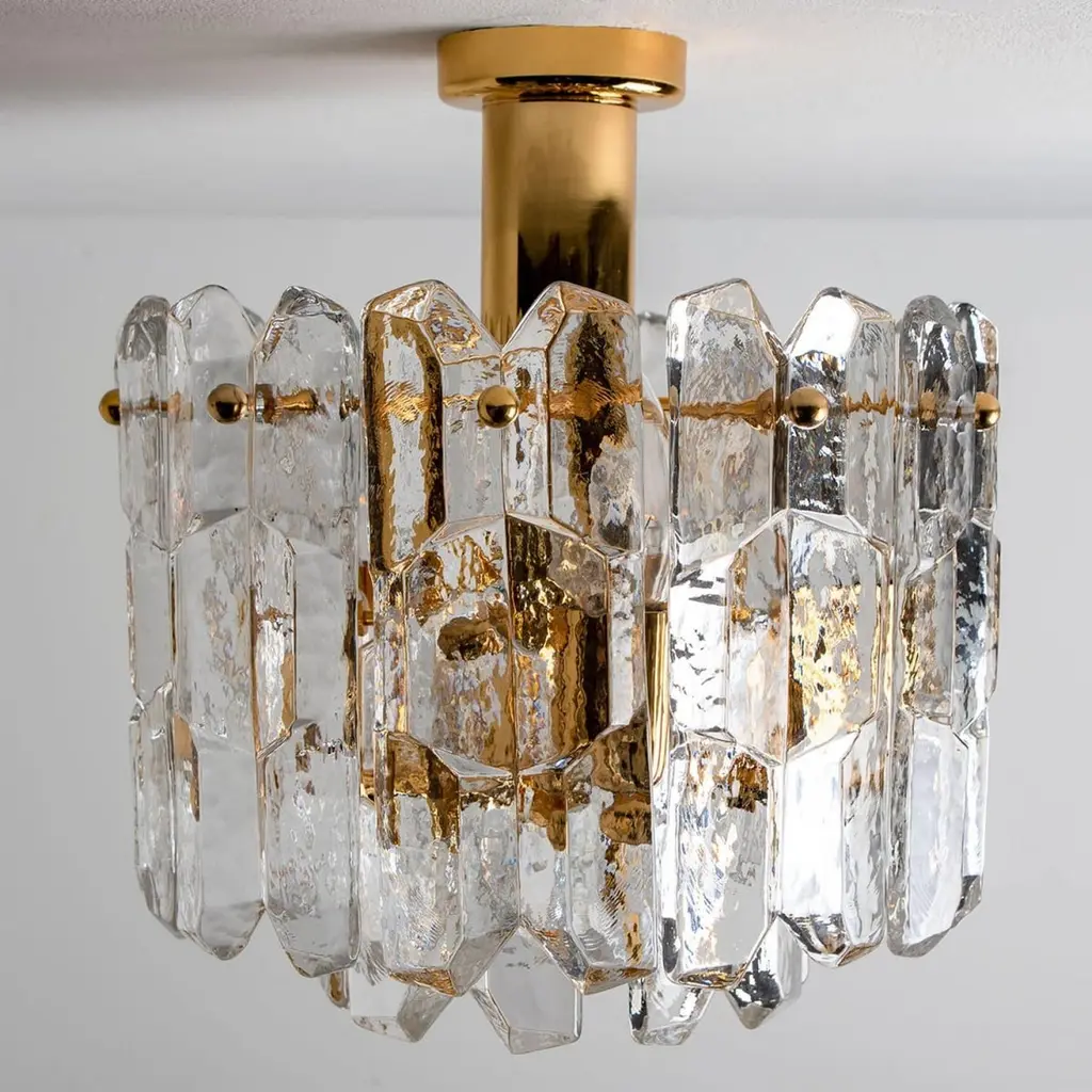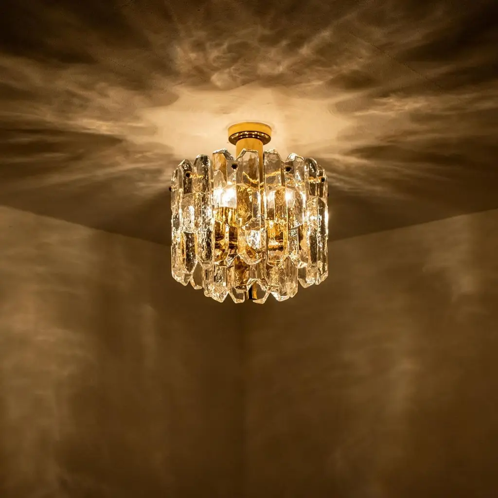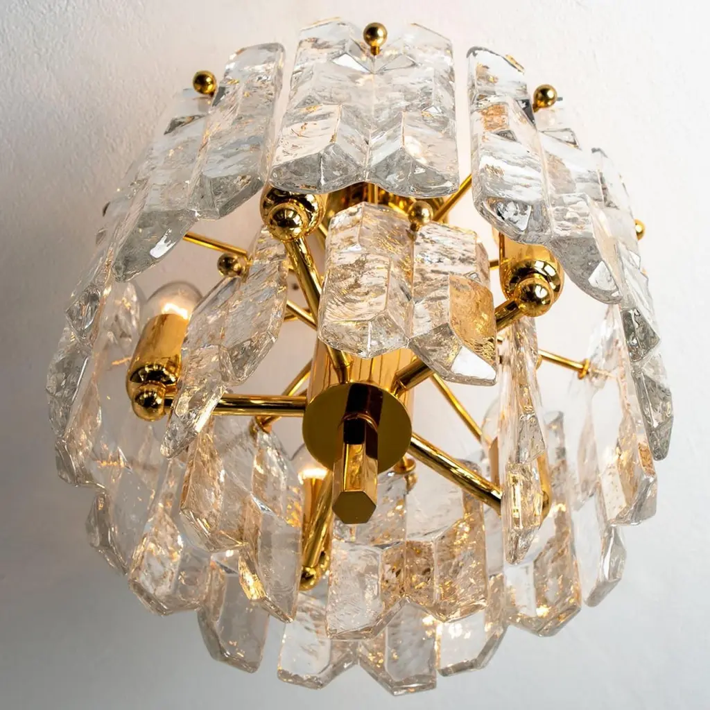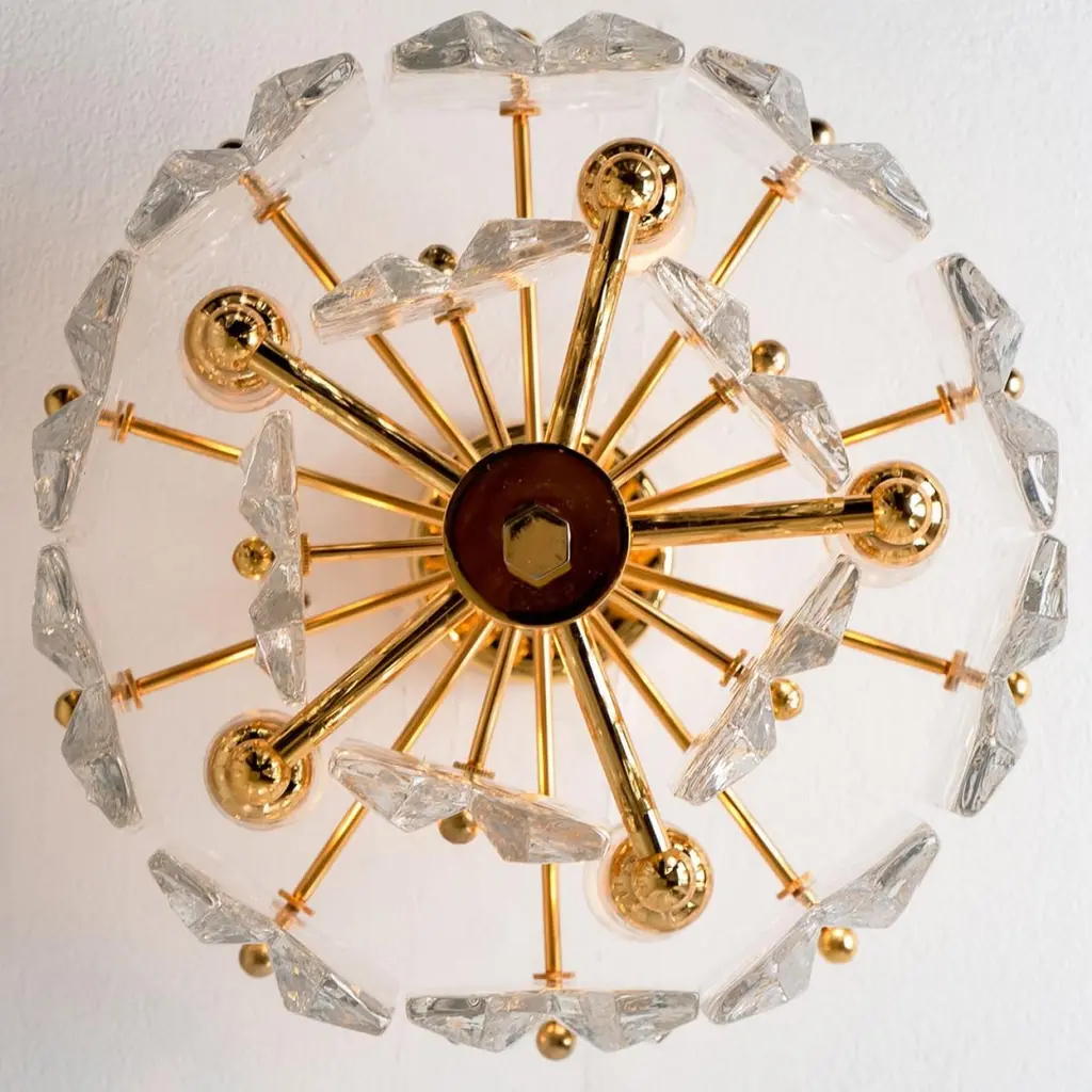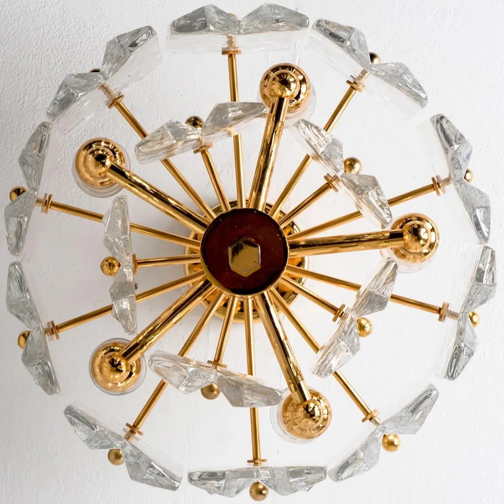 Stunning high quality and handmade gilt brass light fixture / flush mount made by Kalmar in Austria. This model "Palazzo" was manufactured, circa 1970-1979. Polished brilliant crystal glasses are mounted on a gilded brass frame.Cleaned and well-wired, in full working order and ready to use. The brass frame is in very good vintage condition. The crystal glasses, all original and in excellent condition, screwed securely to the frame. This light can be disassembled and the crystals individually wrapped for easy transport.PLease notice the price is fore 1 piece, two pieces available.