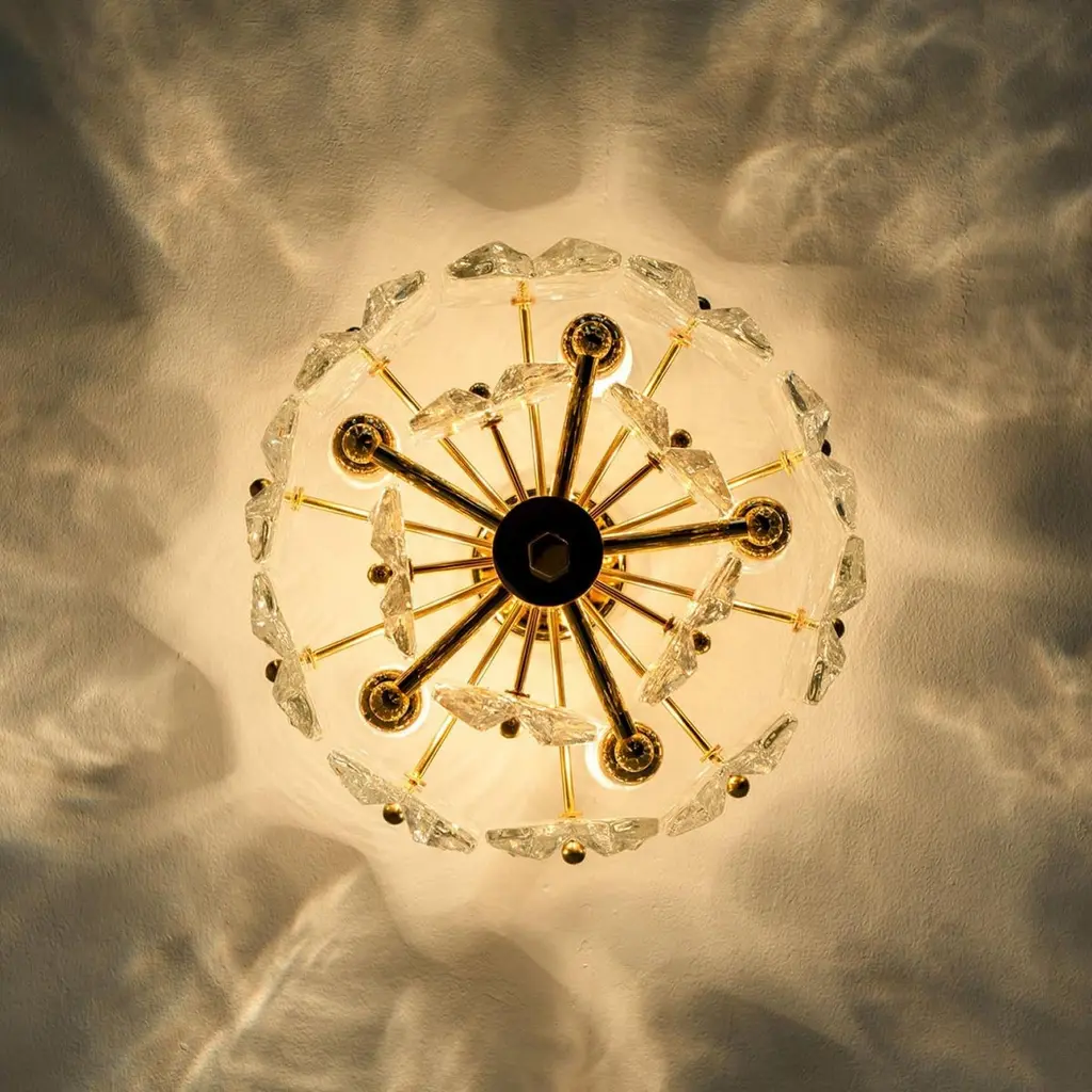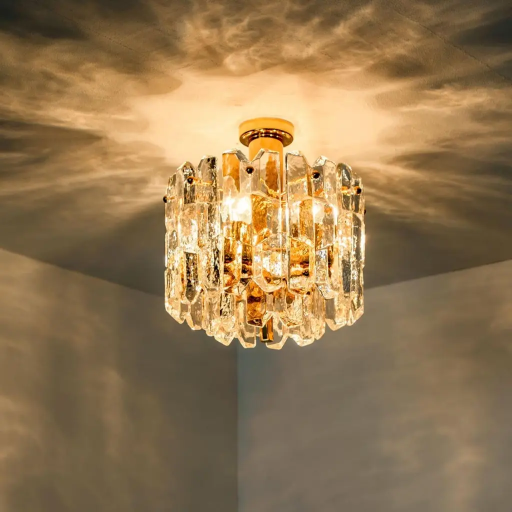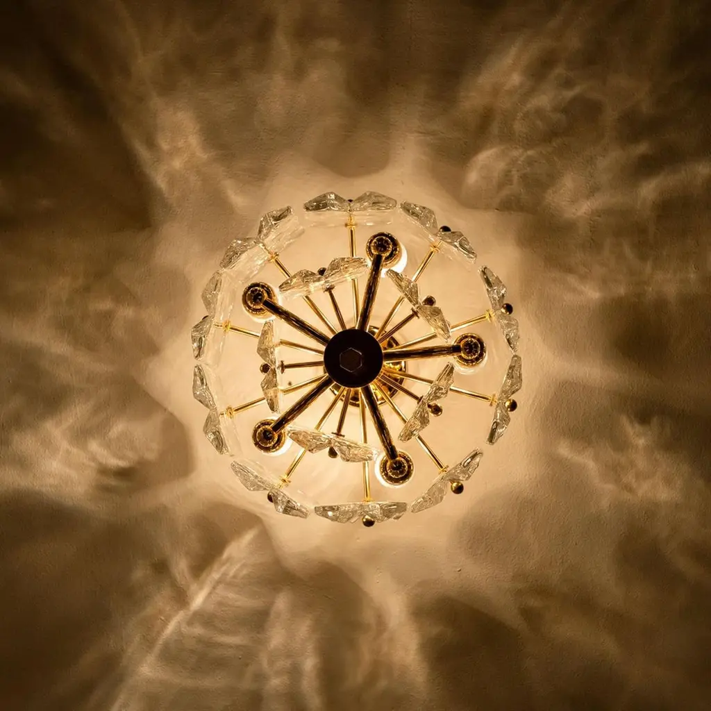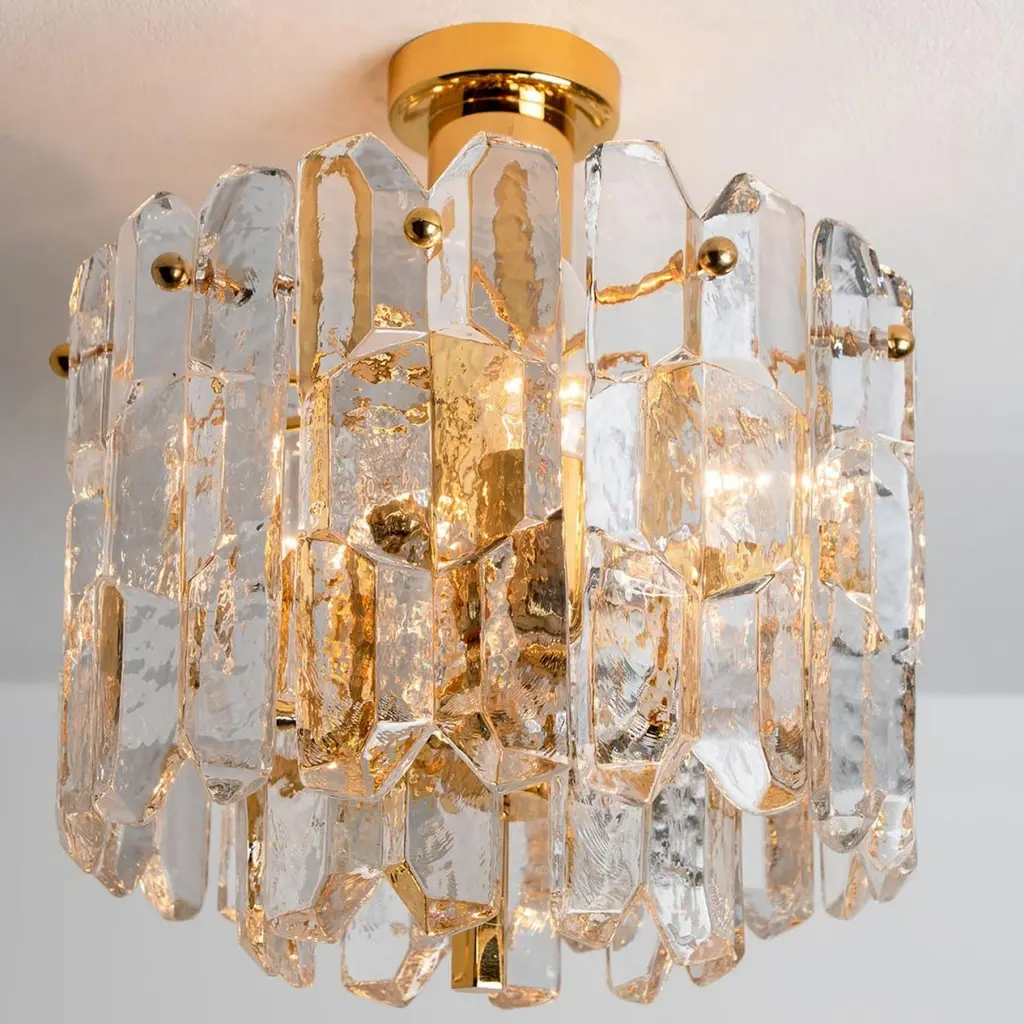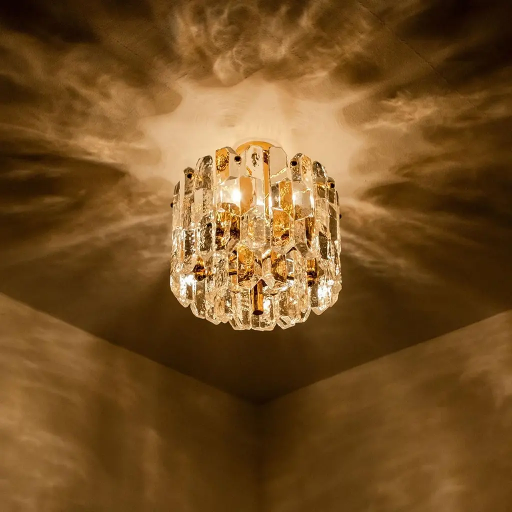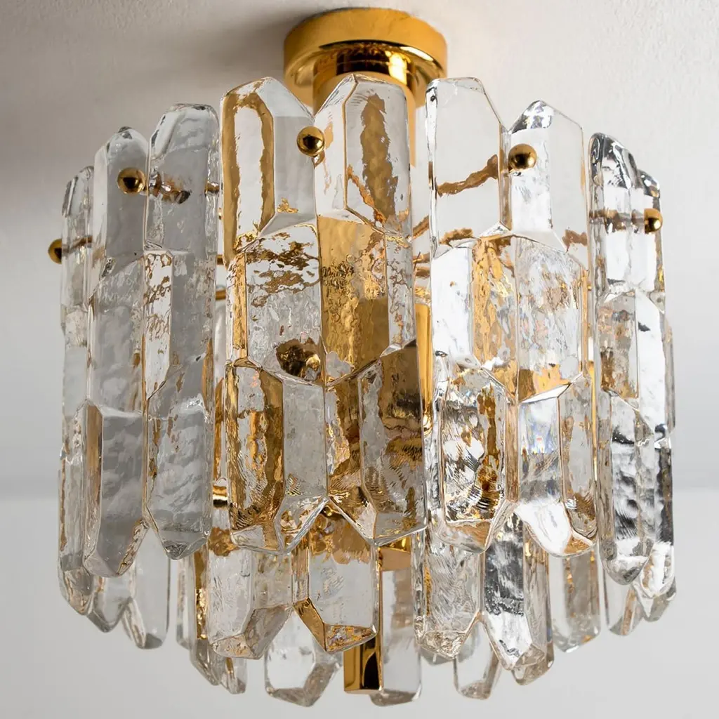 Stunning high quality and handmade gilt brass light fixture / flush mount made by Kalmar in Austria. This model "Palazzo" was manufactured, circa 1970-1979. Polished brilliant crystal glasses are mounted on a gilded brass frame.Cleaned and well-wired, in full working order and ready to use. The brass frame is in very good vintage condition. The crystal glasses, all original and in excellent condition, screwed securely to the frame. This light can be disassembled and the crystals individually wrapped for easy transport.PLease notice the price is fore 1 piece, two pieces available.