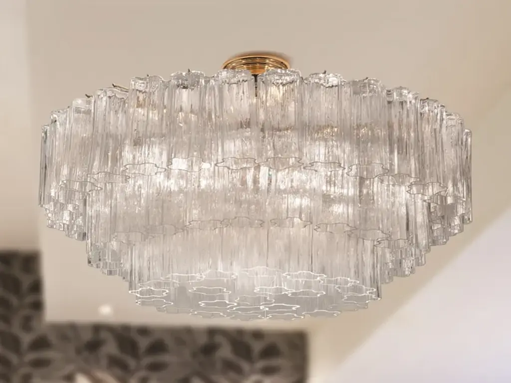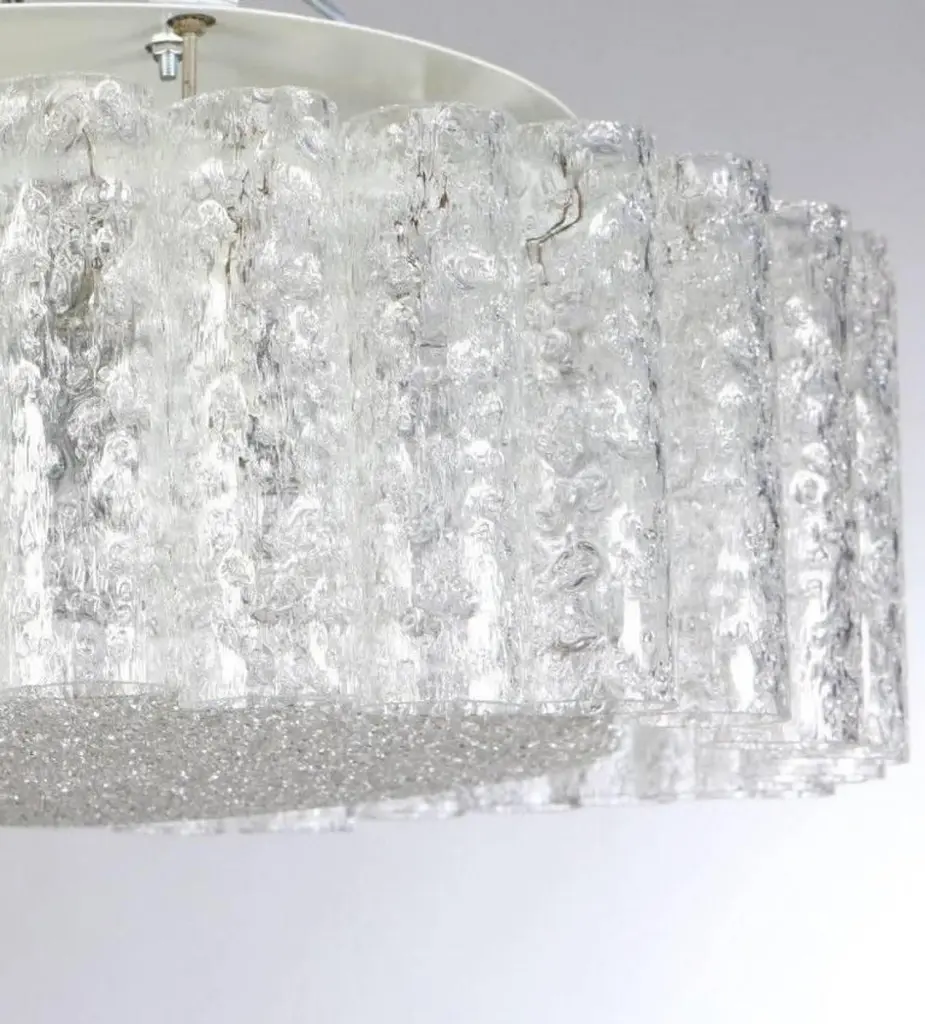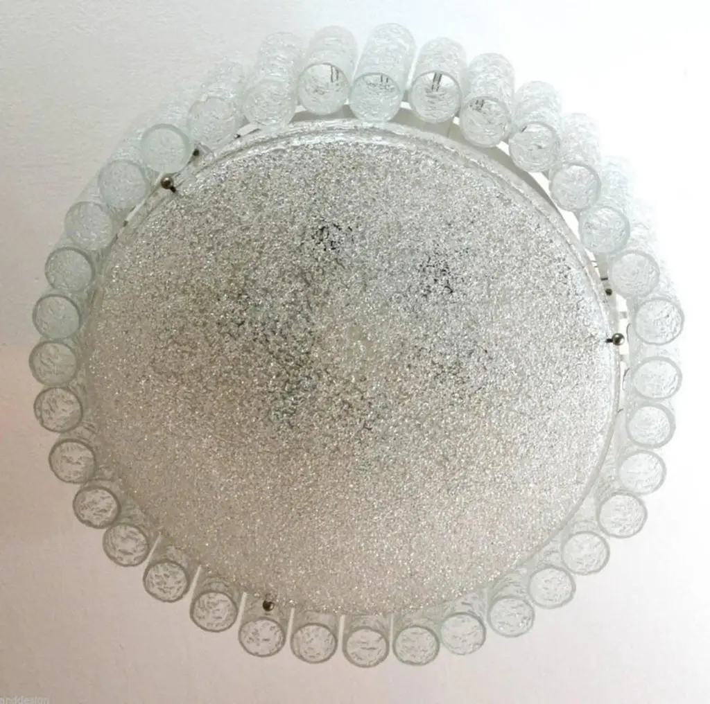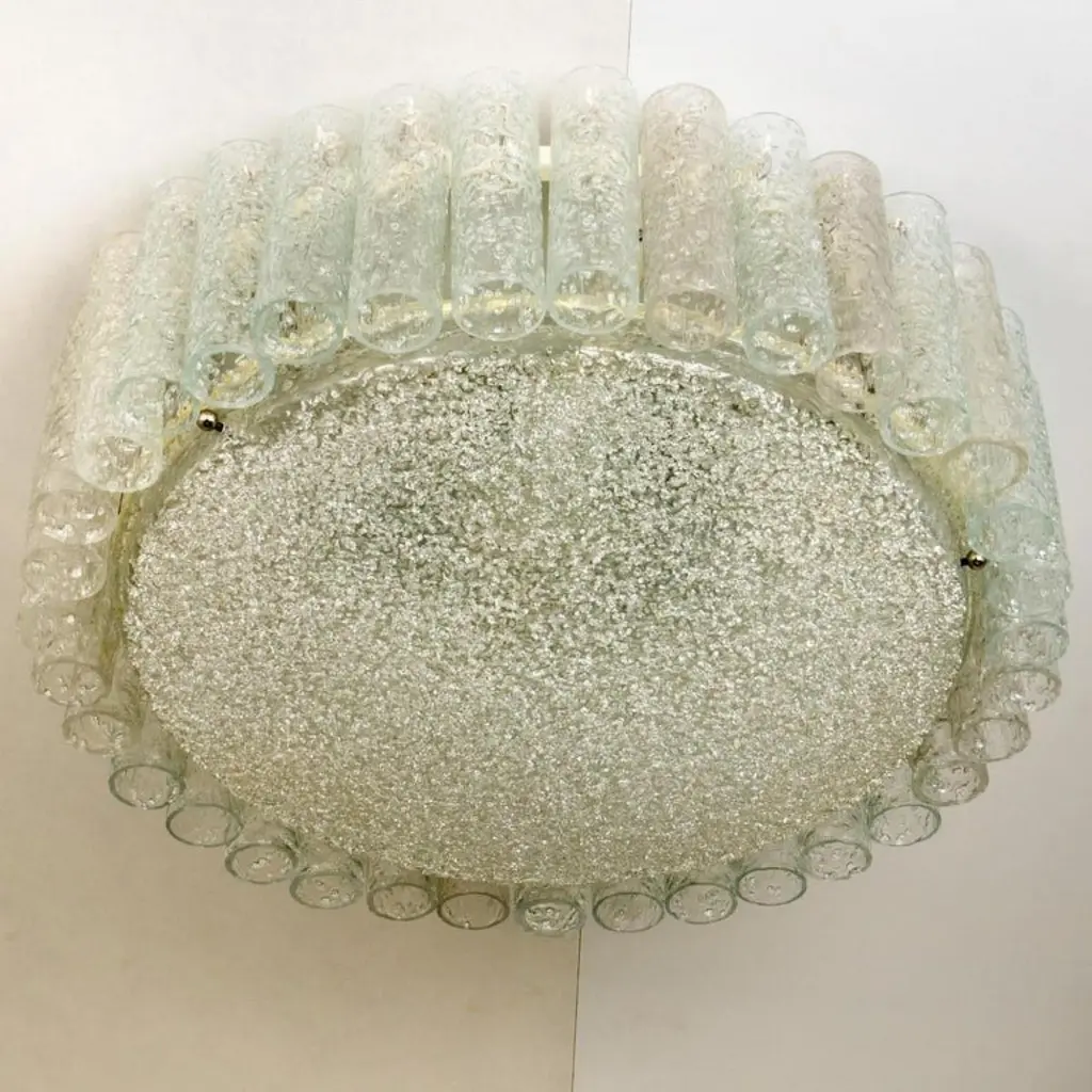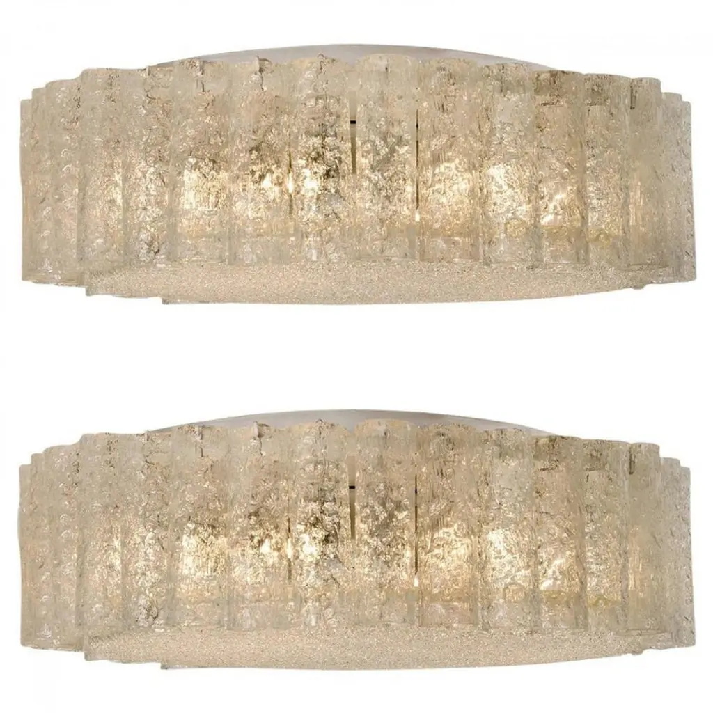 Two large Doria flushmount chandeliers, organic glass tubes surrounding a central glass diffuser mounted with minimal exposed hardware for a clean and elegant look.The stylish elegance of this lamp suits many environment, from midcentury to Hollywood Regency, from Danish modern to Space Age and contemporary interior.The price is per lamp. They will be sold individually or as pair.Cleaned and well-wired, in full working order and ready to use. The frame is in very good condition. The flush mounts can be disassembled and the crystals individually wrapped for easy transport. Each light fixture takes six medium base bulbs up to 60 watts per bulb.