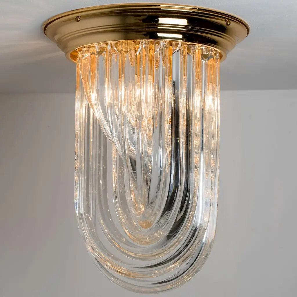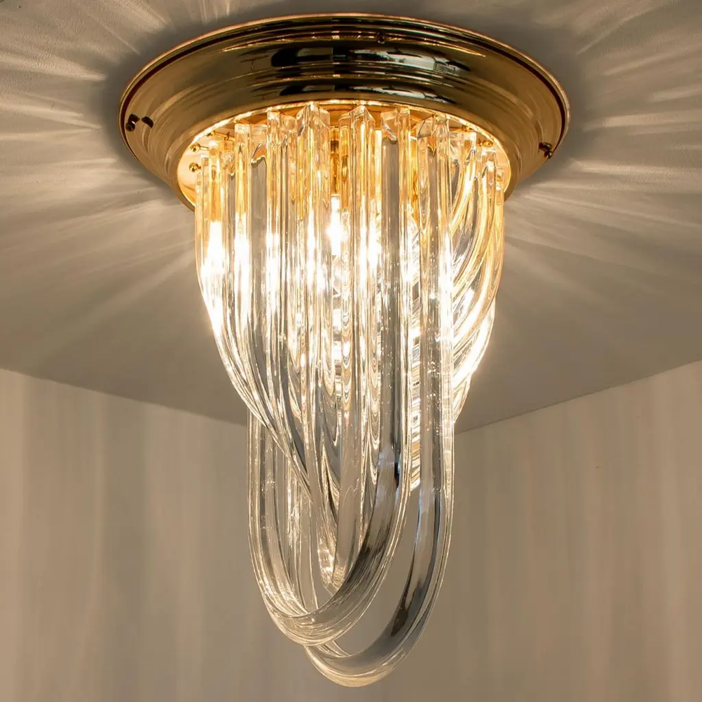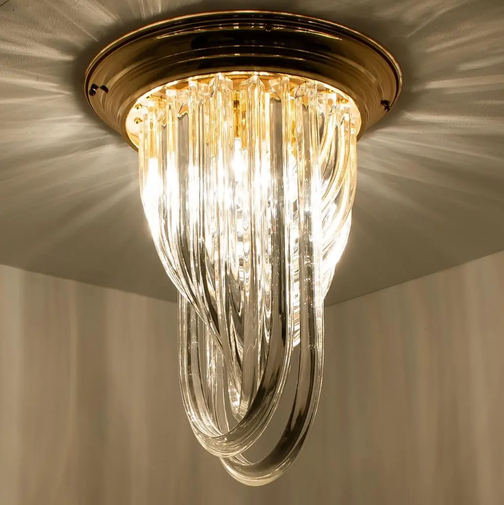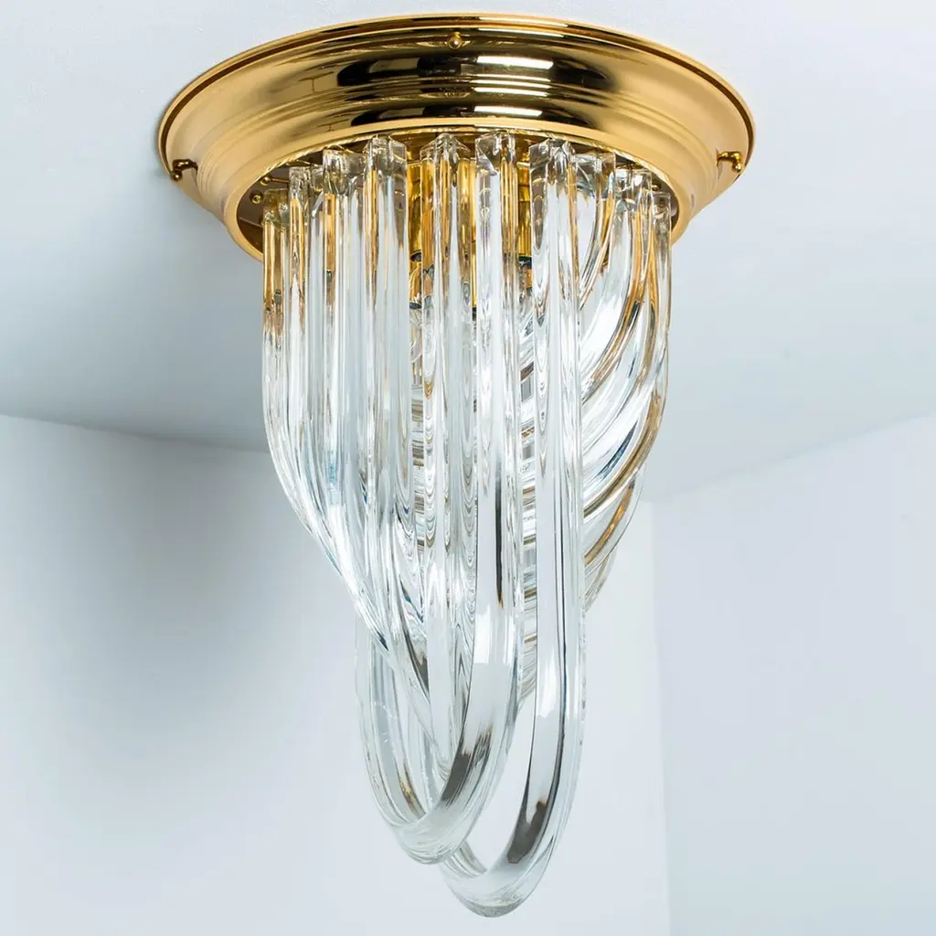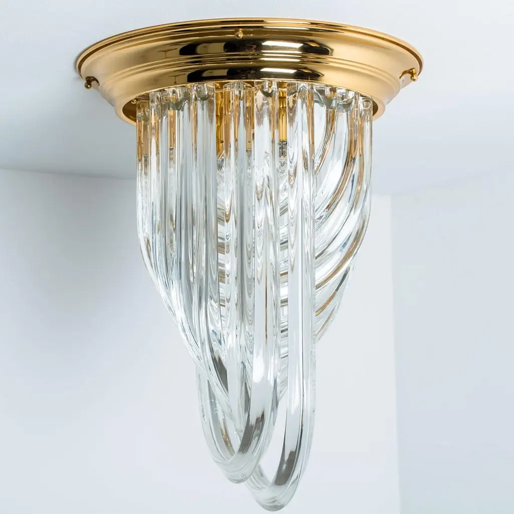 A beautiful and impressive Venini flush mount light, curved crystal glass and gilt brass, Italy.The flush mount is made of curved crystal Murano glasses in different lengths. The flush mount has eight lights with Murano crystal tubes and a gold-plated brass frame. The crystals are cut in such a way that radiate the light of the bulbs in different directions beautiful! The light requires 4x E14 light bulbs.Dimensions:Height: 22,4" (57 cm) Diameter: 16,9" (43 cm).Please notice the price is for one piece, two pieces available.Cleaned and well-wired, in full working order and ready to use. The brass frame is in excellent condition. The large crystal curved crystals, all original and also in excellent condition, screw securely to the frame. This flush mount can be disassembled and the crystals individually wrapped for easy transport.