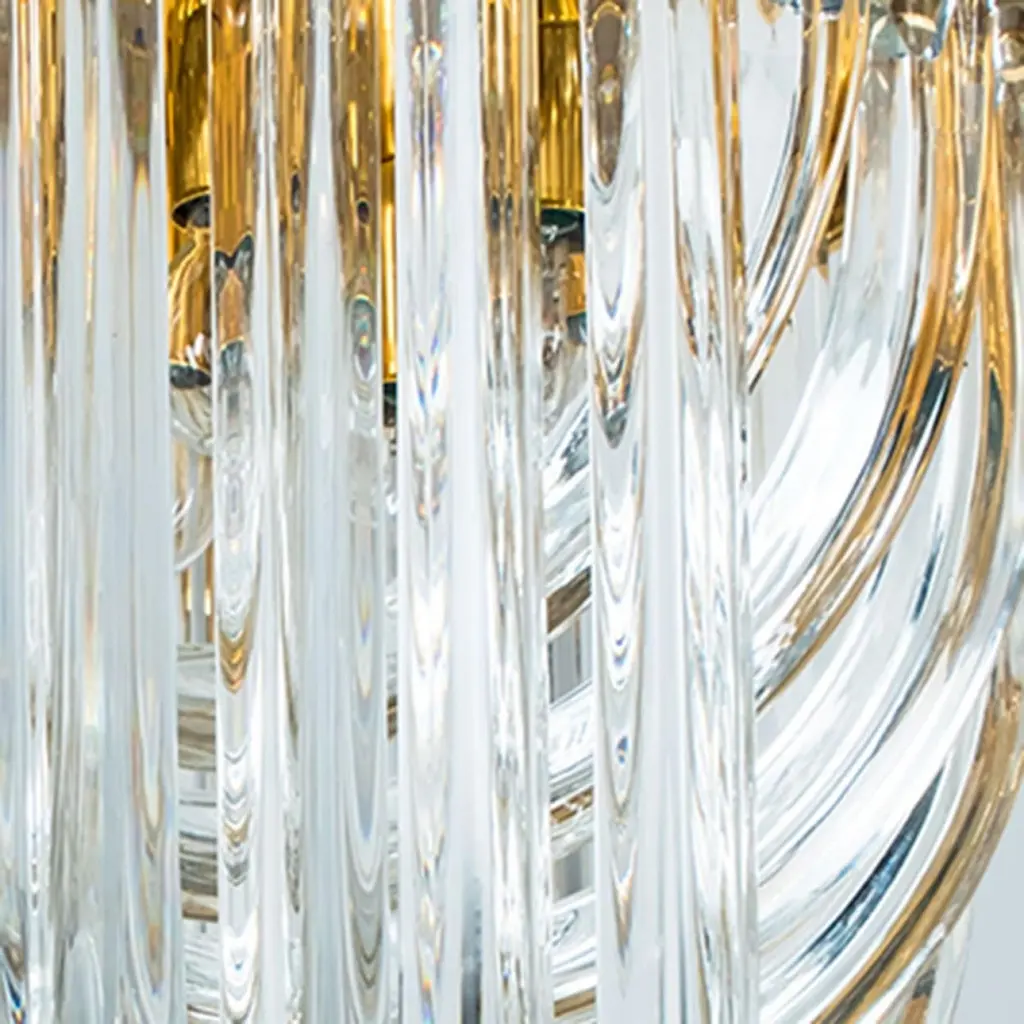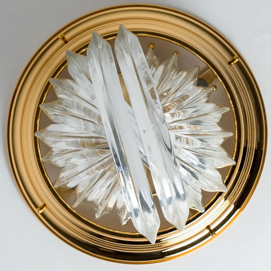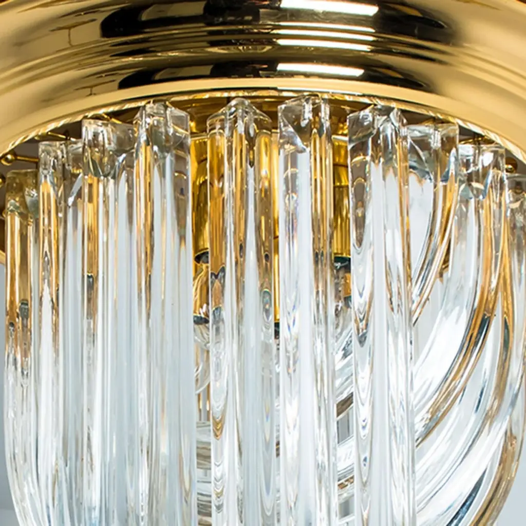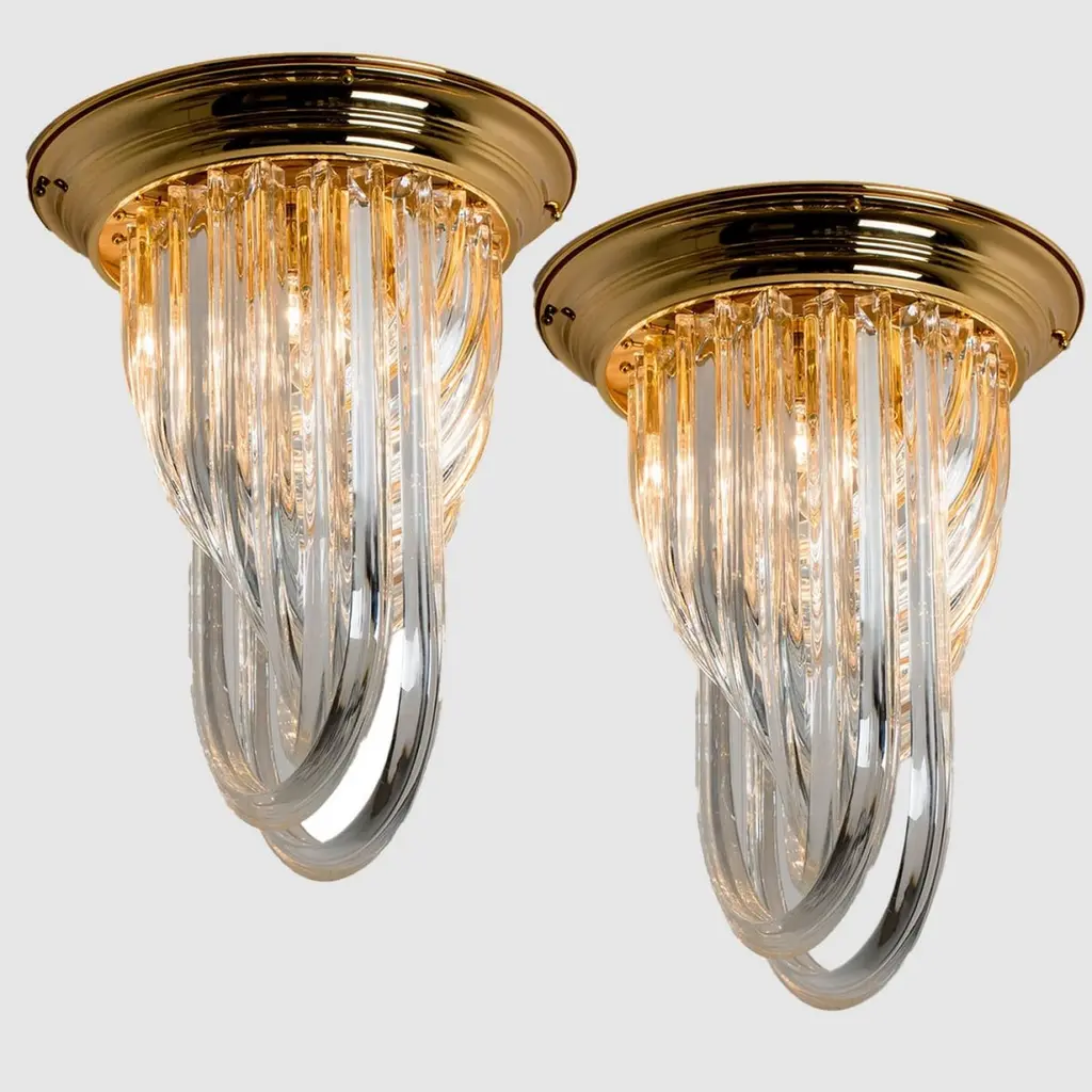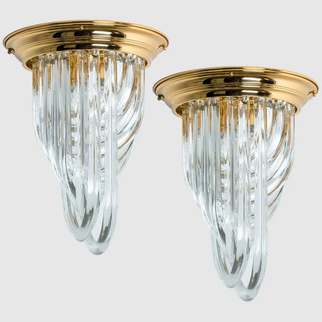 A beautiful and impressive Venini flush mount light, curved crystal glass and gilt brass, Italy.The flush mount is made of curved crystal Murano glasses in different lengths. The flush mount has eight lights with Murano crystal tubes and a gold-plated brass frame. The crystals are cut in such a way that radiate the light of the bulbs in different directions beautiful! The light requires 4x E14 light bulbs.Dimensions:Height: 22,4" (57 cm) Diameter: 16,9" (43 cm).Please notice the price is for one piece, two pieces available.Cleaned and well-wired, in full working order and ready to use. The brass frame is in excellent condition. The large crystal curved crystals, all original and also in excellent condition, screw securely to the frame. This flush mount can be disassembled and the crystals individually wrapped for easy transport.