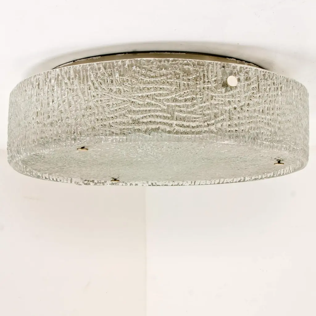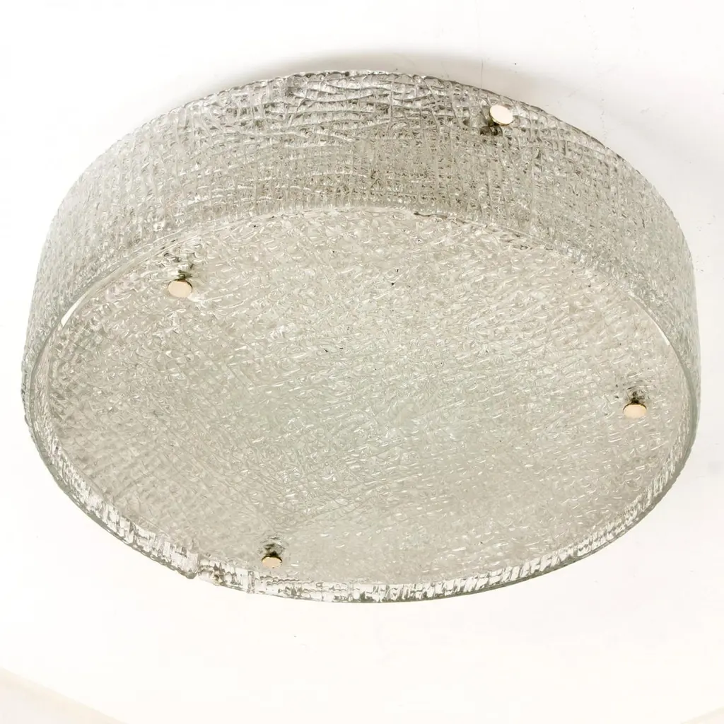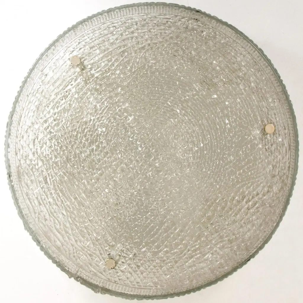 Gorgeous ice glass chandelier on a metal frame manufactured by Kaiser, Germany in the 1960s. The lamp takes three large Edison bulbs. Rare to find in this huge size.Two pieces of thick textured clear glass placed to a frame (white metal) with metal fixings. The main body of the shade is made of a one piece of glass wrapped into a ring, the flat disc has three metal wires running through it. The three metal wires help to protect the big glass shade.Clear design, Evokes the ice glass designs of Finnish designer Tapio Wirkkala.Please notice the price is for 1 piece, 2 pieces available.Perfect condition. This flush mount is in excellent vintage condition.