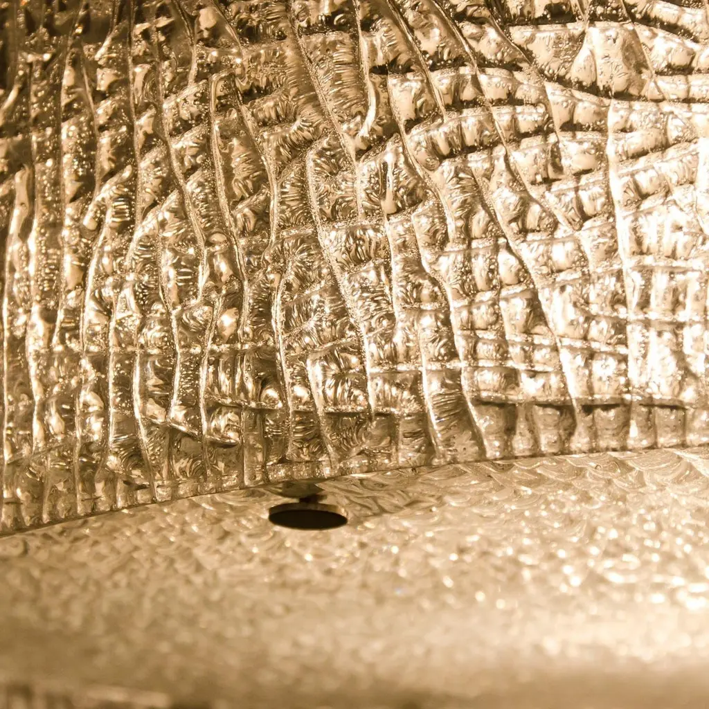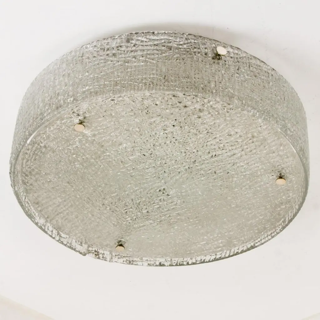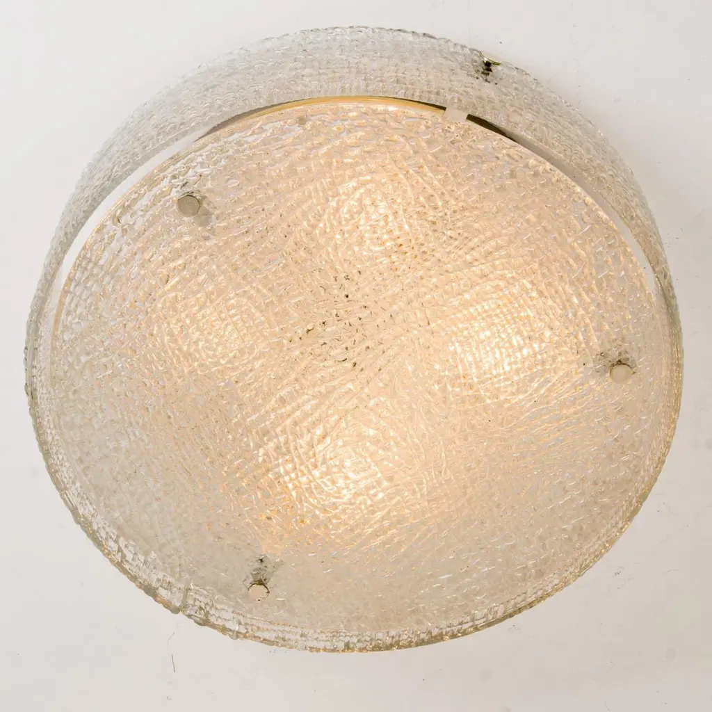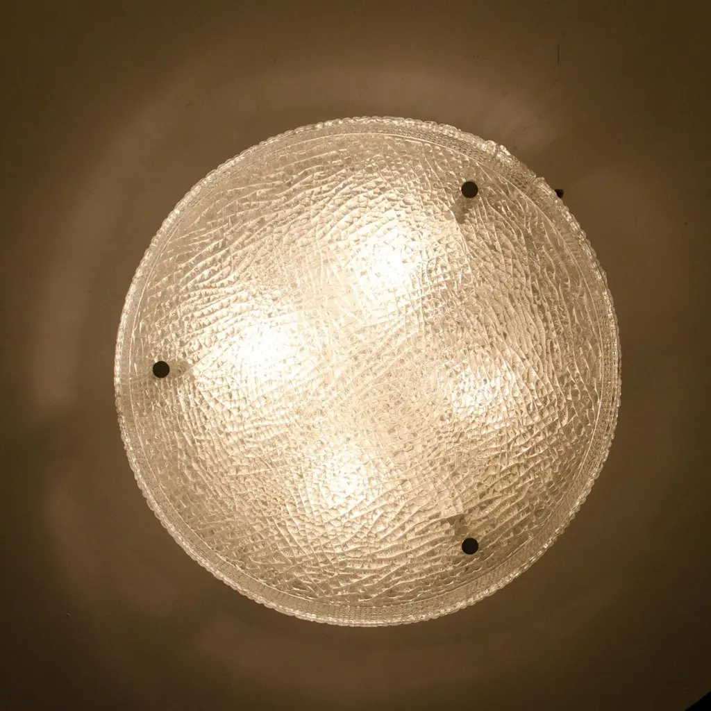 Gorgeous ice glass chandelier on a metal frame manufactured by Kaiser, Germany in the 1960s. The lamp takes three large Edison bulbs. Rare to find in this huge size.Two pieces of thick textured clear glass placed to a frame (white metal) with metal fixings. The main body of the shade is made of a one piece of glass wrapped into a ring, the flat disc has three metal wires running through it. The three metal wires help to protect the big glass shade.Clear design, Evokes the ice glass designs of Finnish designer Tapio Wirkkala.Please notice the price is for 1 piece, 2 pieces available.Perfect condition. This flush mount is in excellent vintage condition.