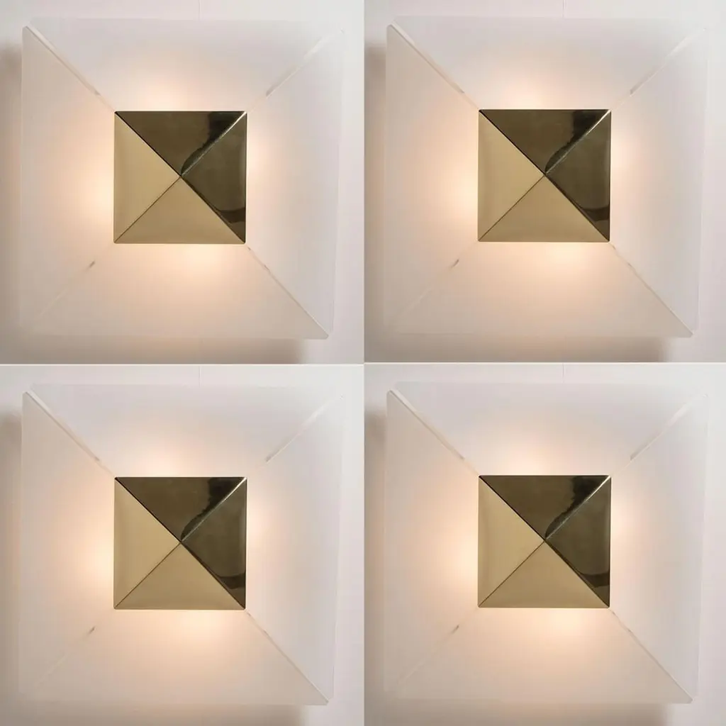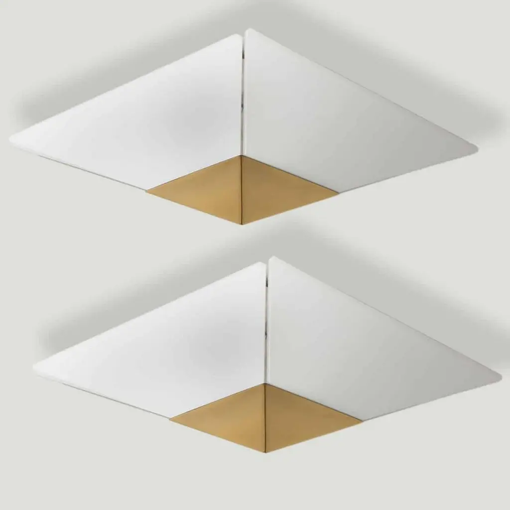 Pyramid shaped flush mount designed and made by luxury manufacturer J.T.Kalmar, 1970.Kalmar is an Austrian company founded in Vienna in 1881. In the beginning they produced chandeliers and cast bronze objects, but by the time the 1930s came they only produced high quality lighting fixtures. And this is what they still do. They always had partnerships with influential organizations, for example the Vienna Secession and more recently RMS Queen Mary 2 in 2003This flus mount is made of brass and milk glass, and is in very good condition.Cleaned and well-wired, in full working order and ready to use. The fixture requires 4 E27 standard bulbs. Also LED compatible.Please notice the price is for one piece, we have several pieces available.