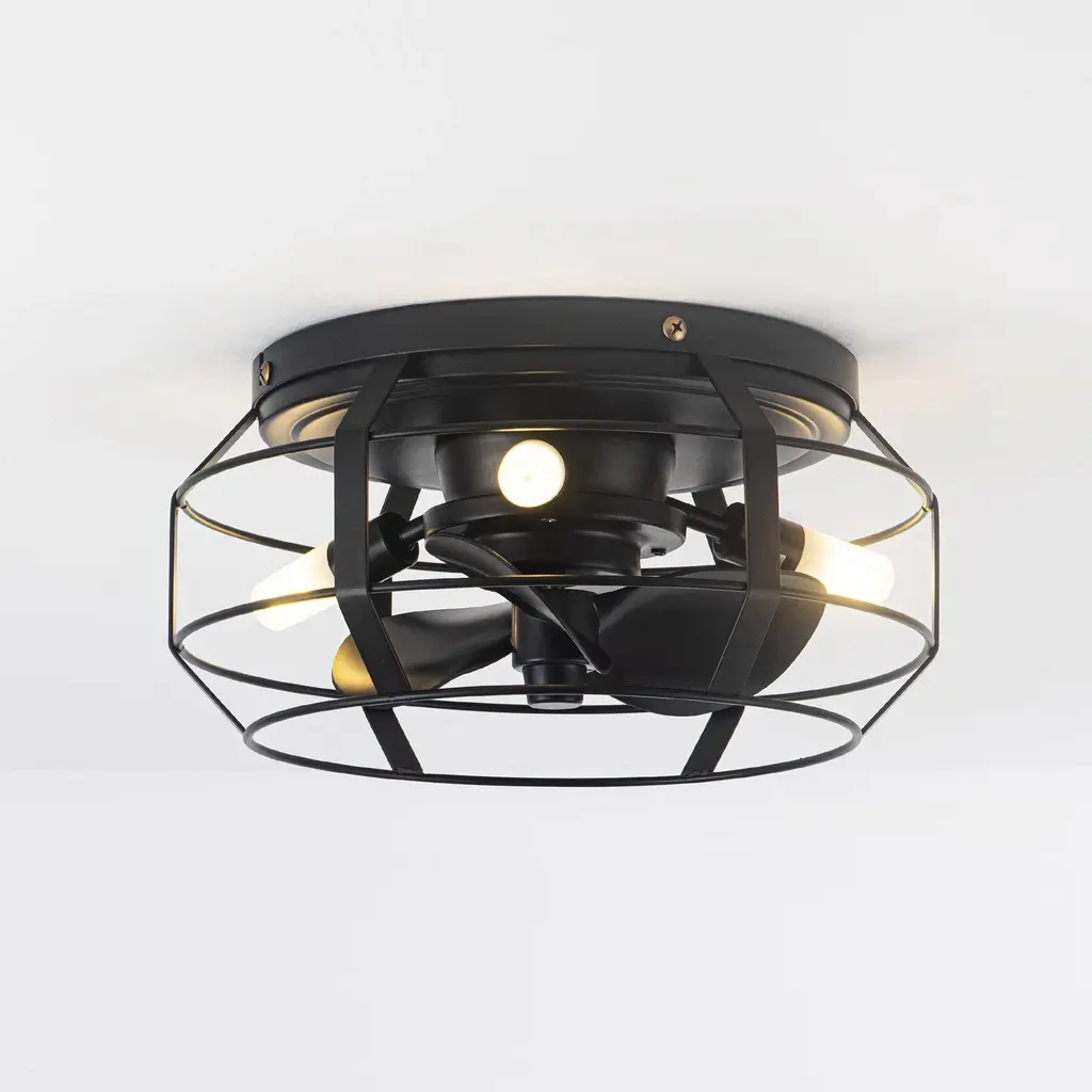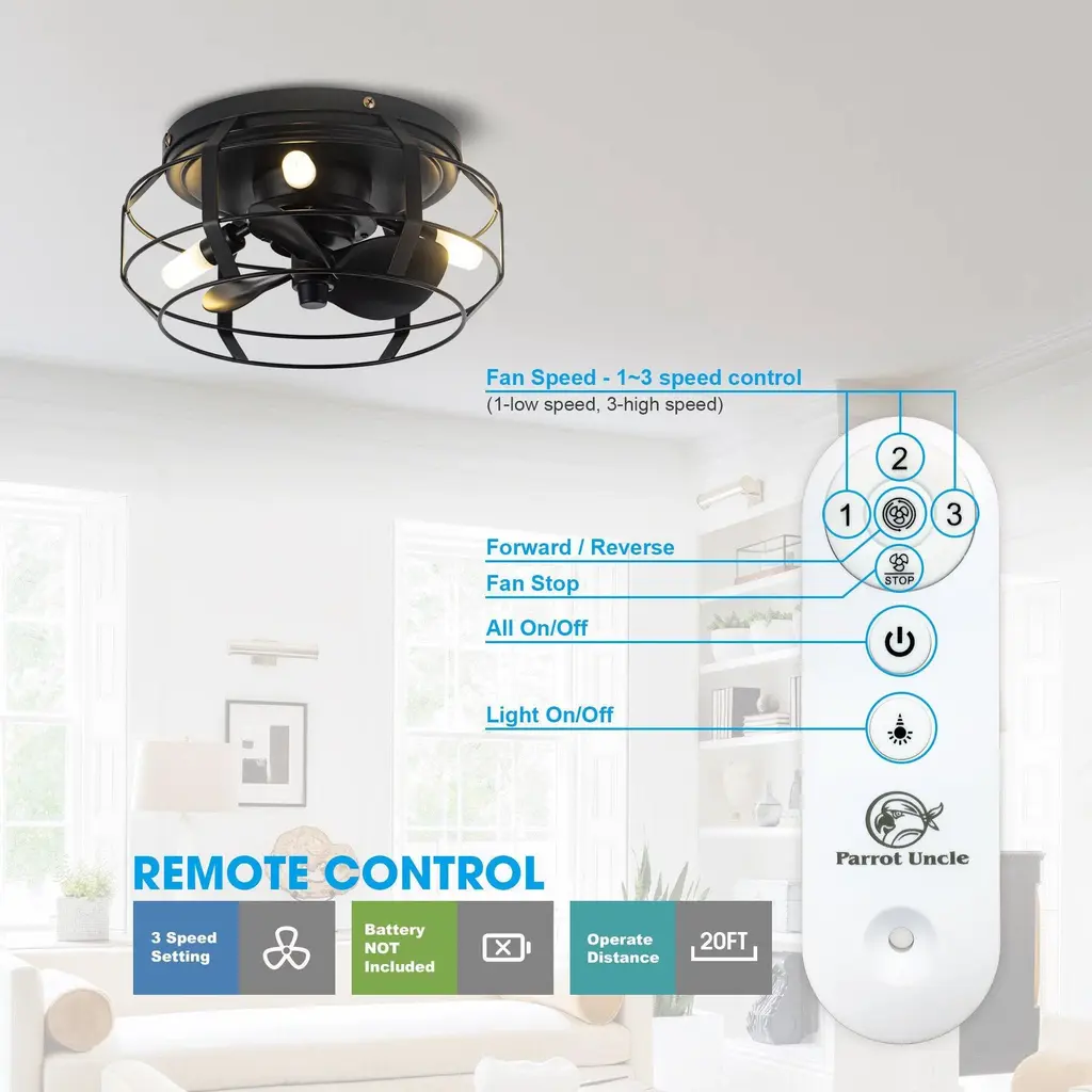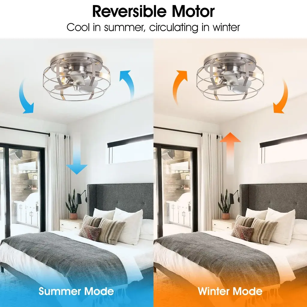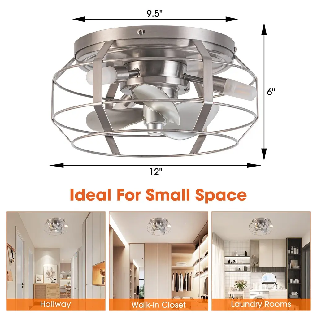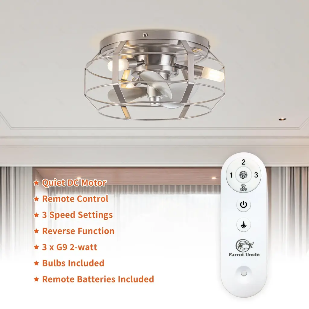 12" Flush Mount Low Profile Caged Small Ceiling Fan With Light And Remote Control - Satin Nickel