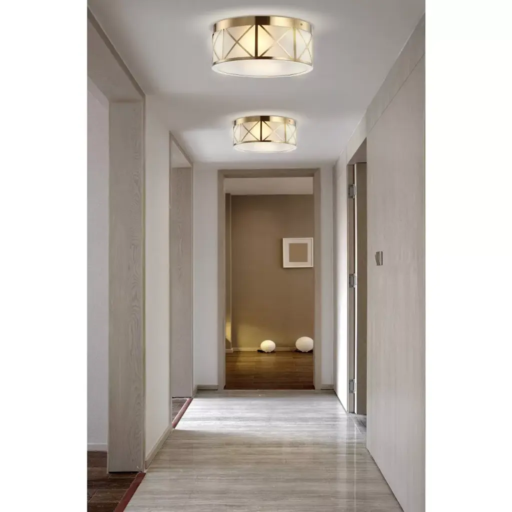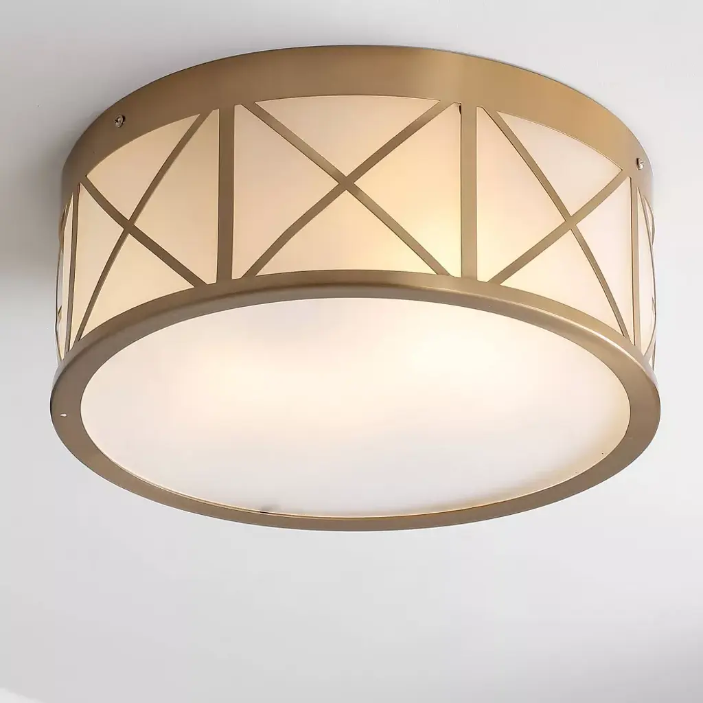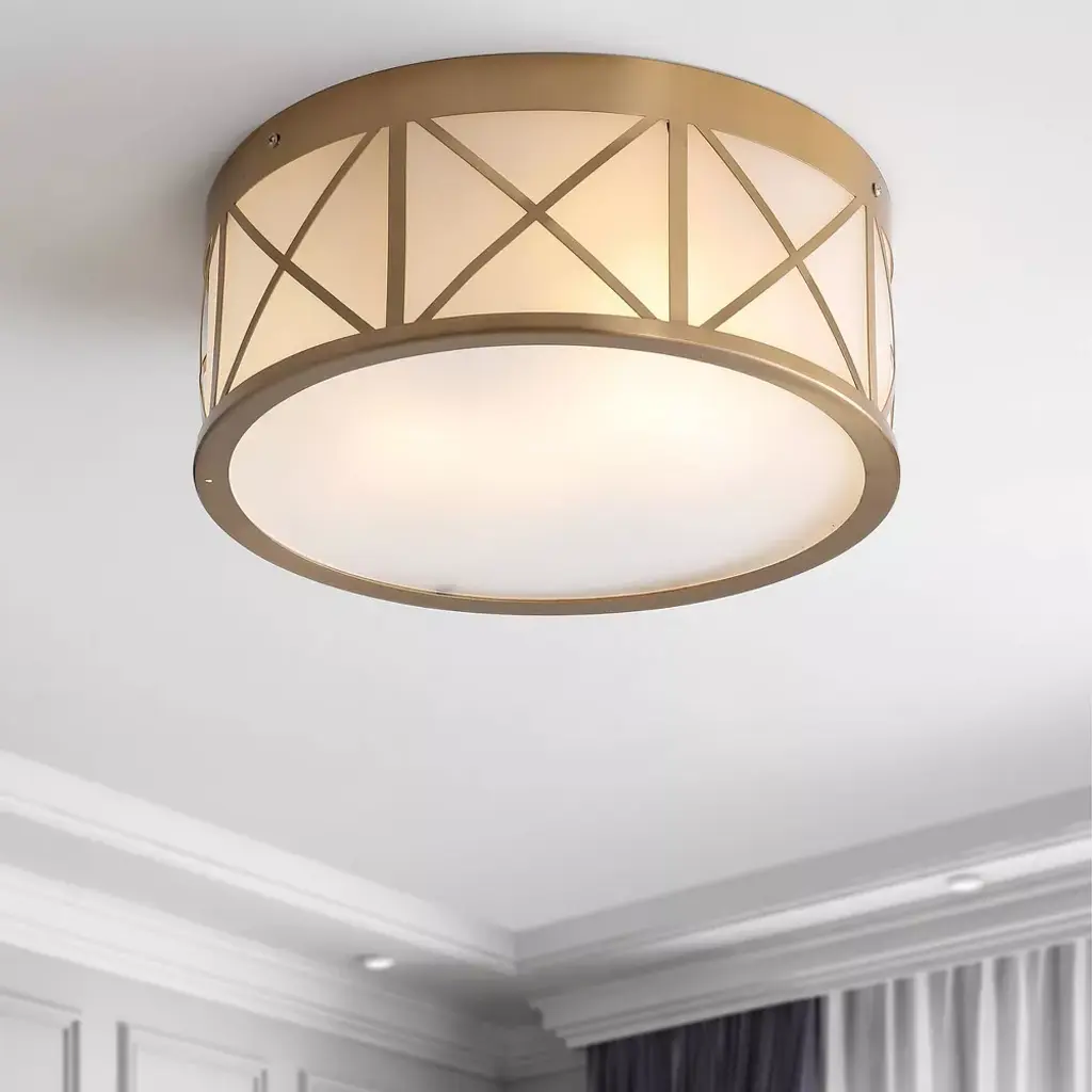 This modern, flush-mount light fixture is perfect for low ceilings. The elegant brass-gold drum shade is accented with stylish X-details all around. Soft white diffuser panels conceal the bright LED light bulbs, creating a polished look for a bedroom, living room, entry or bathroom. Perfect for low ceilings, the 6.5" height fits just about anywhere. The modern gold-brass finish adds an elegant touch. Eco-friendly 9W LED bulb included. Takes 2 bulbs and compatible with any 9W LED or 40W TYPE "A" or 13W CFL. As this fixture must be hardwired, we recommend a professional electrician manage installation. ETL Listed. Before cleaning any lamp shade or fixture, disconnect the power source. Wipe with a soft, dry cloth. Avoid the use of chemicals and household cleaners as they may damage the finish.