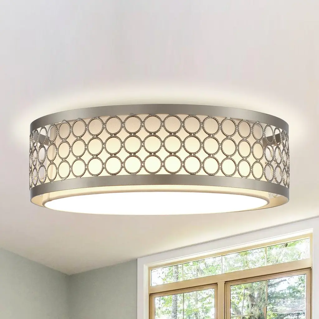 Classic and versatile, this 15-inch ceiling light fixture fits most decor styles and blends perfectly into any space. It has a unique patterned metal frame and a fabric shade, perfect for minimalist, modern decor. The 23W ceiling light has no flickering, glare, or humming when turned on, effectively protecting the eyes of you and your family and reducing eye fatigue. At the same time, the lighting creates a warm and inviting atmosphere for your home. Ideal for use in kitchens, bedrooms, hallways, porches, and more.