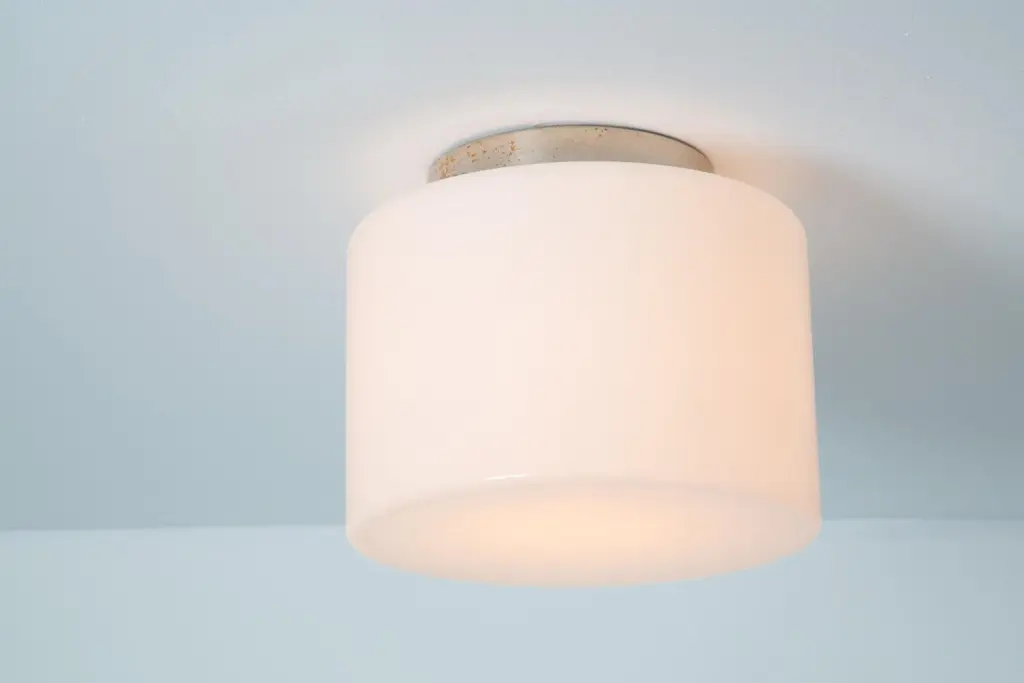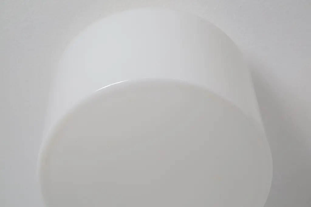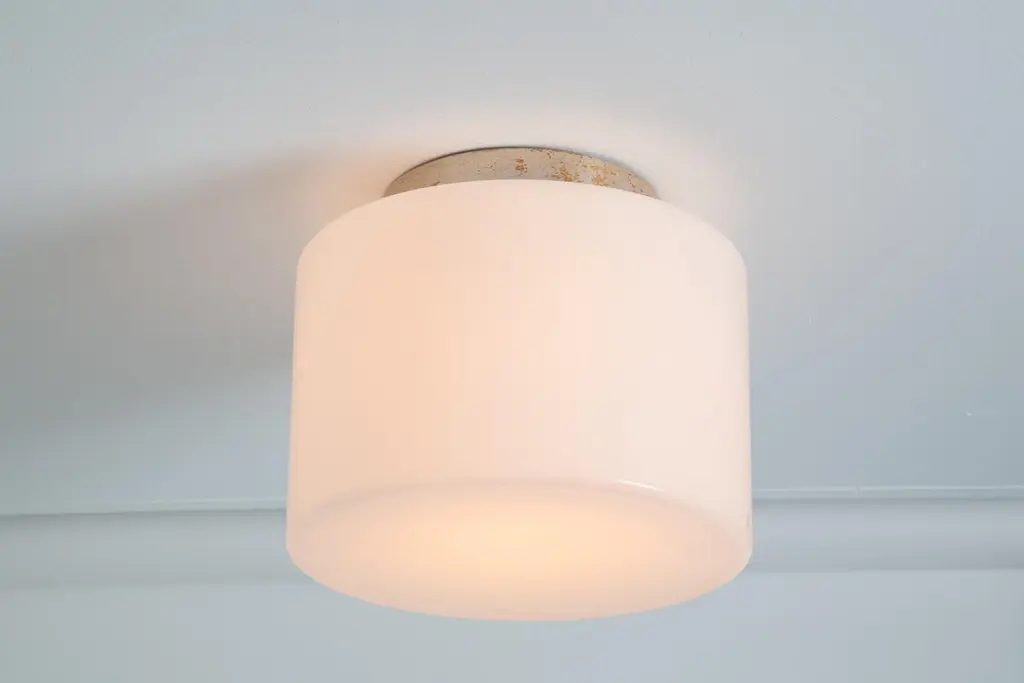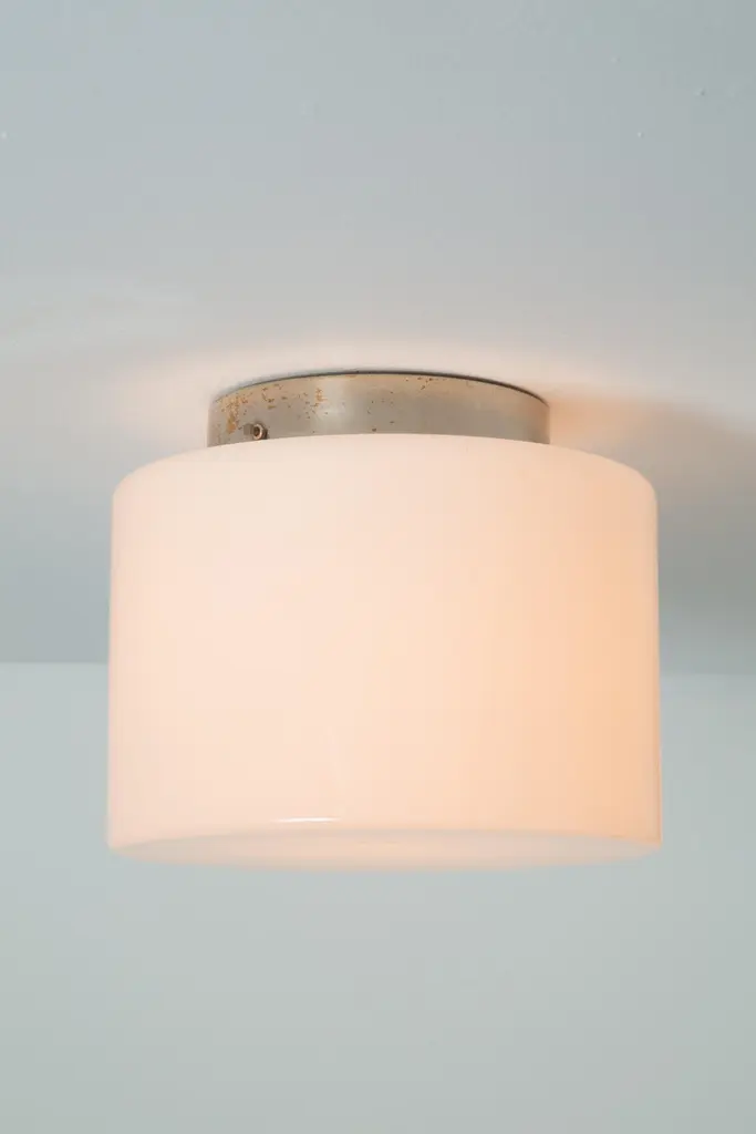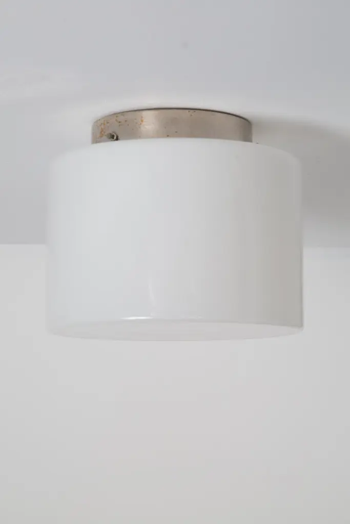 1940s Paavo Tynell Model #2028 glass & metal flush mount for Taito Oy. This rare and exceptional flush mount is executed in white opaline glass and metal. Manufactured by Taito in the late 1940s, this is a fine unsigned example of a Tynell's iconic refinement. Price is per item. Two lamps available.Literature: Ref. Literature Idman Catalog 1937-38, p.37.Rewired for US electrical. Accommodates 1 x 75w LED equivalent medium base bulb. Some patination, scuffs and dings as largely shown in the photos and noted only for accuracy. Glass is clean and free of cracks. Not UL listed, but recommended UL listing possible from authorized 3rd party vendor upon request. Please note only one representative lamp shown in the listings. Some variation between lamps, but both overall in comparably good condition as noted. Additional images available upon request.