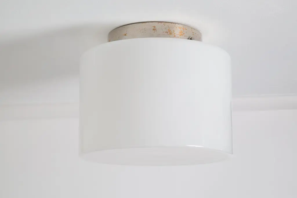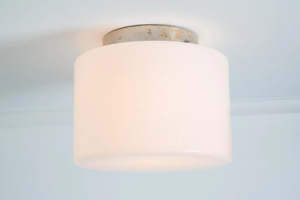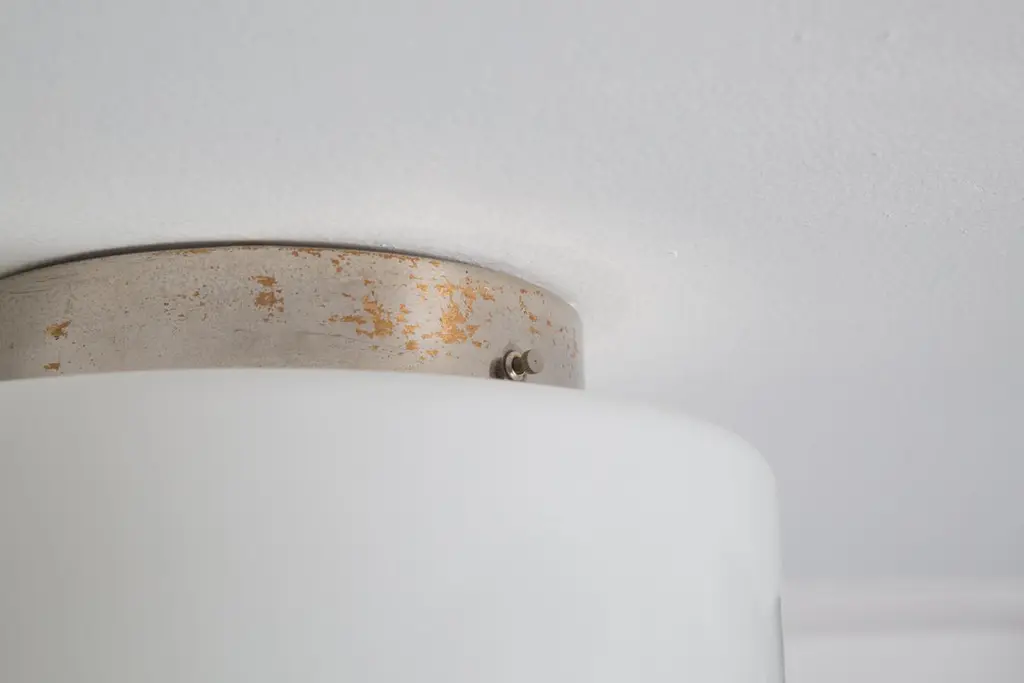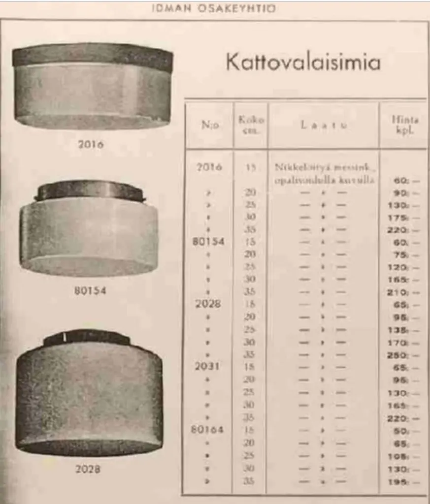 1940s Paavo Tynell Model #2028 glass & metal flush mount for Taito Oy. This rare and exceptional flush mount is executed in white opaline glass and metal. Manufactured by Taito in the late 1940s, this is a fine unsigned example of a Tynell's iconic refinement. Price is per item. Two lamps available.Literature: Ref. Literature Idman Catalog 1937-38, p.37.Rewired for US electrical. Accommodates 1 x 75w LED equivalent medium base bulb. Some patination, scuffs and dings as largely shown in the photos and noted only for accuracy. Glass is clean and free of cracks. Not UL listed, but recommended UL listing possible from authorized 3rd party vendor upon request. Please note only one representative lamp shown in the listings. Some variation between lamps, but both overall in comparably good condition as noted. Additional images available upon request.