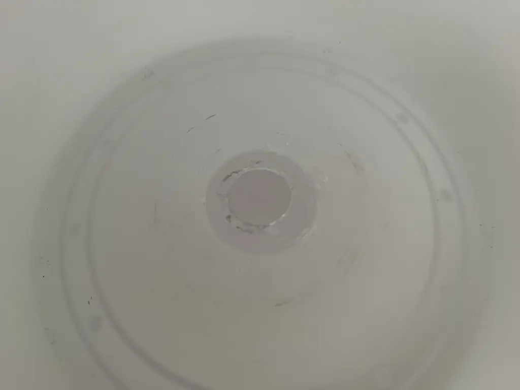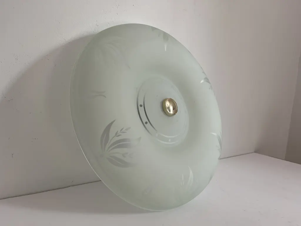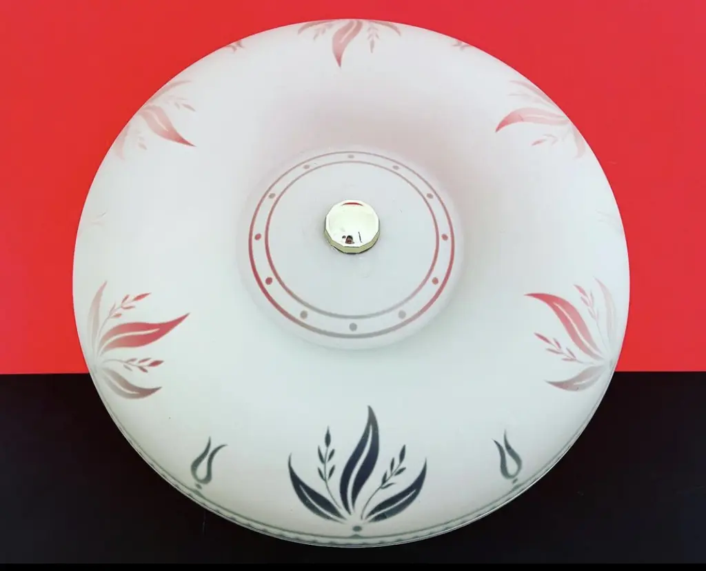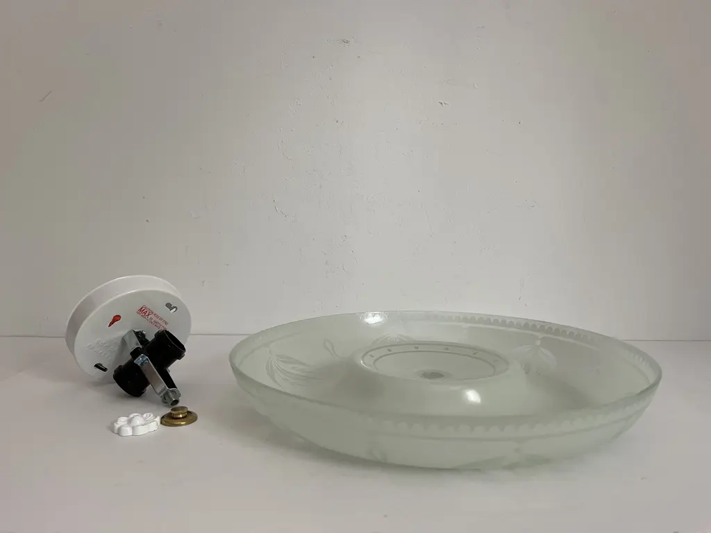 Large 1950s frosted inverted glass flush mount light featuring a transparent foliate design surrounding a geometric center with scalloped border and two lights. New wiring and new sockets for standard bulbs. Comes ready to install with white metal mounting plate, hardware and ceiling cap options pictured. Light patina, scratches.