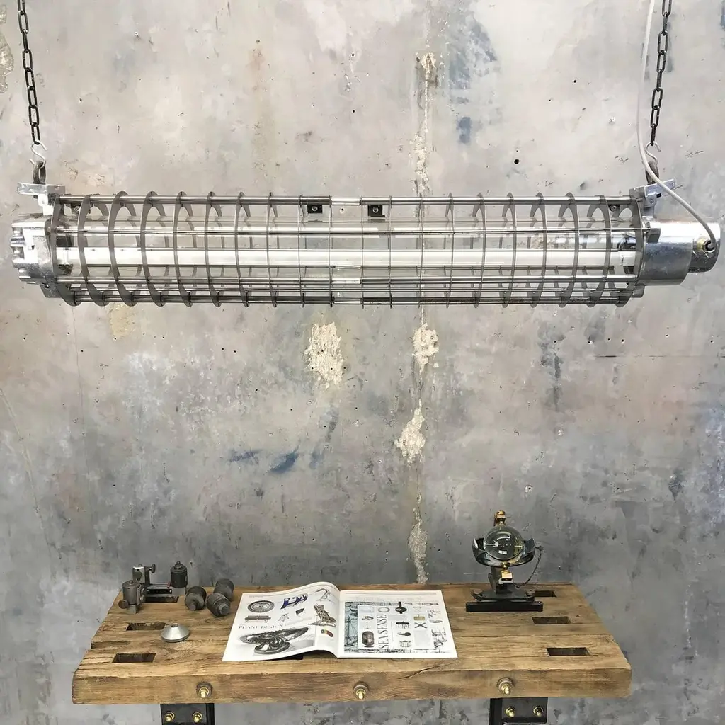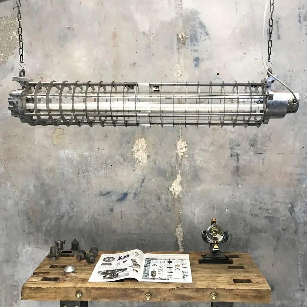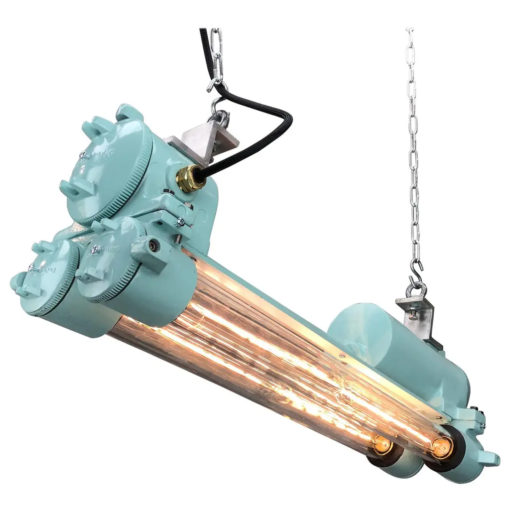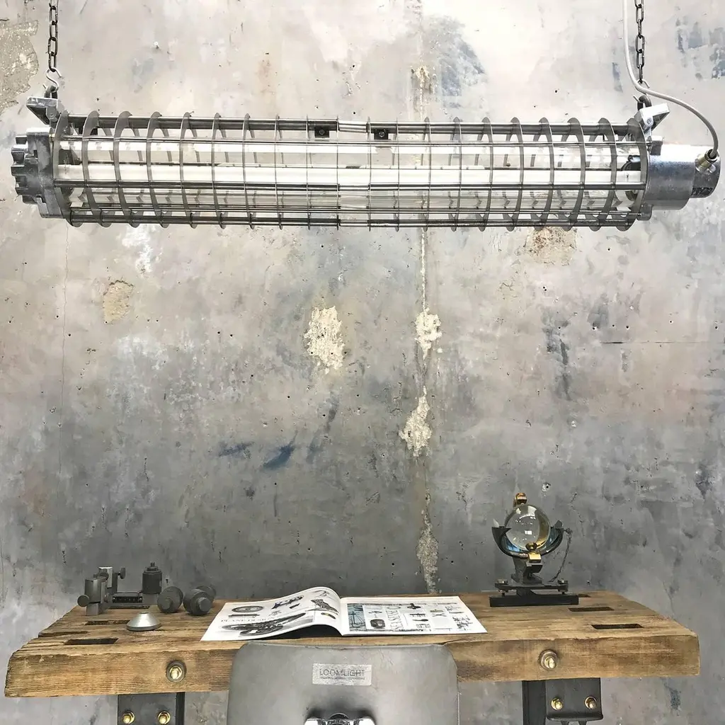 German flame proof strip light with shades / glass guard.An extremely substantial statement piece modified by our team and ready to install commercially or at home.These lights are a real example of vintage Industrial lighting that you just don't see these days, in fact it would have been impossible to buy these back when they where manufactured for Nato vessels and hazardous environments.Original item salvaged from supertankers and military vessels then stripped and refinished in the UK.The original wiring is replaced with our Loomlight wiring system which exceeds the original specification and also conforms to British standards.All of our tube lights are supplied with a 12 month warranty as standard.The main body is cast aluminium and the tube is formed from glass which is appx 1/2 inch thick and is also flame proof. There are serial numbers and makers marks throughout.The two brackets on the top are where you would connect the chain, installation would require two ceiling hooks, or it can be wall-mounted, they look great when mounted vertically and the IP55 rating makes them suitable for bathrooms, kitchens wet zones etc.These lights work really well above pool / Snooker tables, kitchen islands, breakfast bars, dining tables etc and a great centre piece for retail environments and restaurants etc and can also be surface / flush mounted.Measures: Height 23 cm Width 17 cm Length 145 cm Voltage 110v - 220v Wattage - 36w. (USA voltage compatible).Weight 15 kg.