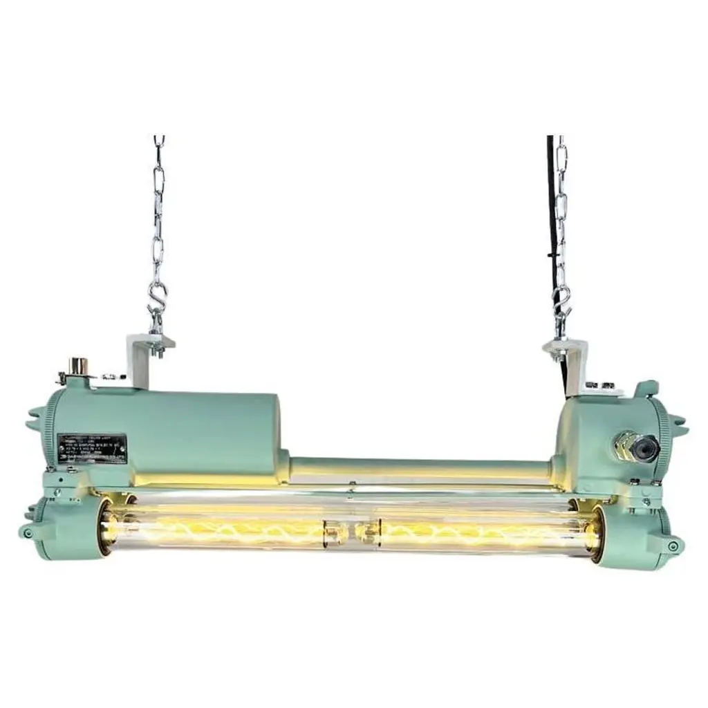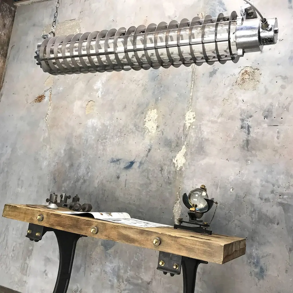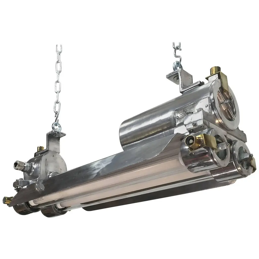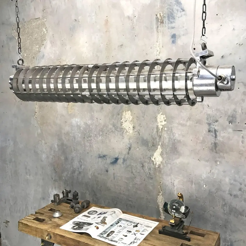 German flame proof strip light with shades / glass guard.An extremely substantial statement piece modified by our team and ready to install commercially or at home.These lights are a real example of vintage Industrial lighting that you just don't see these days, in fact it would have been impossible to buy these back when they where manufactured for Nato vessels and hazardous environments.Original item salvaged from supertankers and military vessels then stripped and refinished in the UK.The original wiring is replaced with our Loomlight wiring system which exceeds the original specification and also conforms to British standards.All of our tube lights are supplied with a 12 month warranty as standard.The main body is cast aluminium and the tube is formed from glass which is appx 1/2 inch thick and is also flame proof. There are serial numbers and makers marks throughout.The two brackets on the top are where you would connect the chain, installation would require two ceiling hooks, or it can be wall-mounted, they look great when mounted vertically and the IP55 rating makes them suitable for bathrooms, kitchens wet zones etc.These lights work really well above pool / Snooker tables, kitchen islands, breakfast bars, dining tables etc and a great centre piece for retail environments and restaurants etc and can also be surface / flush mounted.Measures: Height 23 cm Width 17 cm Length 145 cm Voltage 110v - 220v Wattage - 36w. (USA voltage compatible).Weight 15 kg.