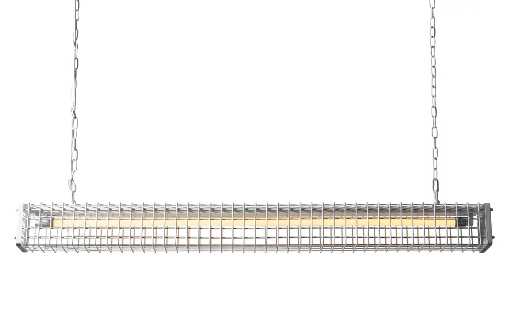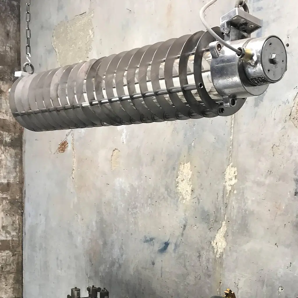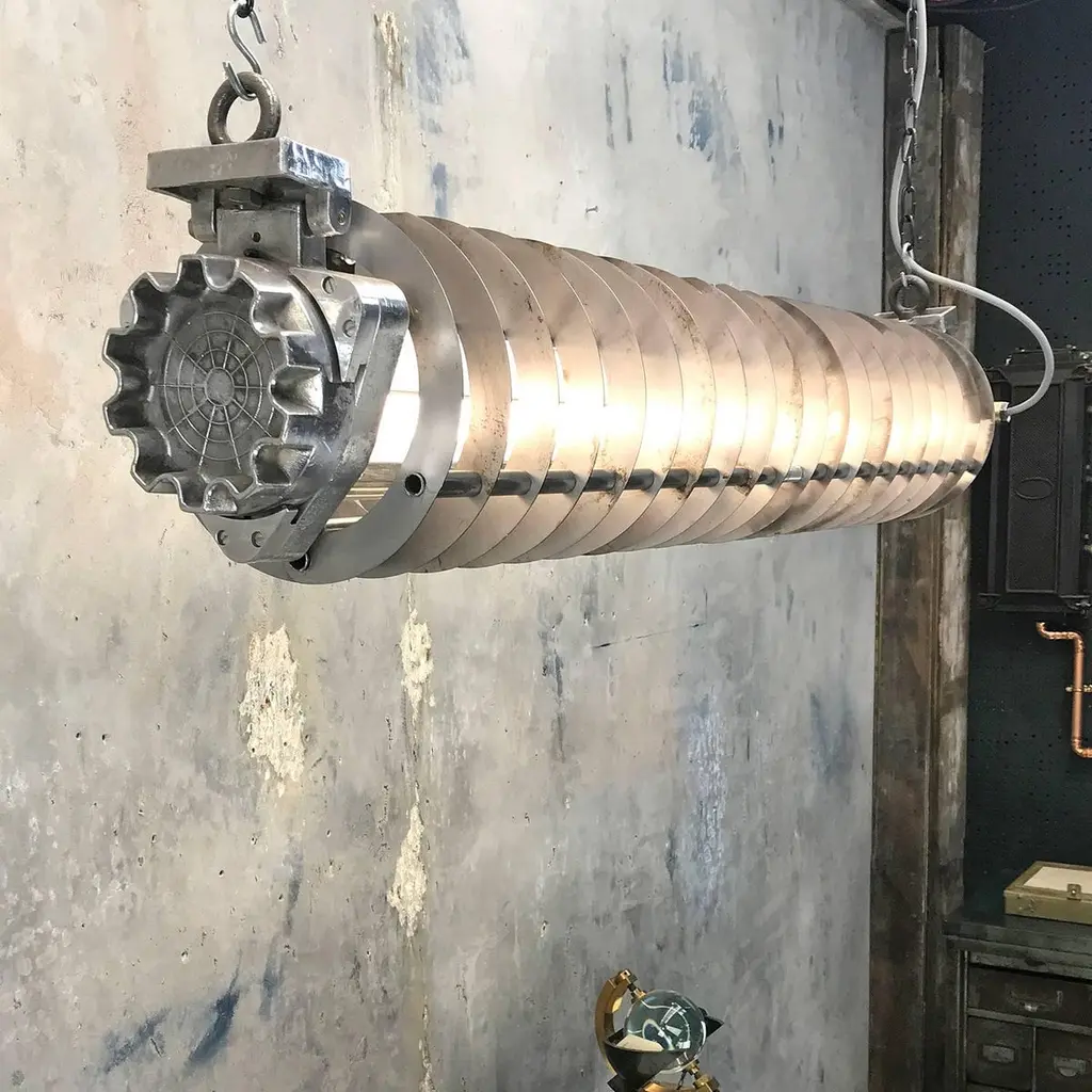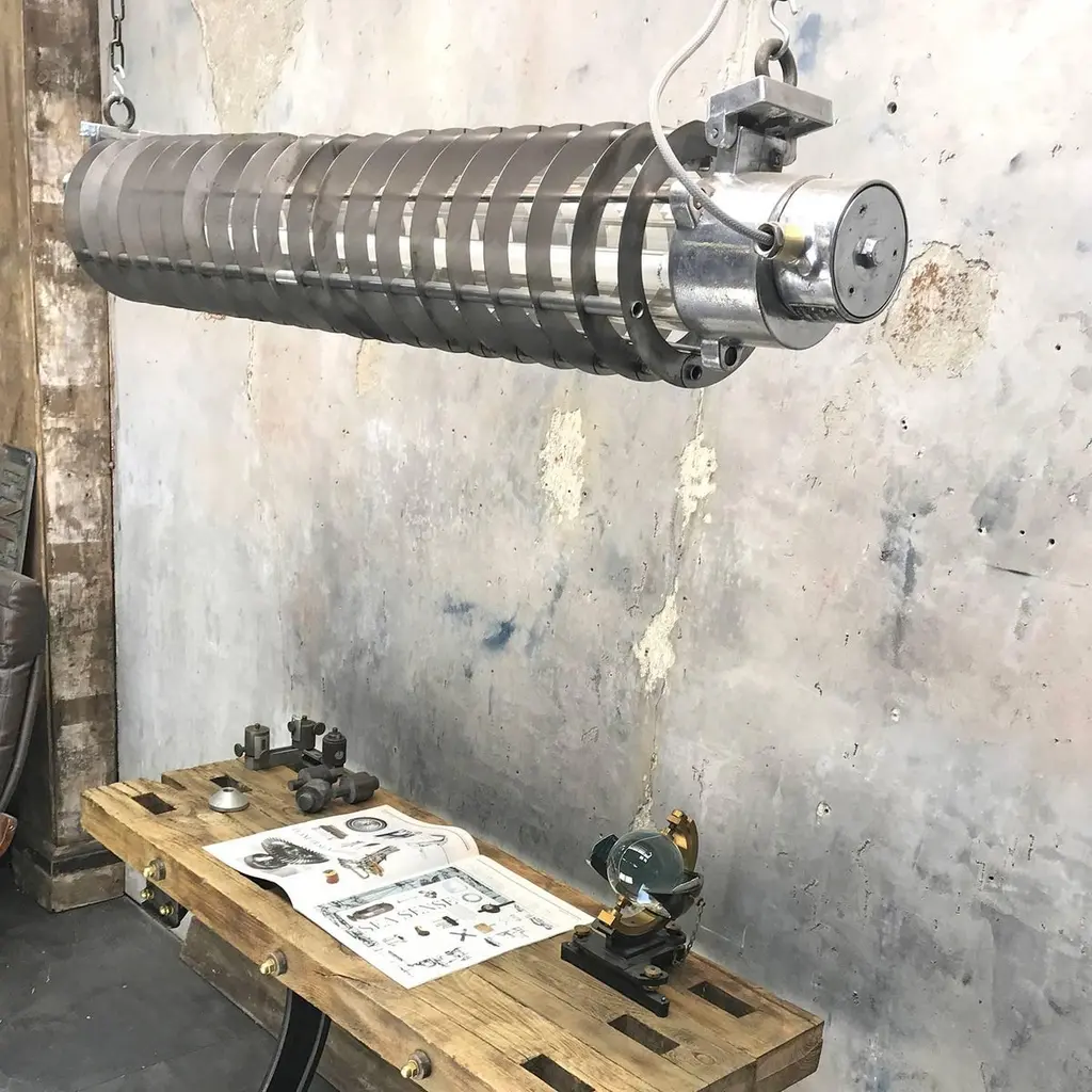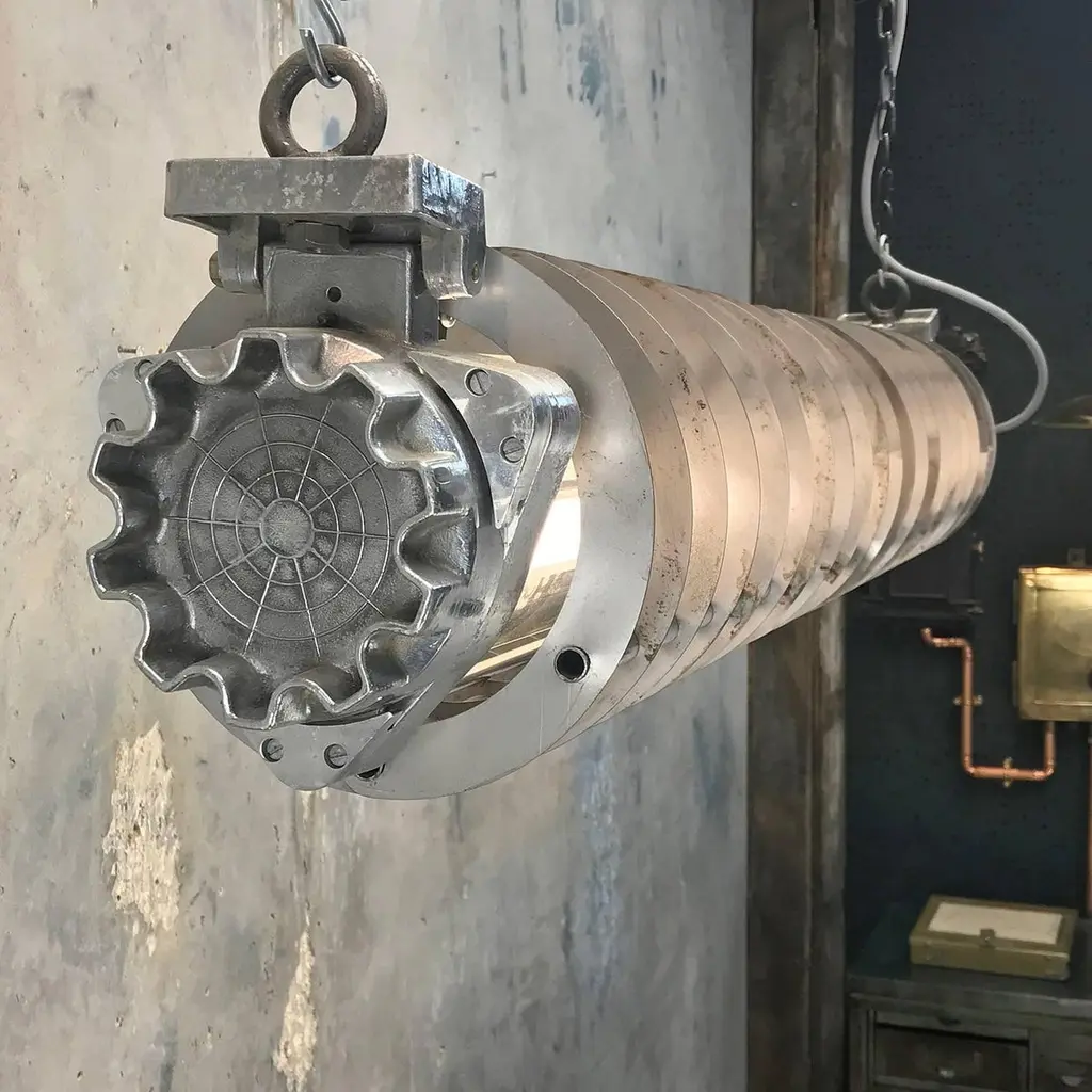 German flame proof strip light with shades / glass guard.An extremely substantial statement piece modified by our team and ready to install commercially or at home.These lights are a real example of vintage Industrial lighting that you just don't see these days, in fact it would have been impossible to buy these back when they where manufactured for Nato vessels and hazardous environments.Original item salvaged from supertankers and military vessels then stripped and refinished in the UK.The original wiring is replaced with our Loomlight wiring system which exceeds the original specification and also conforms to British standards.All of our tube lights are supplied with a 12 month warranty as standard.The main body is cast aluminium and the tube is formed from glass which is appx 1/2 inch thick and is also flame proof. There are serial numbers and makers marks throughout.The two brackets on the top are where you would connect the chain, installation would require two ceiling hooks, or it can be wall-mounted, they look great when mounted vertically and the IP55 rating makes them suitable for bathrooms, kitchens wet zones etc.These lights work really well above pool / Snooker tables, kitchen islands, breakfast bars, dining tables etc and a great centre piece for retail environments and restaurants etc and can also be surface / flush mounted.Measures: Height 23 cm Width 17 cm Length 145 cm Voltage 110v - 220v Wattage - 36w. (USA voltage compatible).Weight 15 kg.