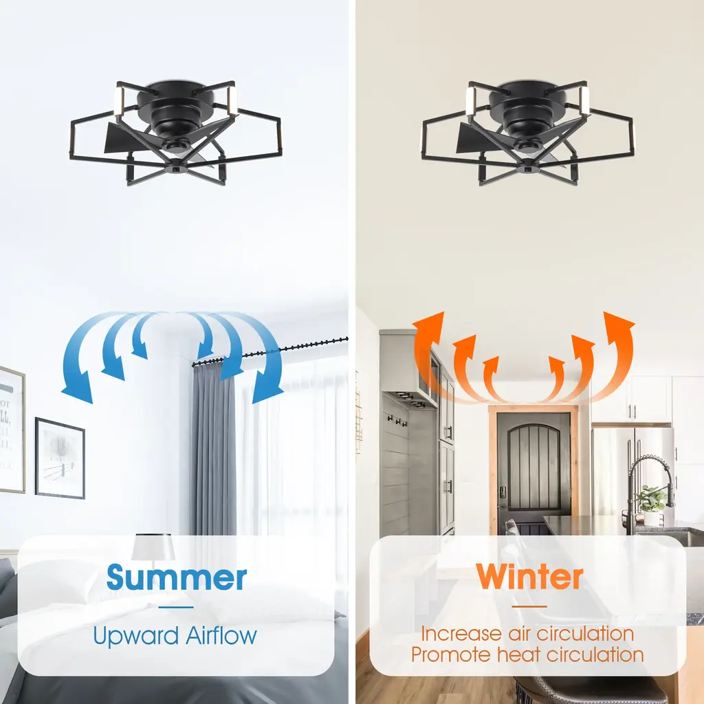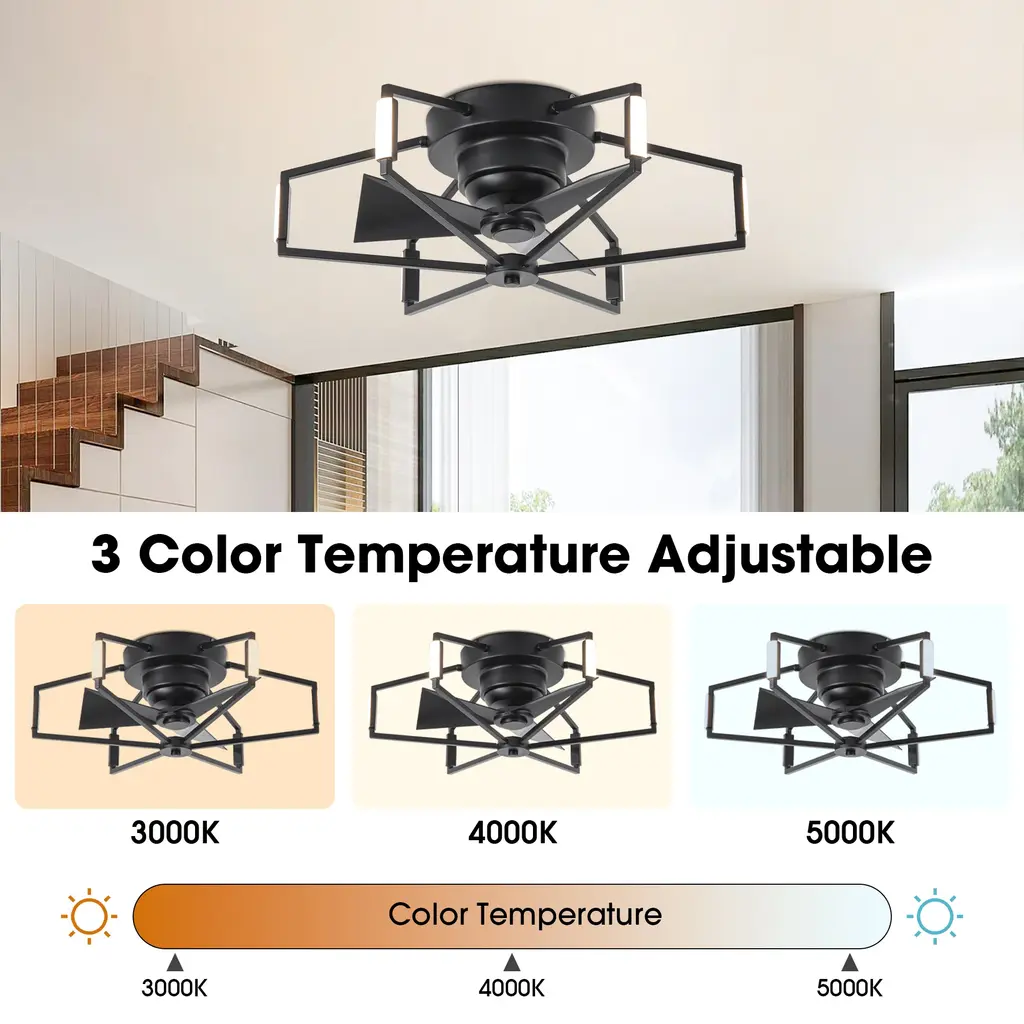 Combining industrial elegance with modern efficiency, this ceiling fan offers a seamless blend of style and function for compact spaces.【Integrated Dimmable LED Light】: Features 15W LED side lighting (1800LM), offering stepless dimming and 3000K/4000K/5000K color temperatures.【Efficient & Quiet DC Motor】: Powerful 1095 CFM airflow at only 17W (64 CFM/W), operating quietly at 37dB with a reversible 6-speed DC motor.【Convenient Remote】: Includes remote (GA054-F3010) for adjusting fan speeds, light settings, timer, and memory functions.【Flush Mount & Warranty】: Easy flush ceiling installation, backed by a 5-year motor warranty and 2-year lighting/controller warranty.
