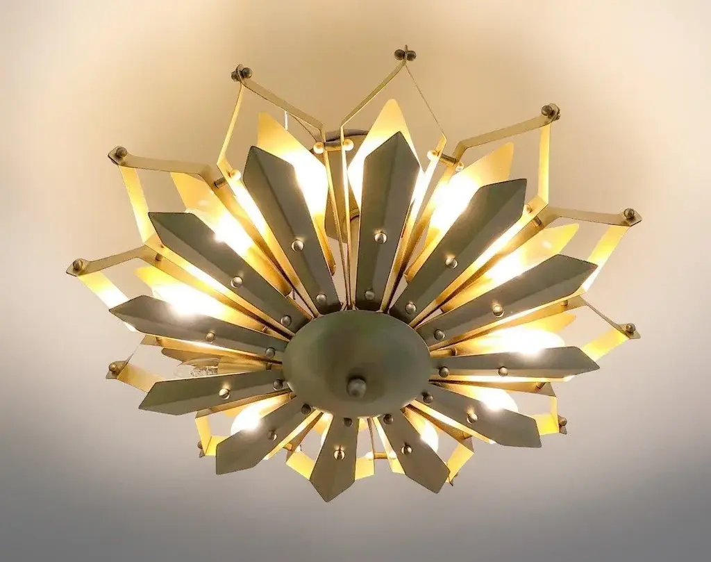 Elegant Italian flush mount with satin brass frame handcrafted to resemble a convex dahlia flower, designed by Fabio Bergomi for Fabio Ltd / made in Italy 12 lights / E12 or E14 type / max 40W each Measures: diameter 24 inches / height 14 inches