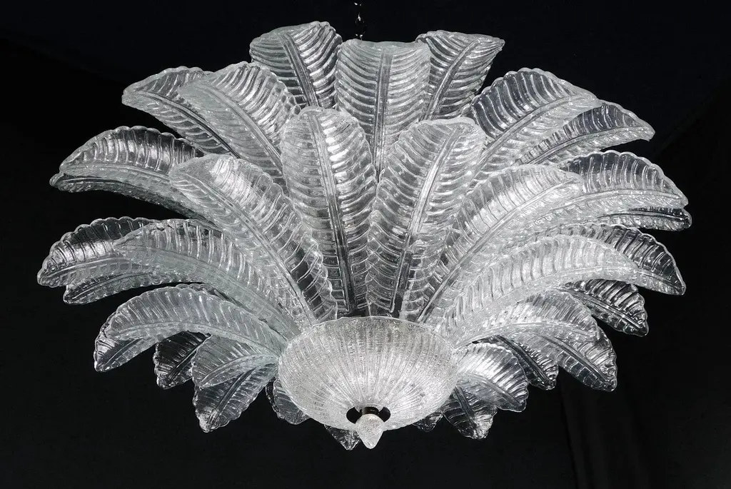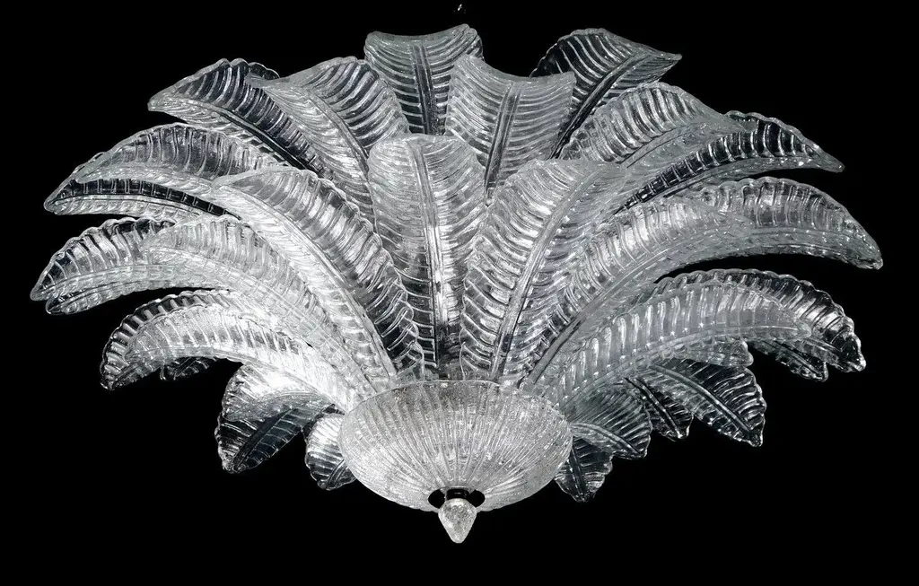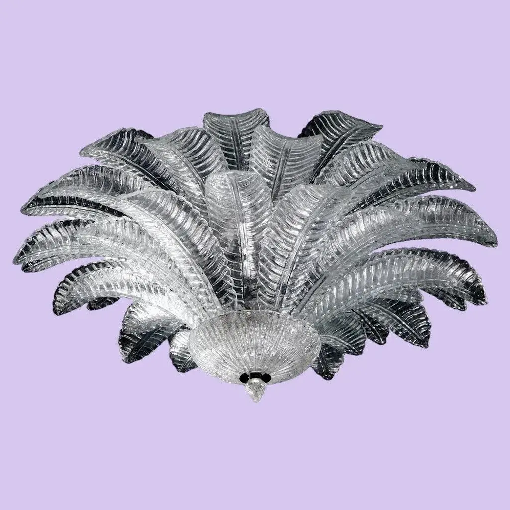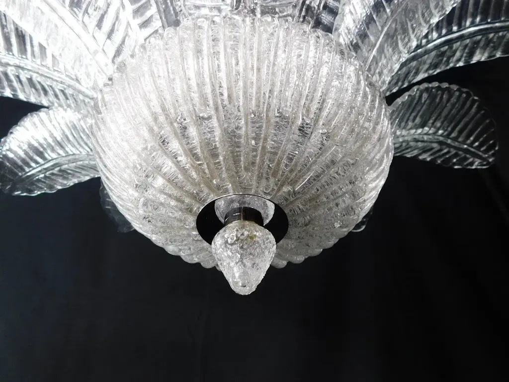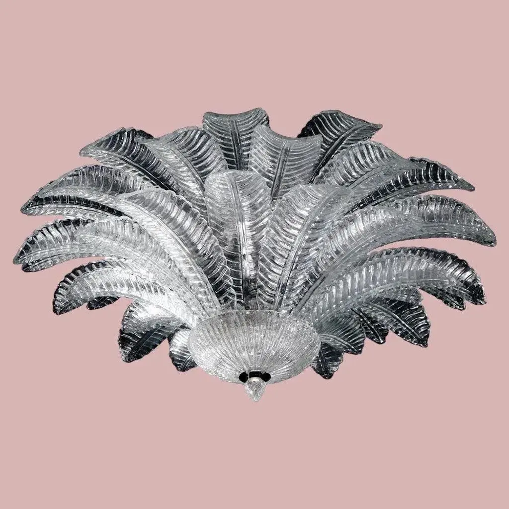 Italian flush mount with clear hand blown Murano Felci fern glass leaves in the style of Barovier, mounted on chrome finish metal frame by Fabio Ltd / Made in Italy 9 lights / E26 or E27 type / max 60W each Measures: Diameter 39.5 inches, height 18 inches