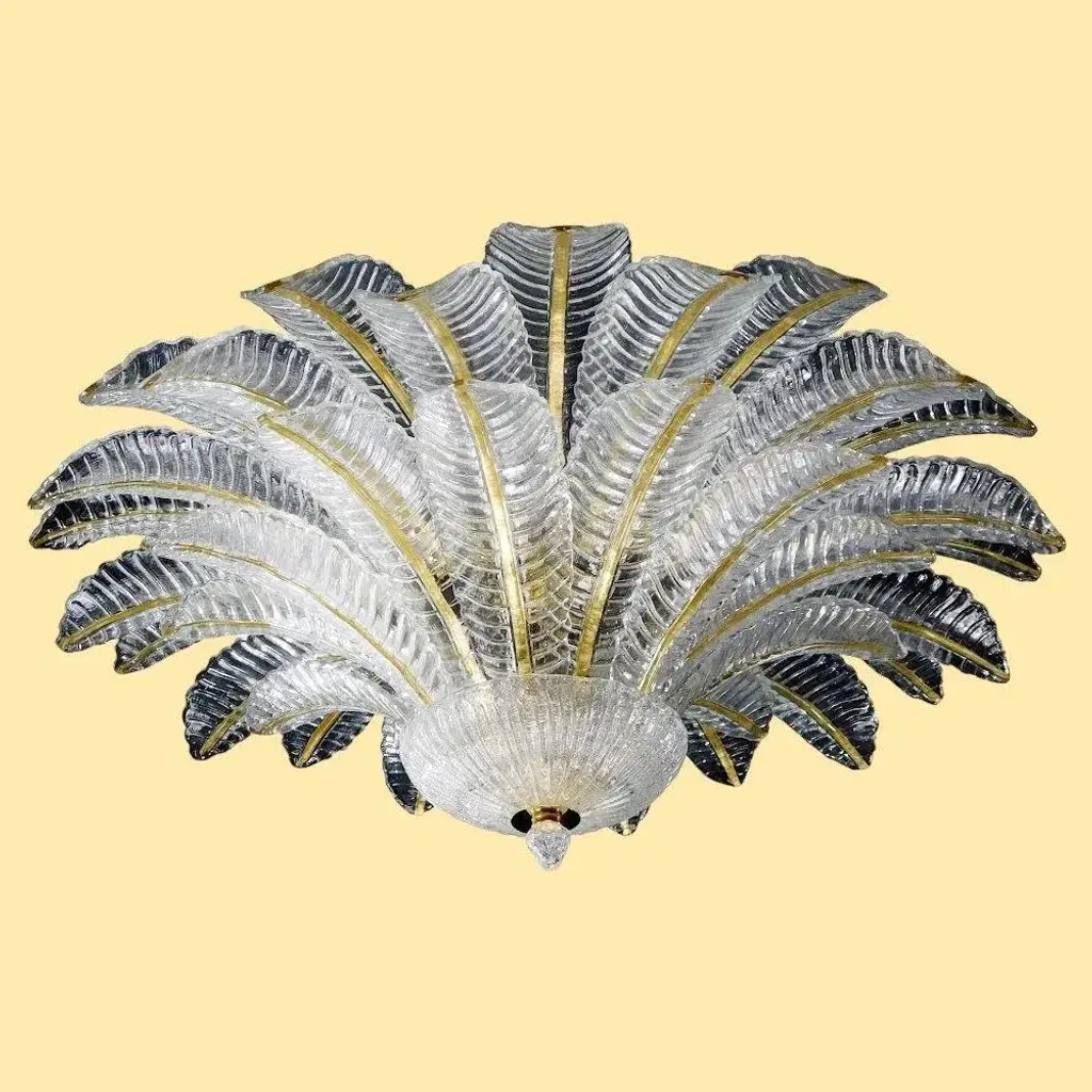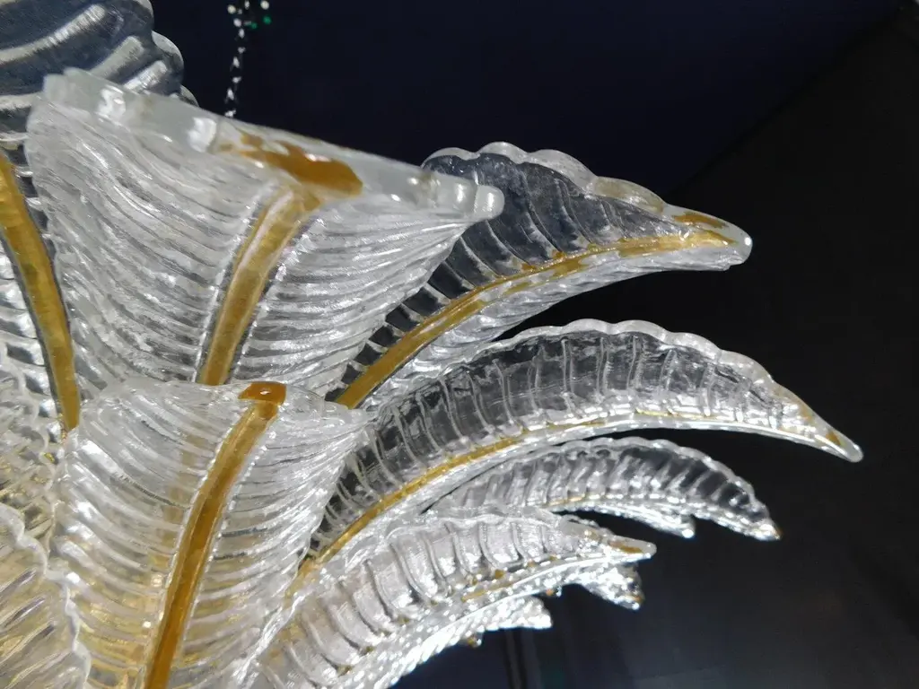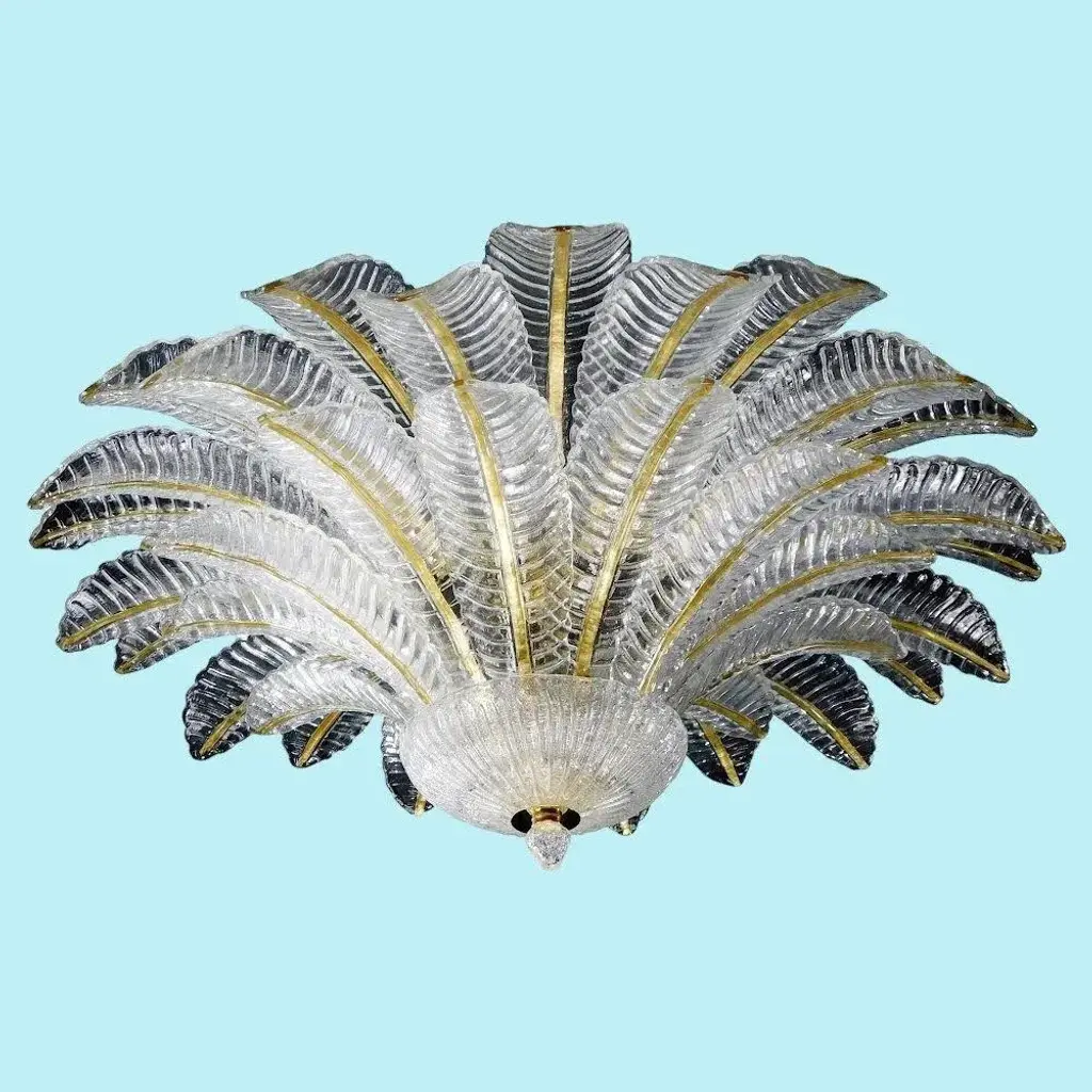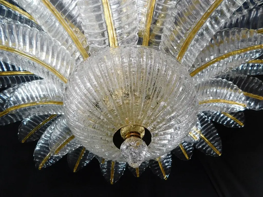 Italian flush mount with clear hand blown Murano Felci fern glass leaves infused with gold in the style of Barovier, mounted on 24 k gold finish metal frame by Fabio Ltd / Made in Italy 9 lights / E26 or E27 type / max 60W each Measures: Diameter 39.5 inches, height 18 inches