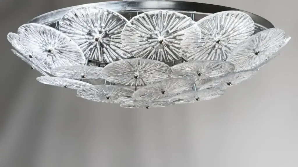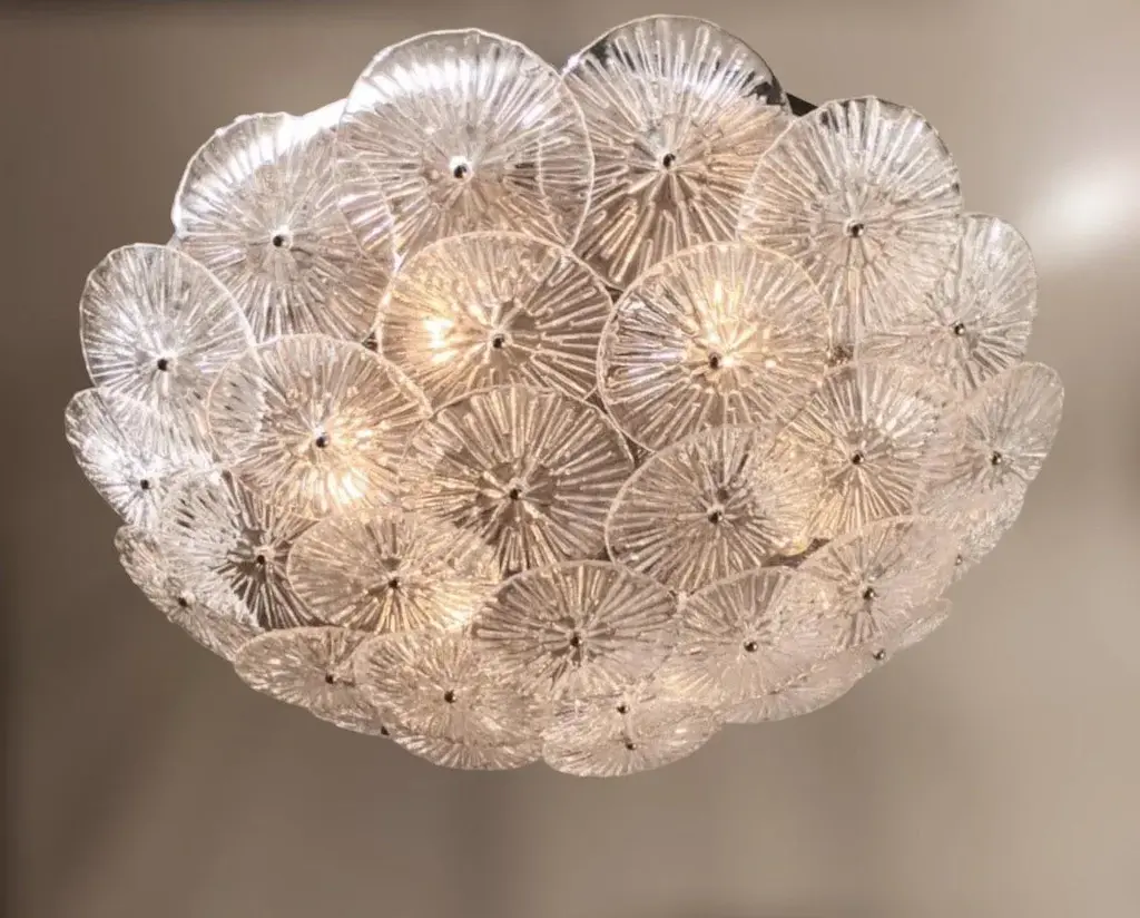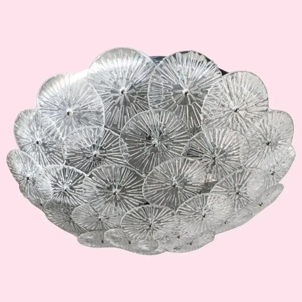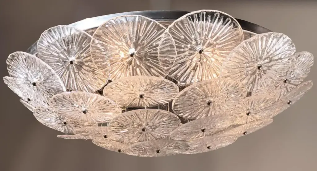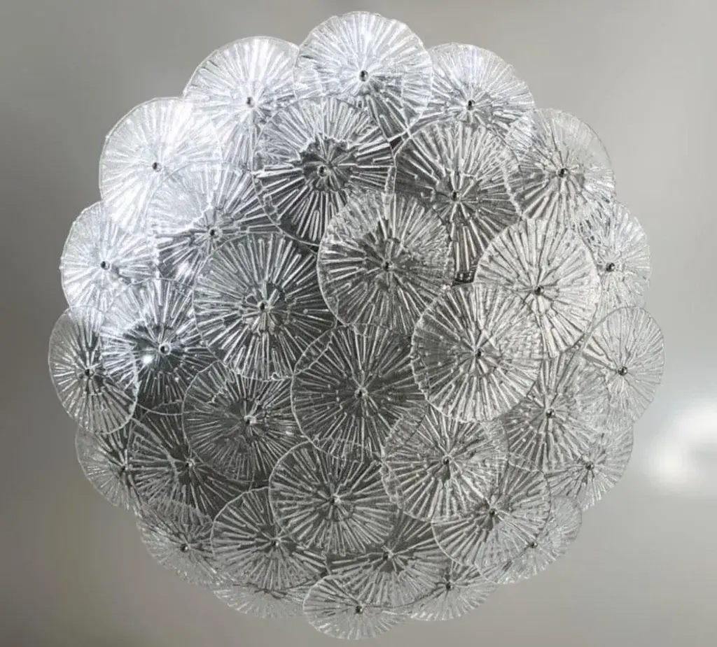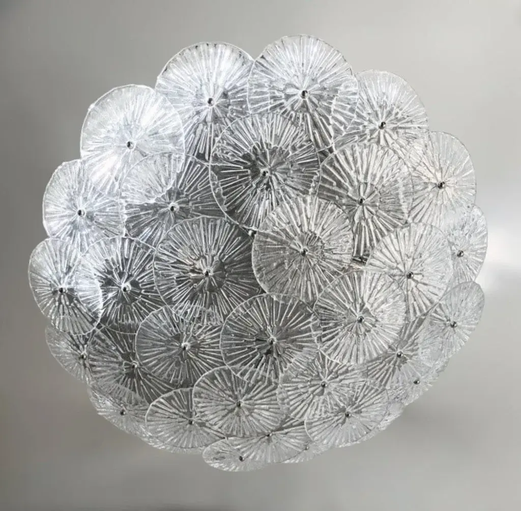 Italian flush mount with layered textured clear Murano glass discs mounted on chrome finish metal frame, designed by Fabio Ltd / Made in Italy 6 lights / E26 or E27 type / max 60W each Measures: Diameter 29.5 inches, height 7 inches