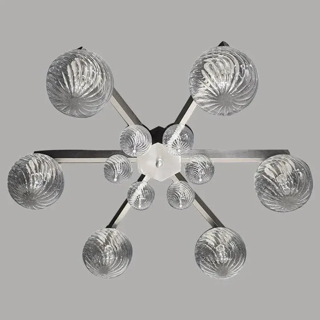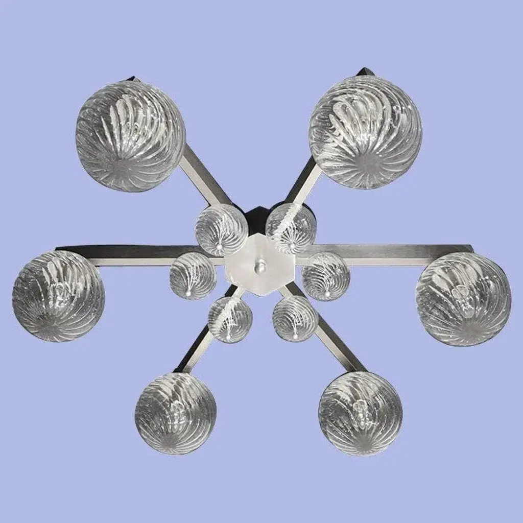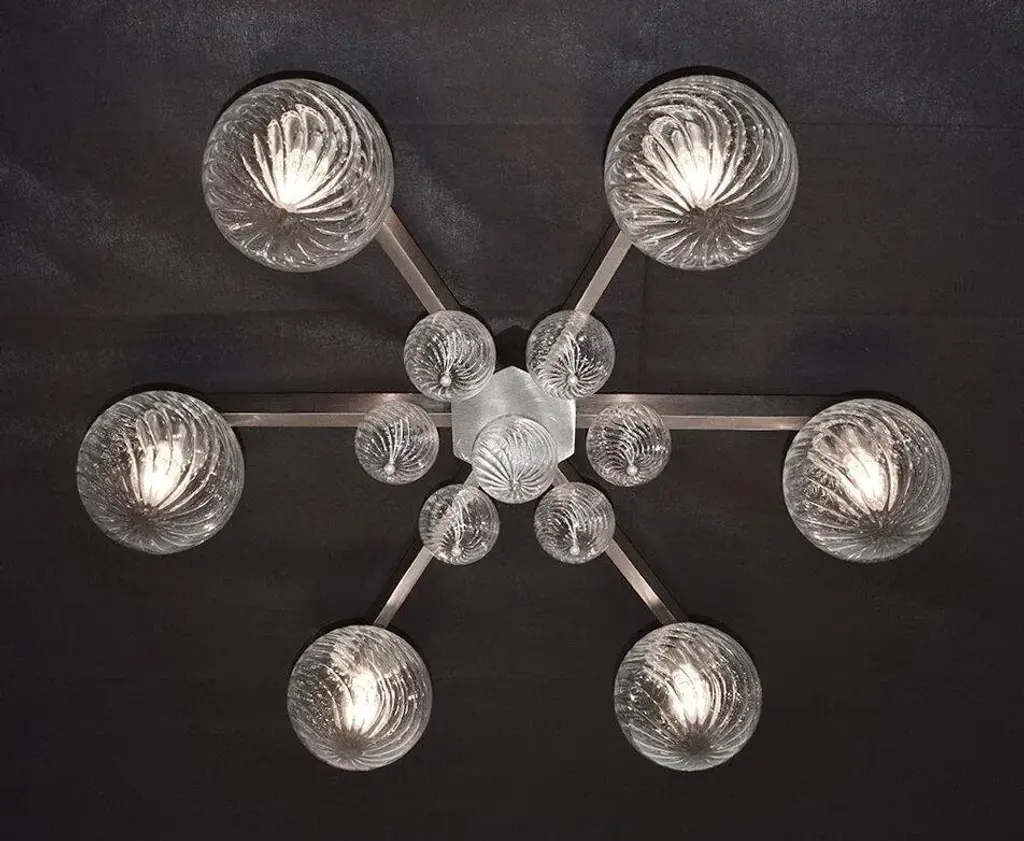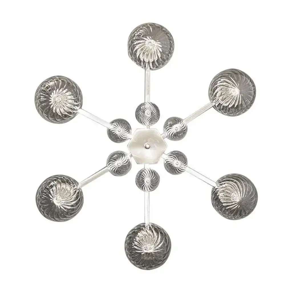 Italian modern flushmount with clear glass globes with twisted texture on satin nickel finish metal frame / Made in Italy Designed by Fabio Bergomi for Fabio Ltd 6 lights / E12 or E14 type / max 40W each Diameter: 31 inches / Height: 9.5 inches