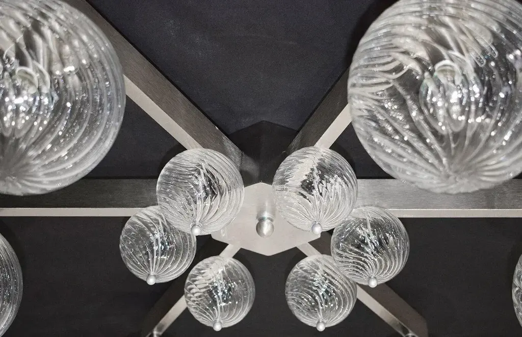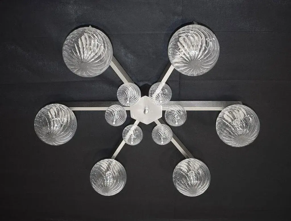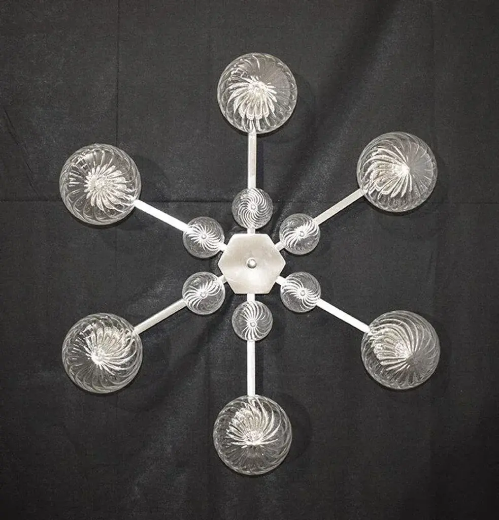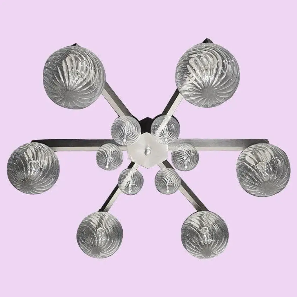 Italian modern flushmount with clear glass globes with twisted texture on satin nickel finish metal frame / Made in Italy Designed by Fabio Bergomi for Fabio Ltd 6 lights / E12 or E14 type / max 40W each Diameter: 31 inches / Height: 9.5 inches