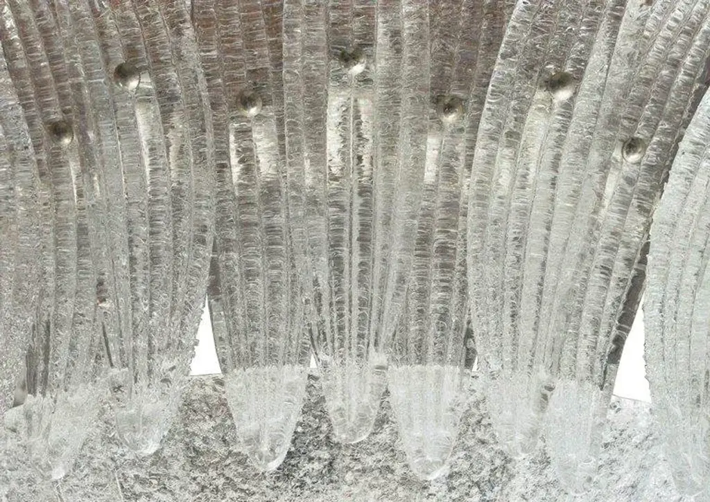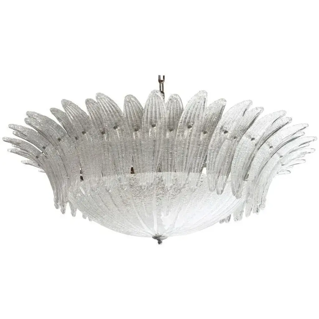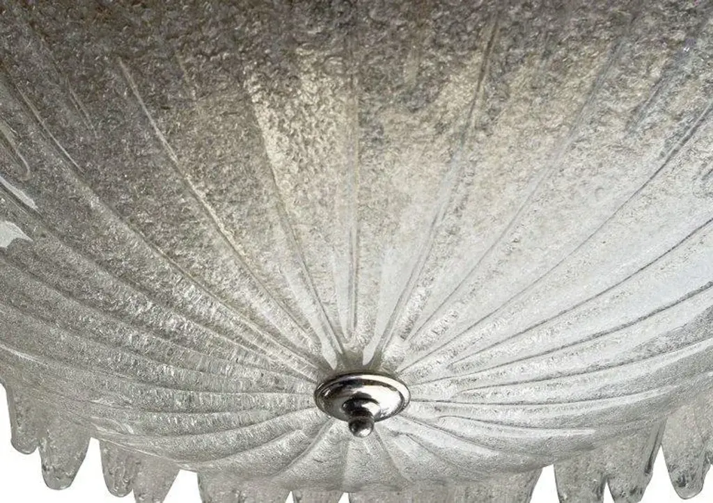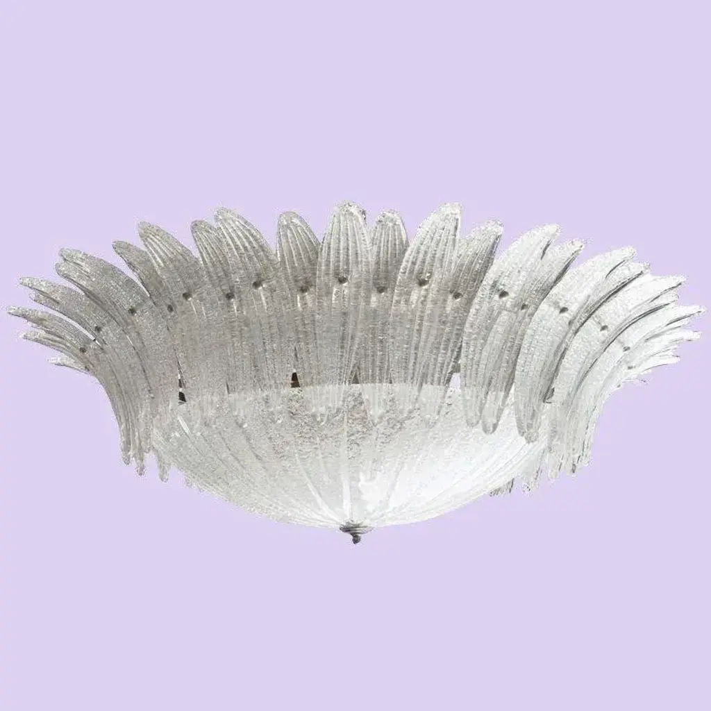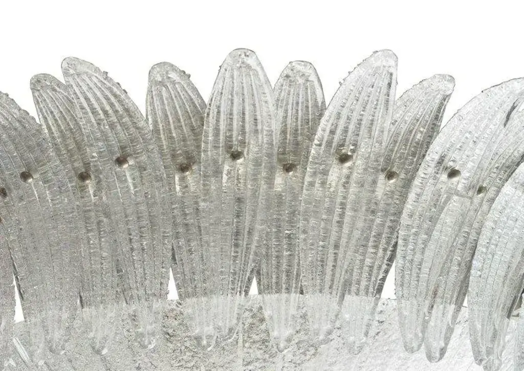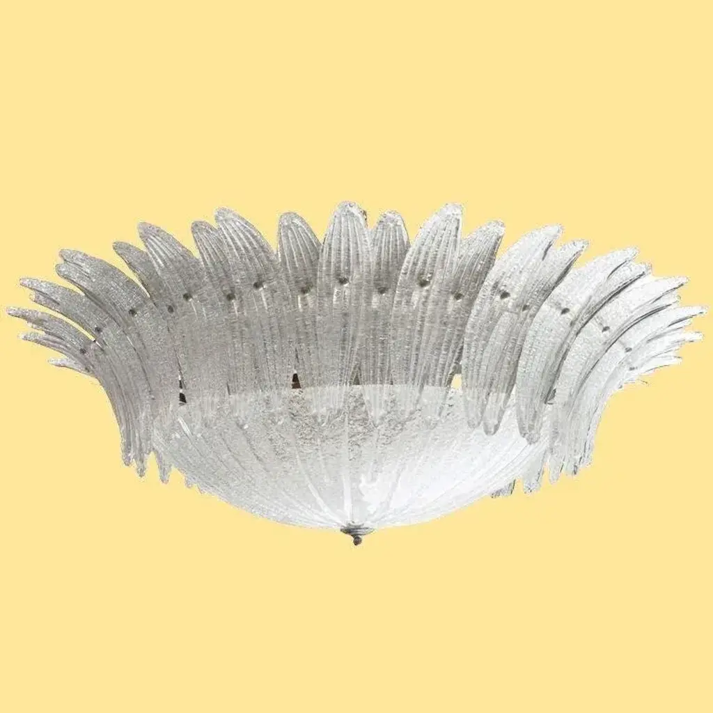Italian Palmette flush mount chandelier shown in clear Murano glass leaves with granular texture using Graniglia technique in the style of Barovier, mounted on chrome metal finish frame / Made in Italy 9 lights / E26 or E27 type / max 60W each Diameter: 40 inches / Height: 10 inches