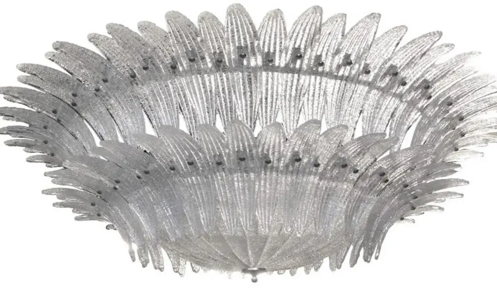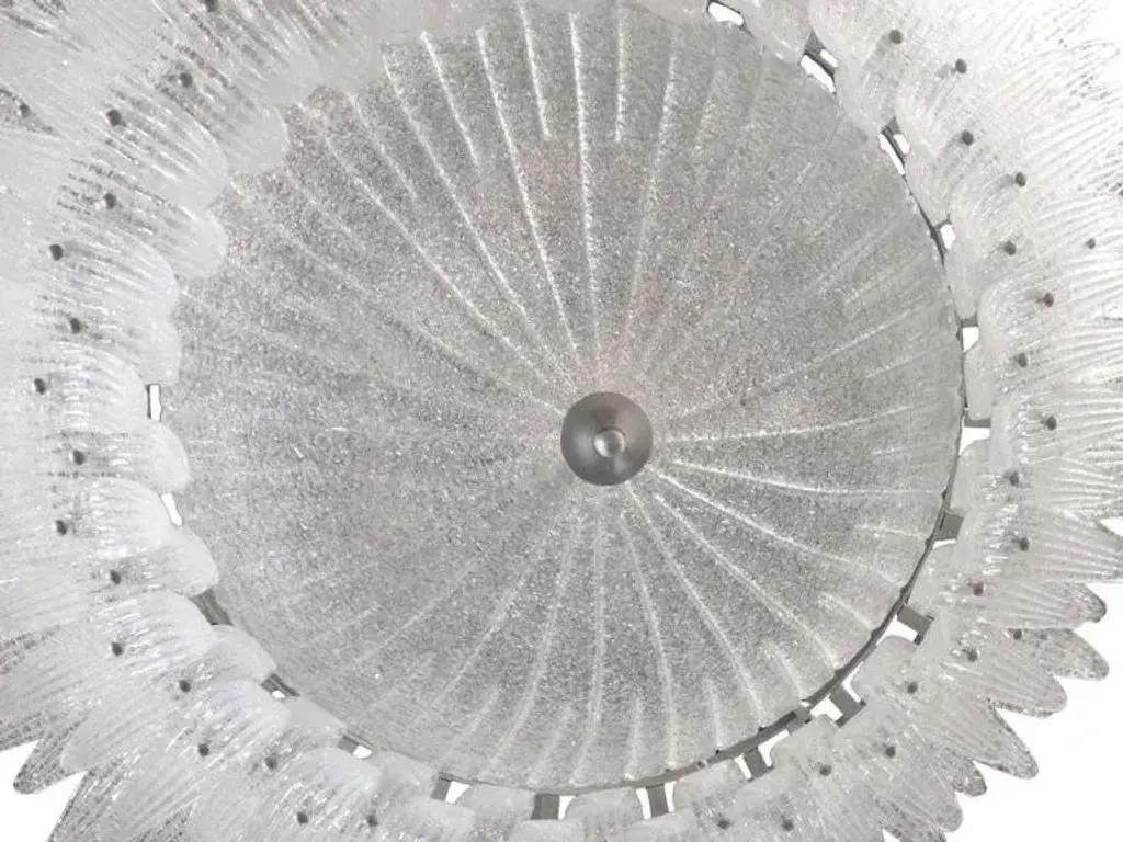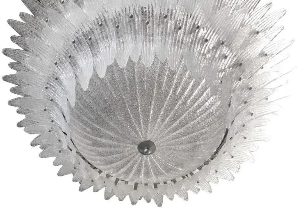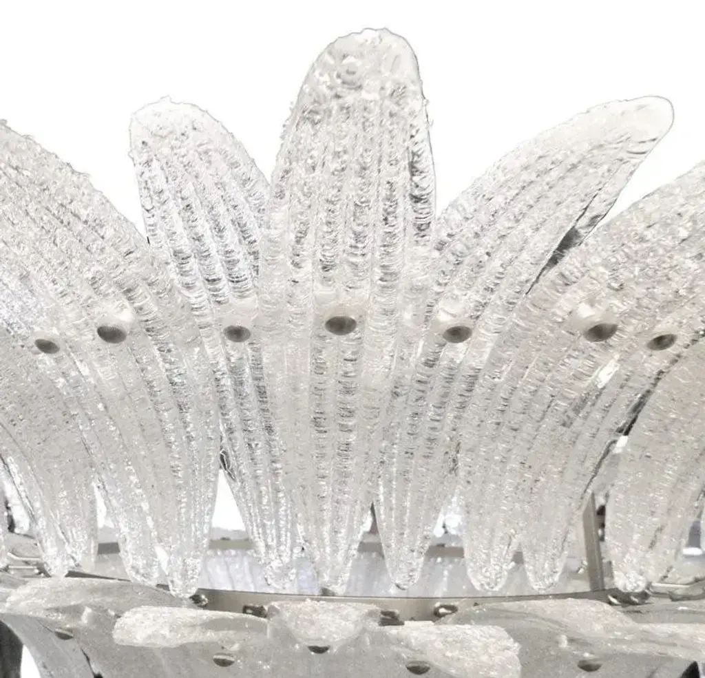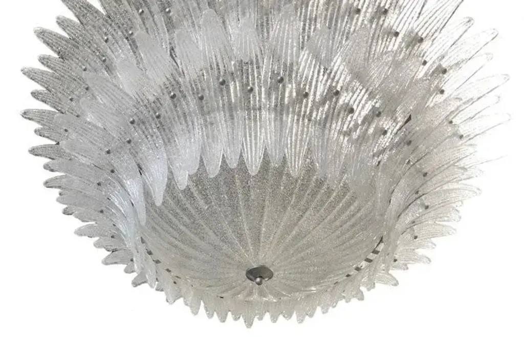 Italian two tier Palmette flush mount chandelier shown in clear Murano glass leaves with granular texture using Graniglia technique in the style of Barovier, mounted on satin nickel metal frame / Made in Italy 8 lights / E26 or E27 type / max 60W each Diameter: 48 inches / Height: 16 inches