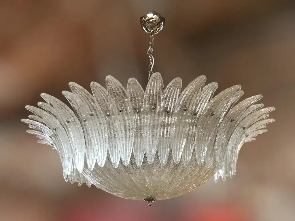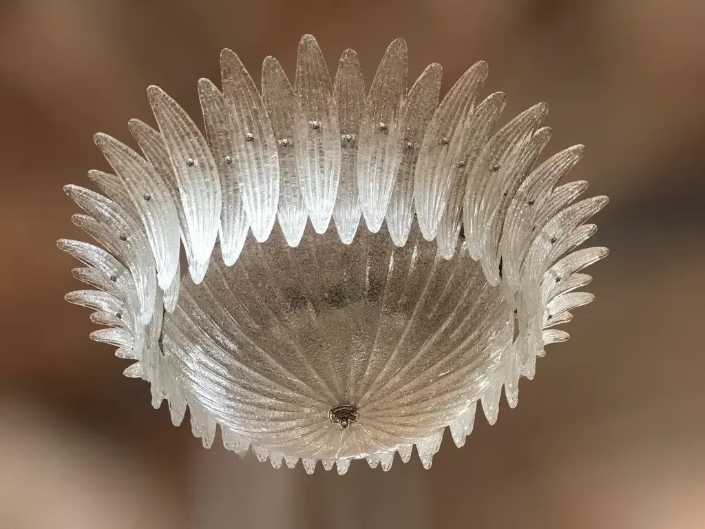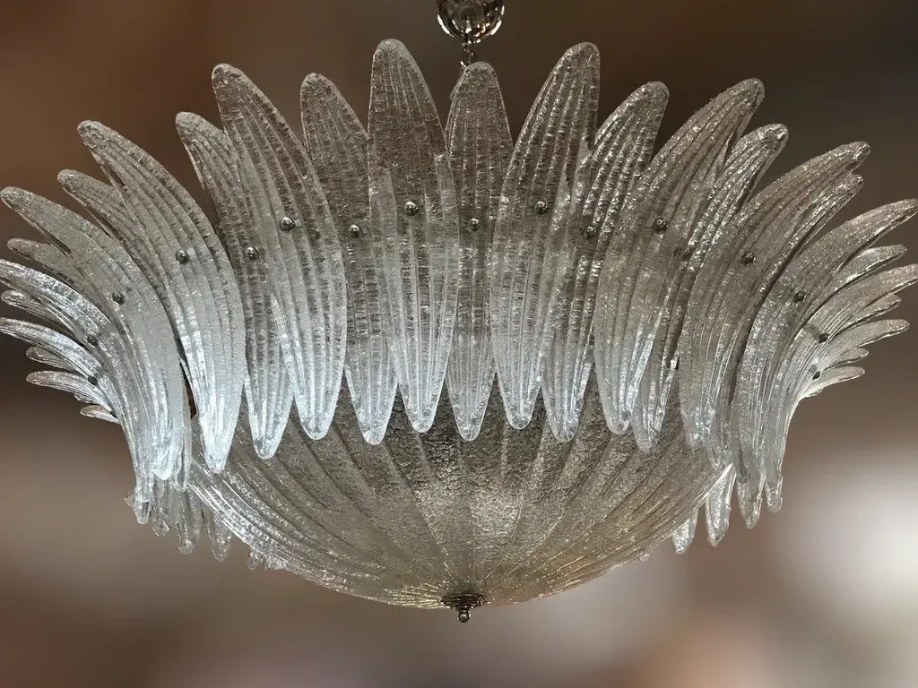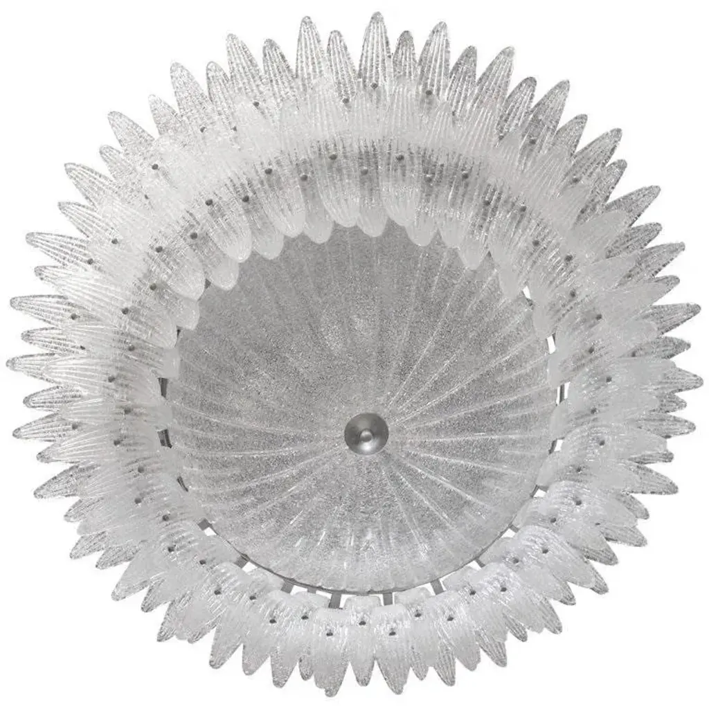 Italian two tier Palmette flush mount chandelier shown in clear Murano glass leaves with granular texture using Graniglia technique in the style of Barovier, mounted on satin nickel metal frame / Made in Italy 8 lights / E26 or E27 type / max 60W each Diameter: 48 inches / Height: 16 inches