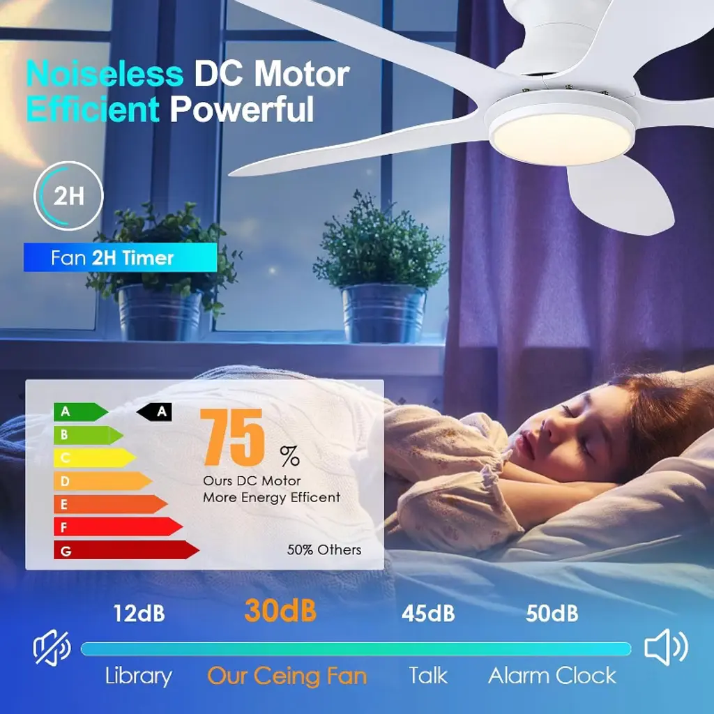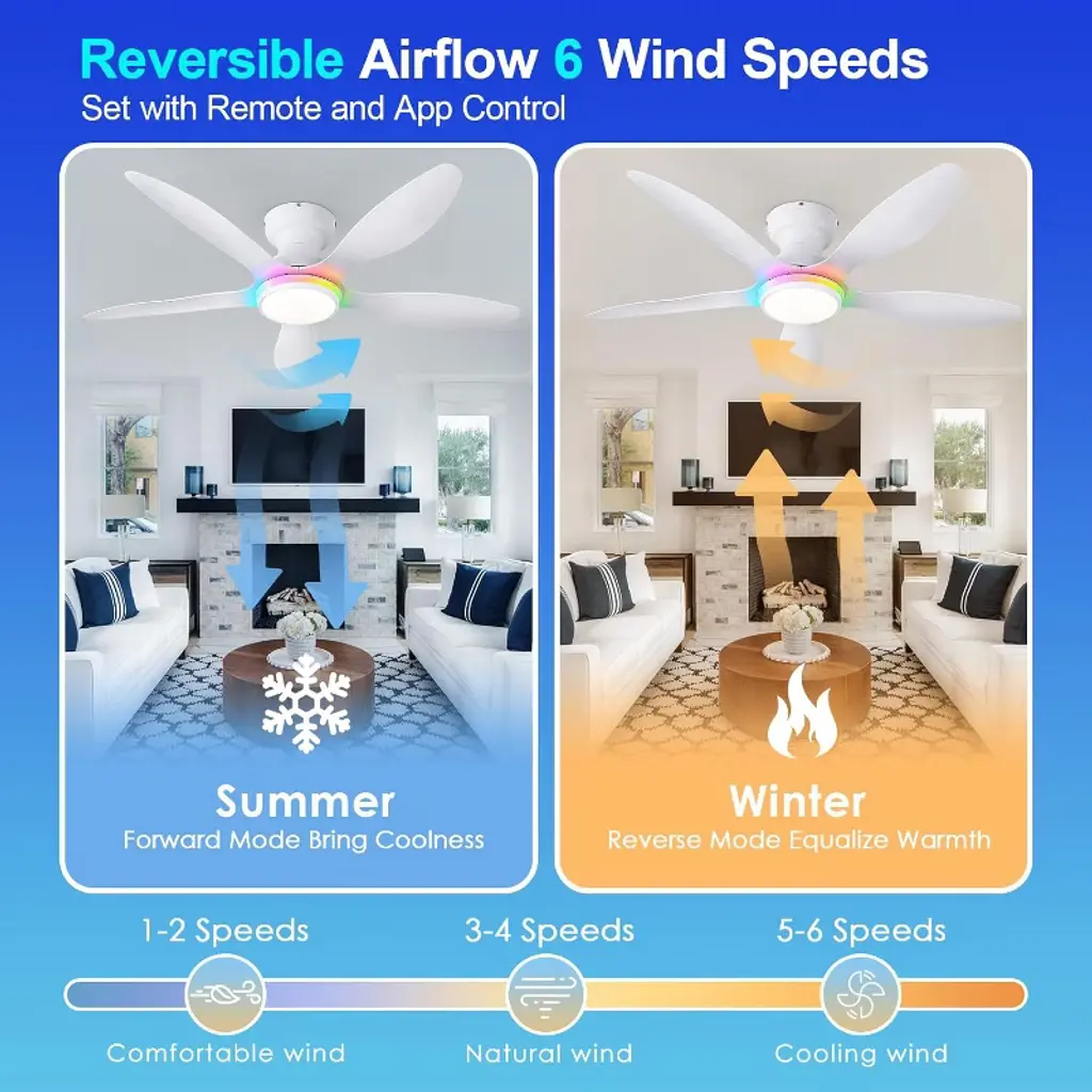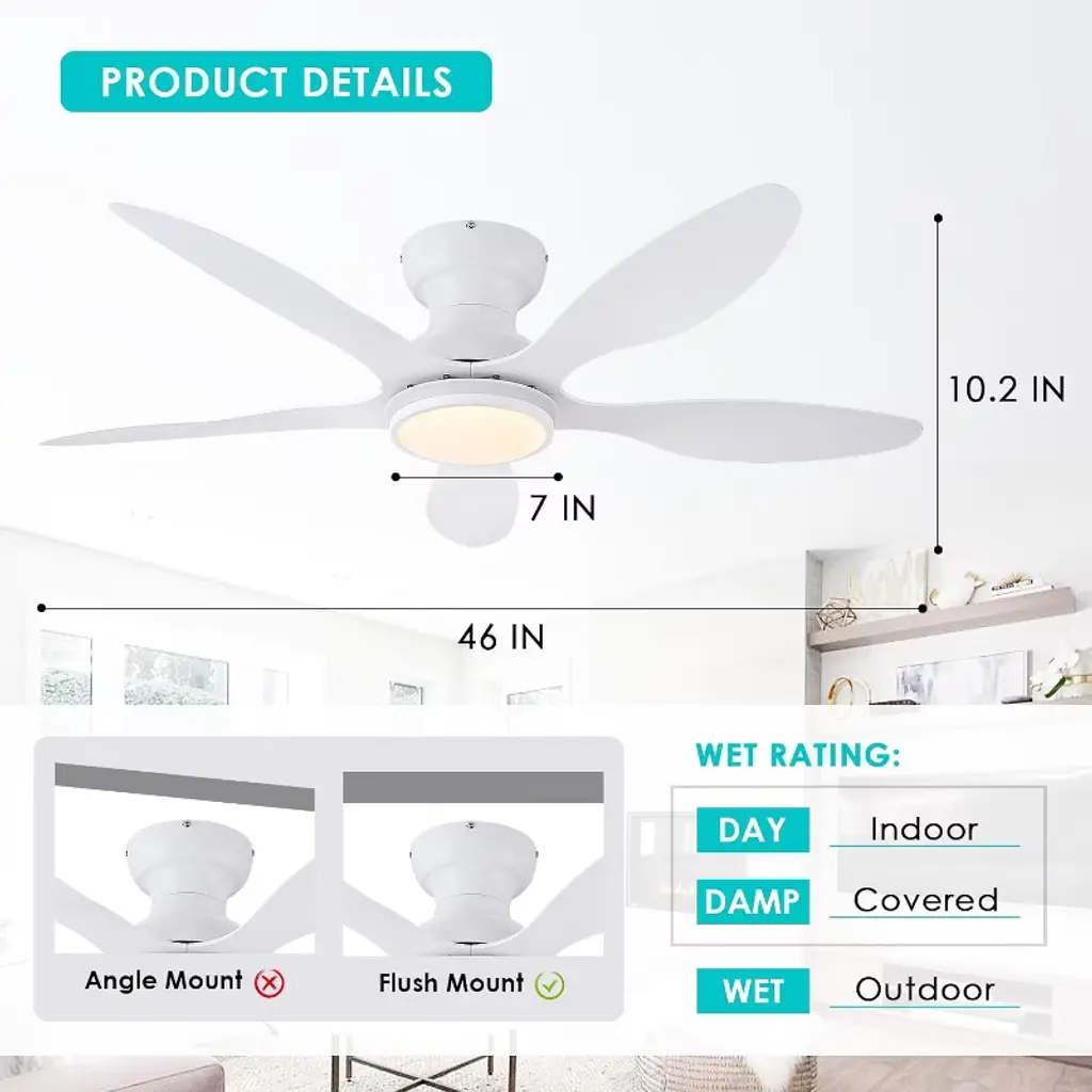 Upgrade your home comfort with this 46" low-profile ceiling fan, designed for seamless flush-mount installation in rooms with low ceilings. Its 6-blade design ensures optimal airflow with quiet, energy-efficient performance—perfect for bedrooms, living rooms, or any indoor space. The integrated 3 CCT LED light lets you customize brightness and color temperature (warm white, cool white, daylight) to match your mood. Featuring a reversible motor, this fan provides year-round comfort—cooling in summer and circulating warm air in winter. The sleek, modern design blends with any decor, while the ultra-quiet operation ensures undisturbed relaxation. Easy to install and backed by durable construction, this fan combines style, functionality, and convenience for a superior home upgrade.