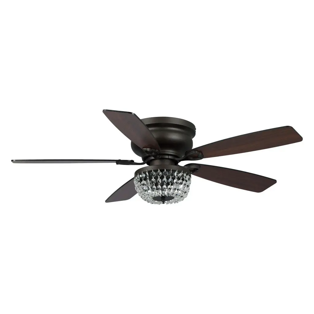 Keeping cool doesn't mean you have to sacrifice style: This flush mount ceiling fan brings glay up to your ceiling The coolest part isn't its blades, but the crystal shade that surrounds 2-bulbs apiece for an eye-catching glow. With the lights, there are 5 satin Nickel finished wood blades that have 3 speeds. This fan and lighting kit must be hardwired and installed by a qualified electrician.