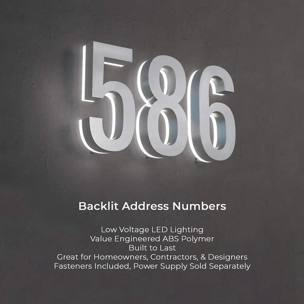 Requires drilling and low voltage electrical work; professional installation recommended; power supply is required, mounting plate is advised for an easier install process. Both sold separately, please look in our Houzz store.LED lights are emitted from behind to elegantly display your house numbersHigh quality ABS-Polymer with an acrylic backingBrightness can be adjusted with the spacing options provided with each number, or mounted flush to minimize light outputRequires a low voltage 12-volt DC power source. Mounting hardware included. UL listed