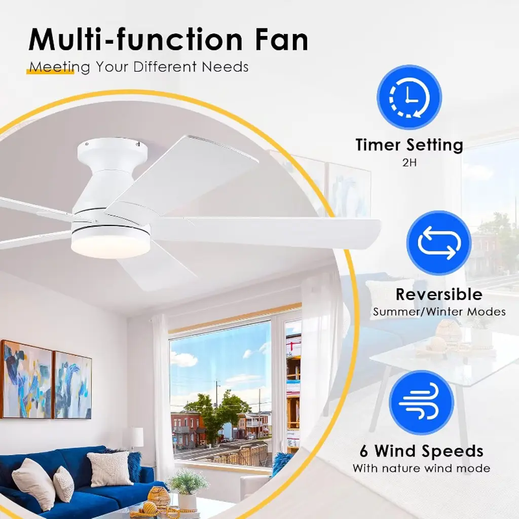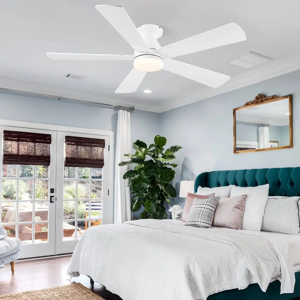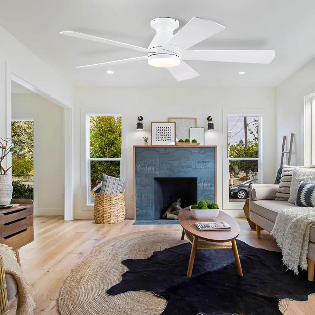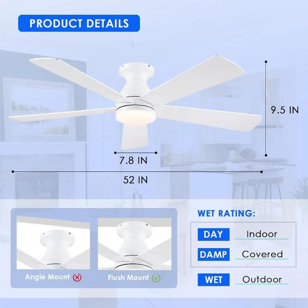 Boasting a touch of modern house appeal, this 52 inch low profile flush mount ceiling Fan is a great way to add comfort and style to bedroom,living room,patio. The decorative ceiling fan features a black or white finish fixture and 5 reversible dual side plywood blades. It is completed with LED integrated 3 CCT light, perfect for low ceilings. This modern design perfectly balances style to fit into industrial and modern and farmhouse decor.
