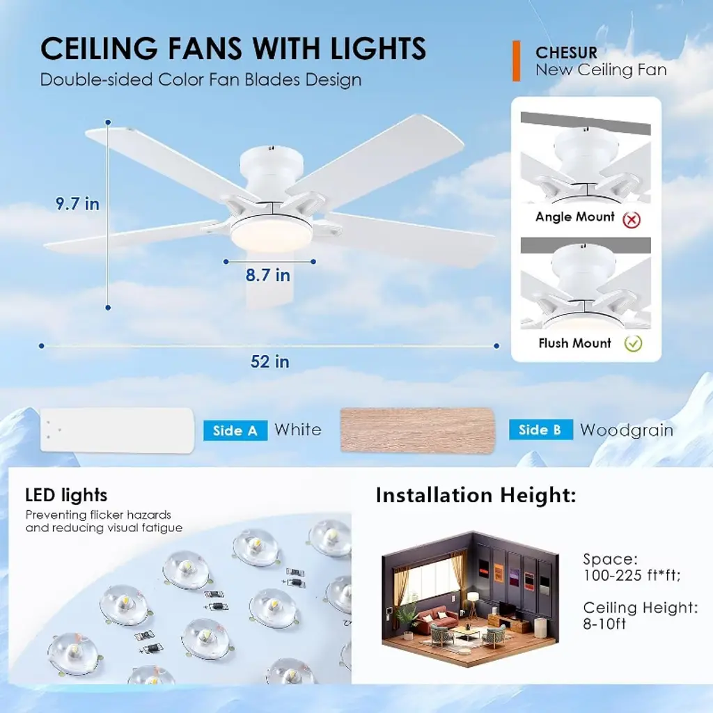 52 Inch White Flush Mount Ceiling Fan With Light,low Profile Ceiling Fan,3 Color Temperature Led,reversible Dc Motor