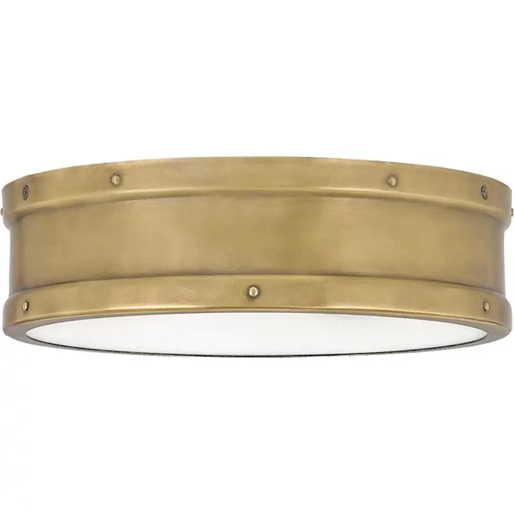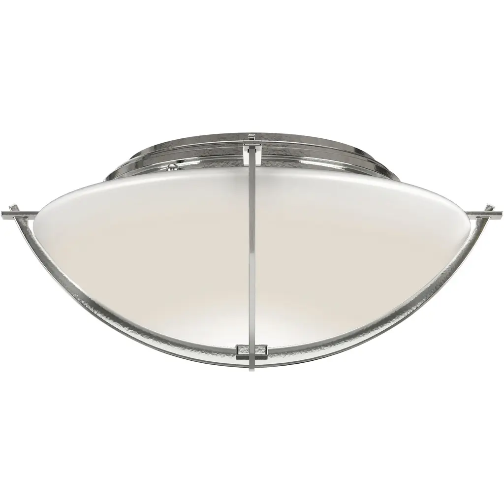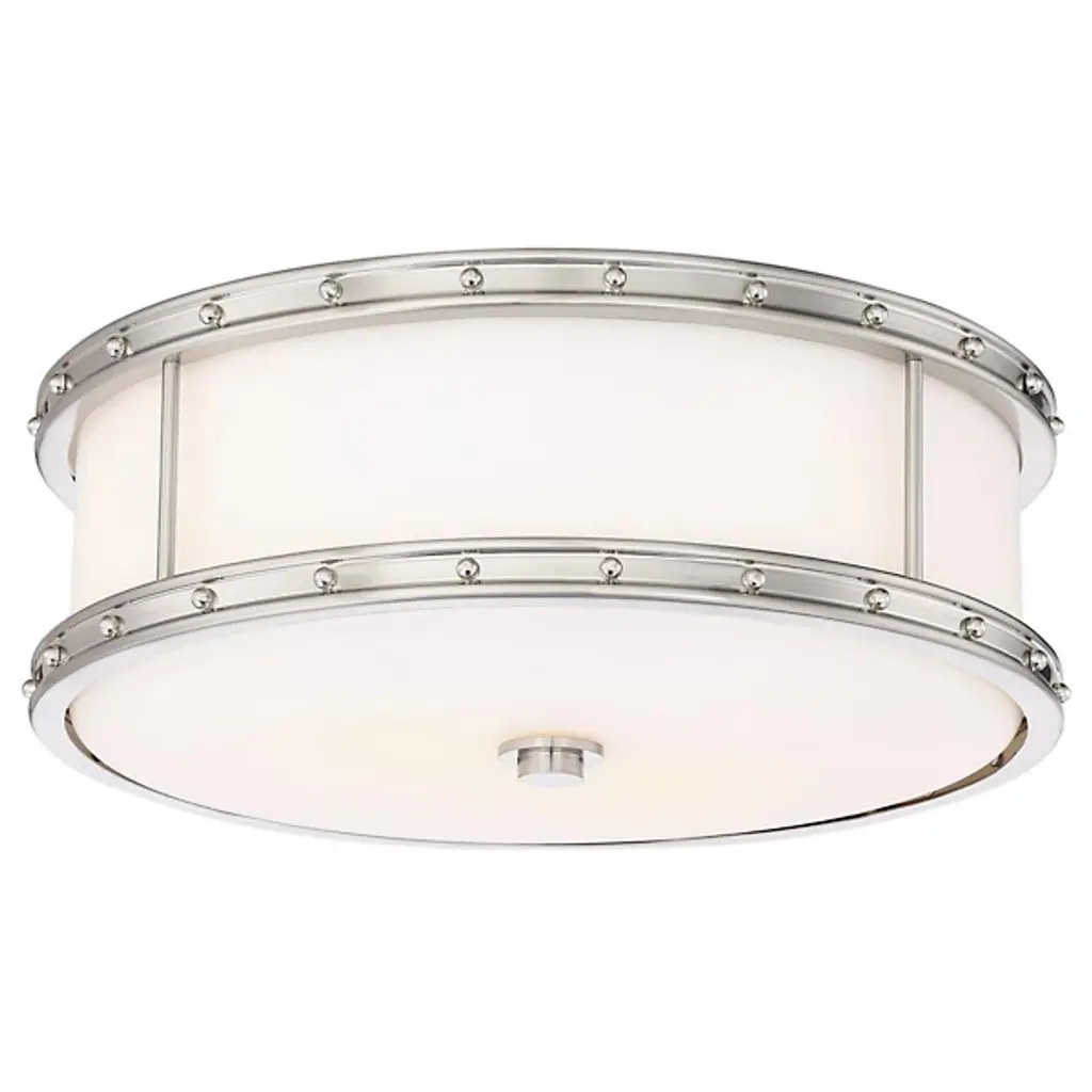 A classic fixture stepped up with provoking vanity. The 827/1827 Flush Mount Ceiling Light by Minka-Lavery is designed to reform the look of multiple spaces. This ceiling light features an etched opal glass drum that forms the shade creating a serene vibe. Running around its borders are polished metal straps that are enhanced with geometric accents to accentuate the laidback profile of the shade. When switched on, the integrated LED source dissipates warm light that stays blissful, be it halls, dining room, foyer, bathroom, etc.