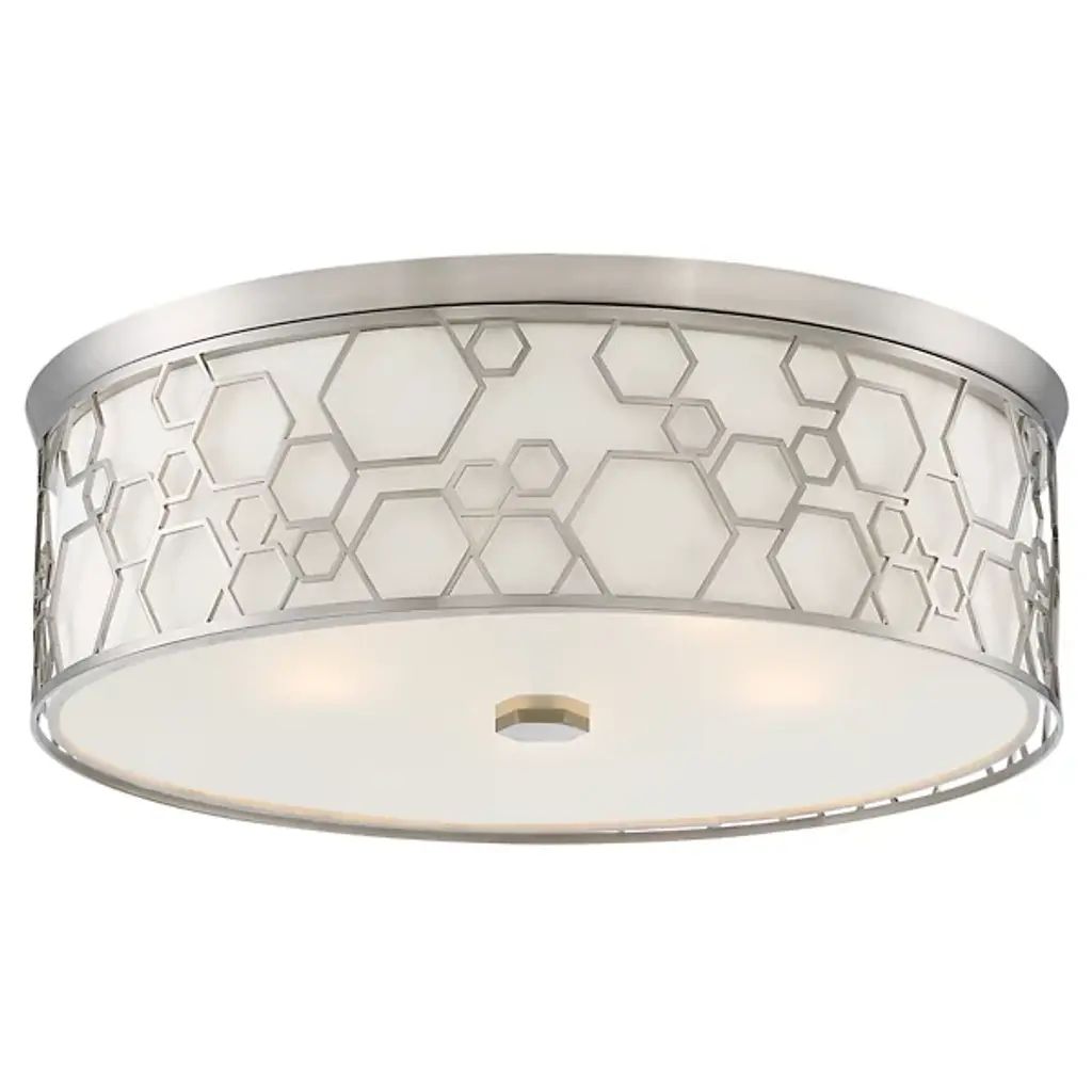 A straightforward yet eye-catching piece. The 845/1845 Flushmount from Minka-Lavery has a very modern design with a minimalist silhouette. The outside of the product is covered in metal with a pattern of hexagons repeating across it, letting you view the shade behind it. The shade is made out of White Fabric, which is ideal for eliminating dark spots and glares by diffusing the light as it passes through and filling your living room, bedroom, or hallway with gentle illumination.