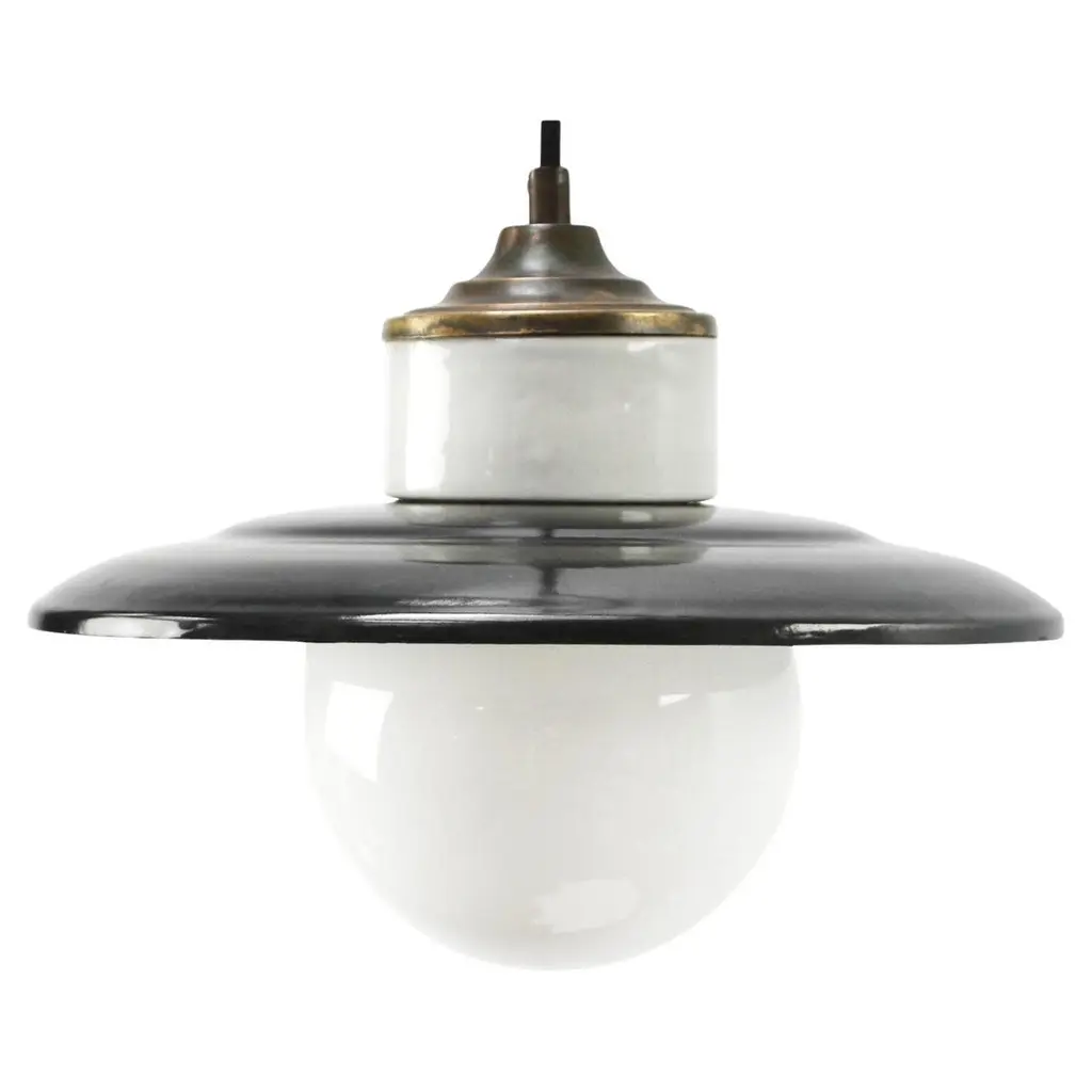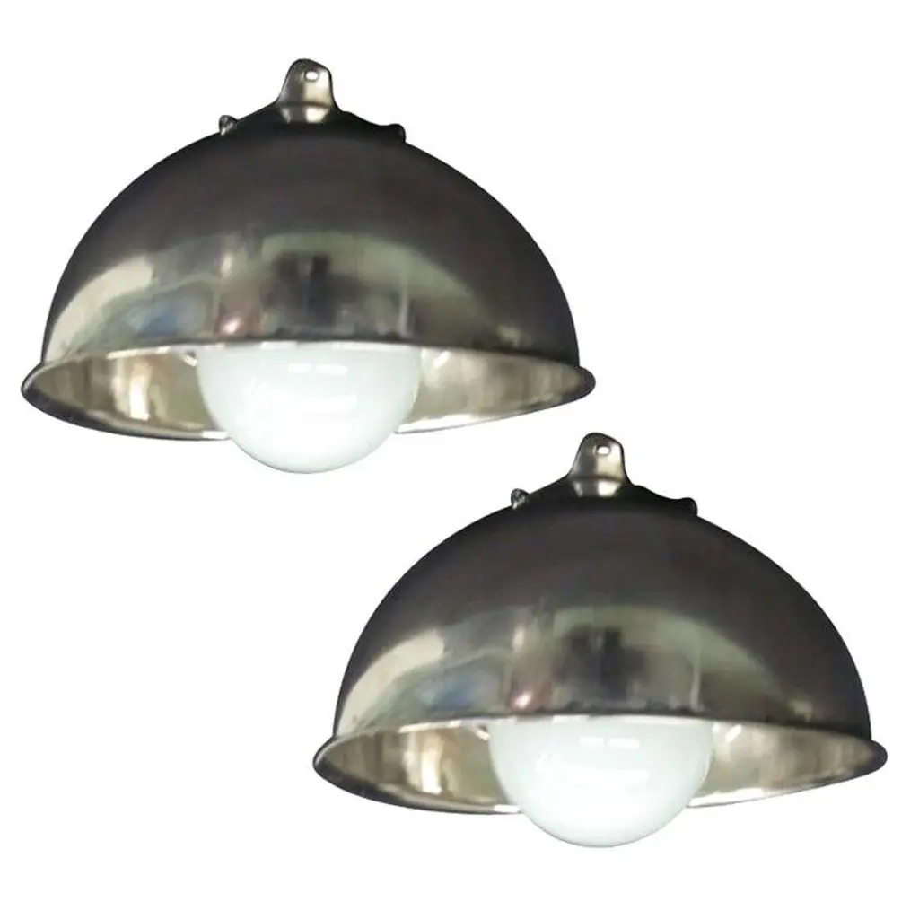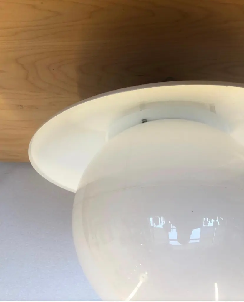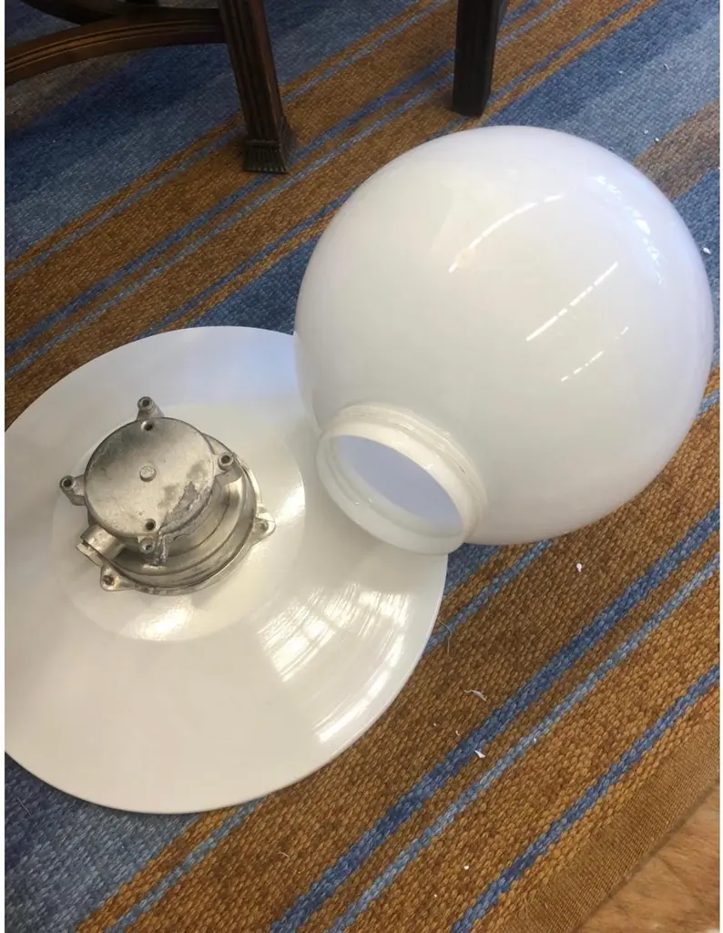 A pair of flush mount outdoor light designed by Paavo Tynell for Idman Oy, Model H10-100. Finland, circa 1950th. Large glass bawl with metal mount. Can be modified for mount on hanging rod. Marked by manufacturer. Glass shade diameter 12". Existing wires, rewiring available upon request.