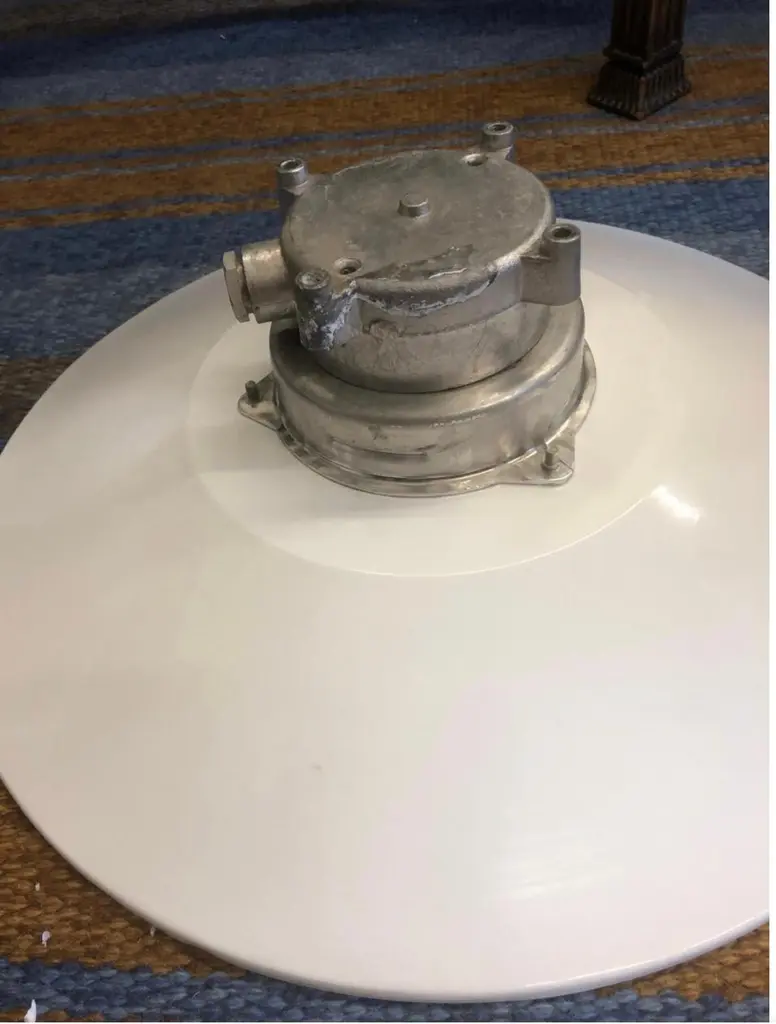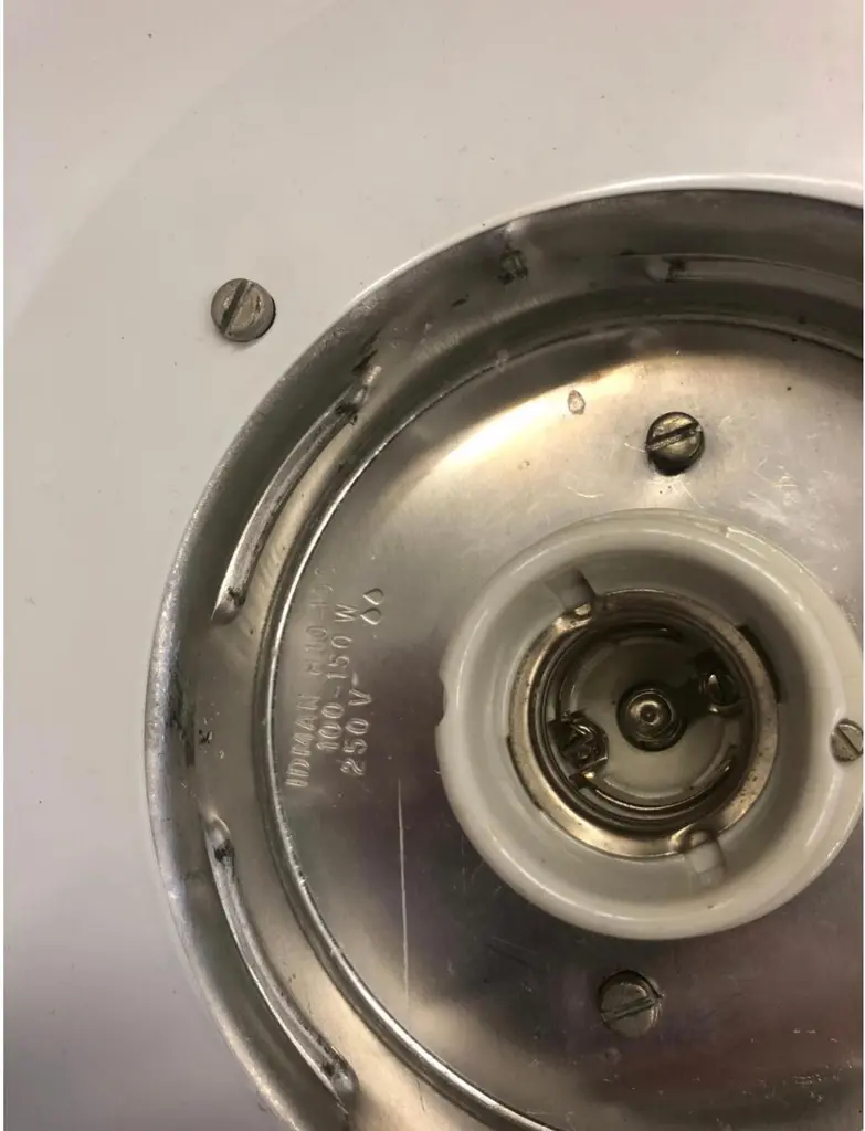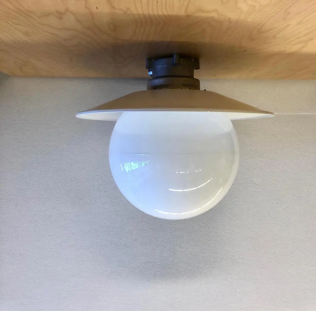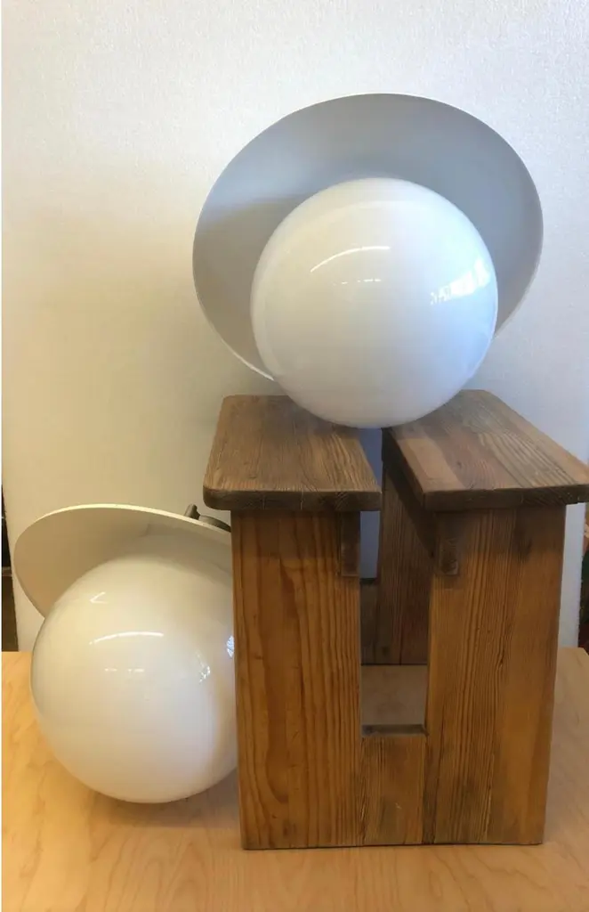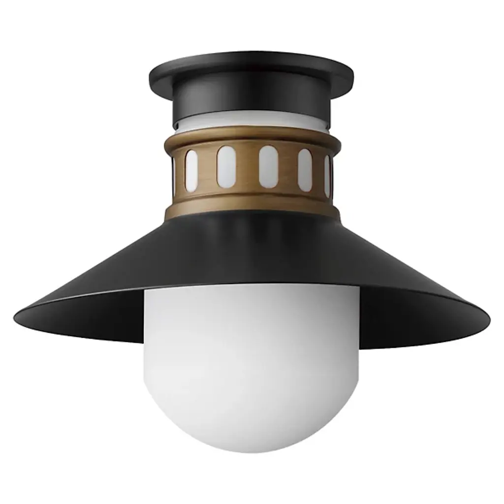 A pair of flush mount outdoor light designed by Paavo Tynell for Idman Oy, Model H10-100. Finland, circa 1950th. Large glass bawl with metal mount. Can be modified for mount on hanging rod. Marked by manufacturer. Glass shade diameter 12". Existing wires, rewiring available upon request.