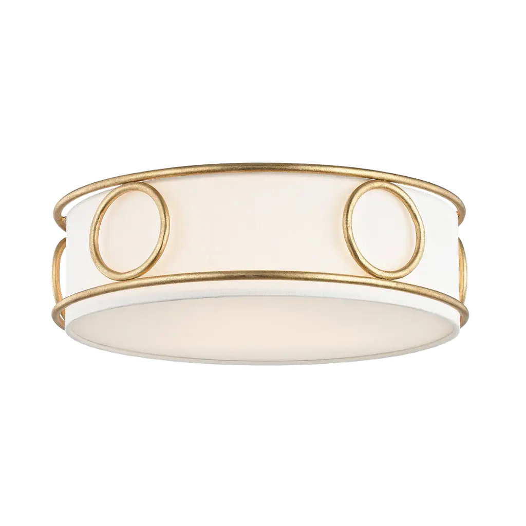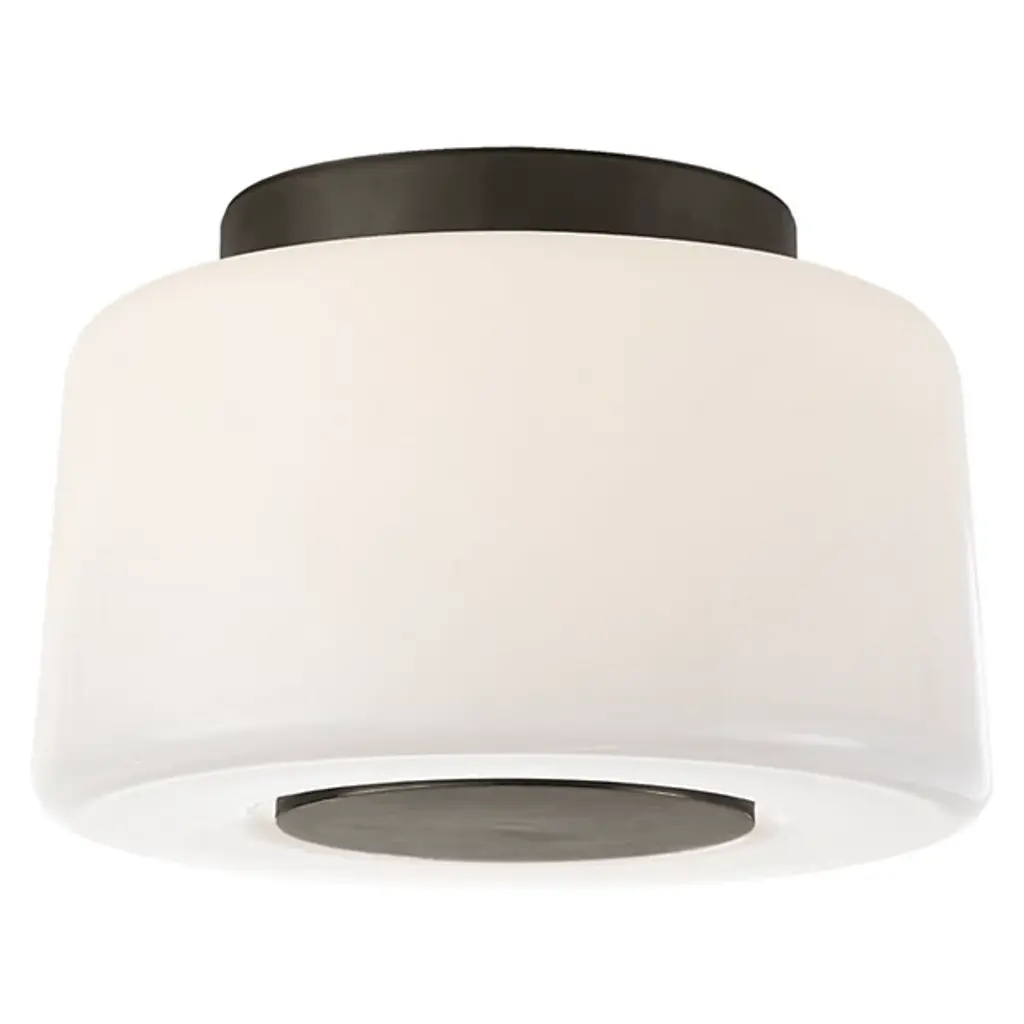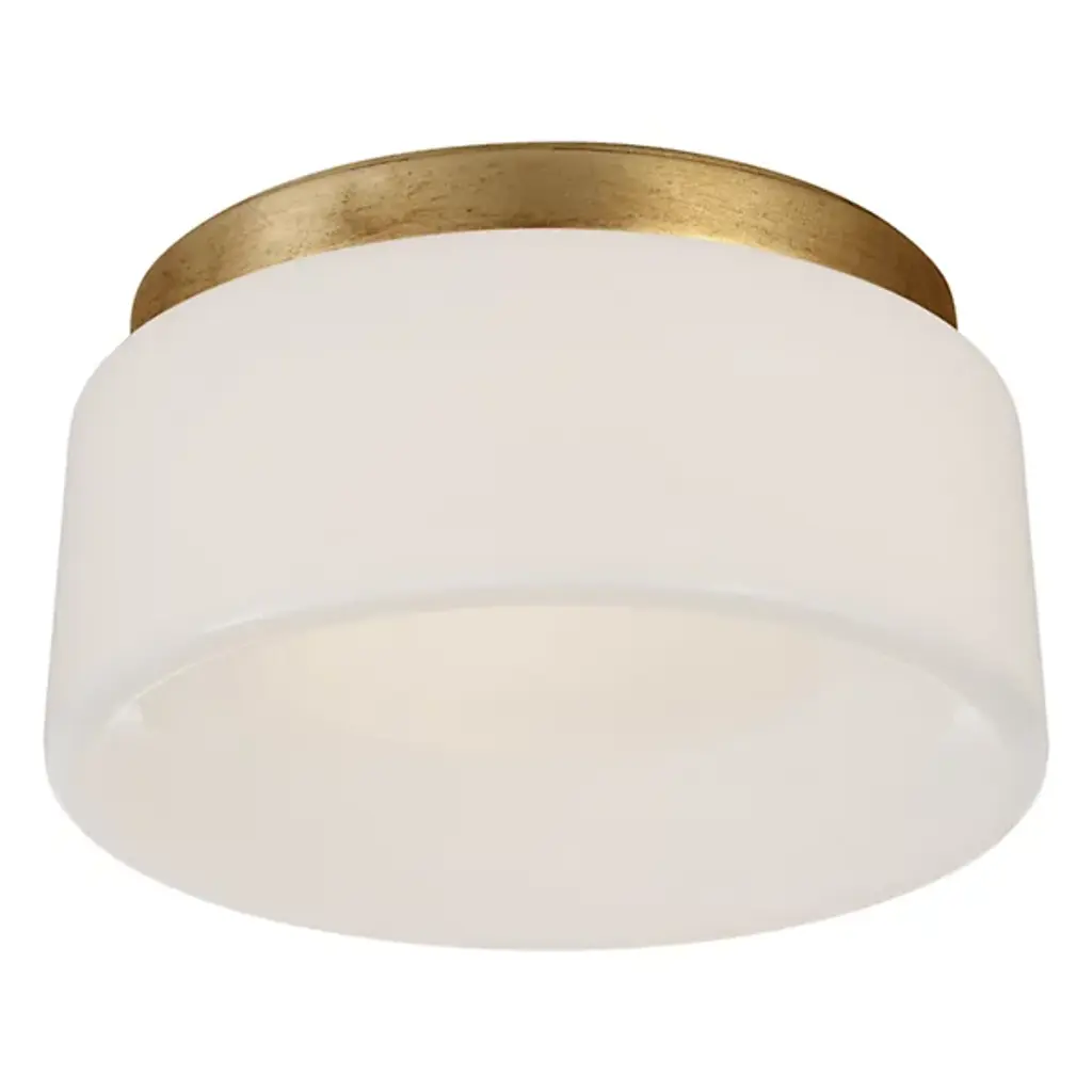 A charming button for one’s living spaces. The Acme Flushmount from Visual Comfort Signature, formerly known as Visual Comfort, adds levity to the room with clean, bright volumes. This modern piece evokes the distinct, contrasting fixtures of the mid-century. It creates a 2-tone visual with its metal hardware. The circular element at the base appears like a button that invites a press. A grand glass drum envelops the button-like accent with a clean white hue. This opaque drum receives a golden glaze all over. The bright light eases through the drum and offers the room a spacious glow
