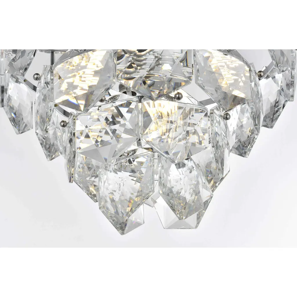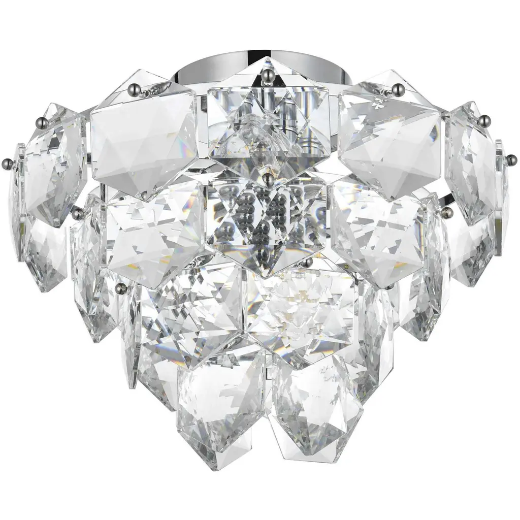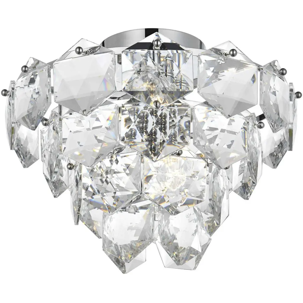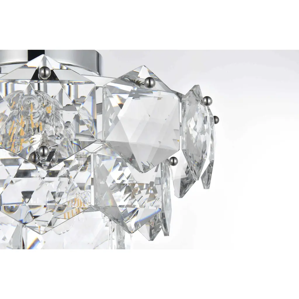 Add a touch of sophistication and shine to your space with this cascading crystal flush mount light. Designed with a multi-tier arrangement of six-sided faceted crystals, this fixture creates a mesmerizing interplay of light and shadow, making it a standout addition to any room. Its sturdy iron frame is paired with your choice of a chrome finish for a sleek, modern aesthetic or satin gold for a warm, opulent feel. The fixture includes six E12 sockets (bulbs sold separately) and is fully dimmable, giving you the ability to set the perfect ambiance. The matching canopy finish completes the cohesive look. Compact yet visually impactful, this flush mount is ideal for kitchens, dining rooms, living rooms, or offices, offering both functional illumination and a dazzling decorative element.