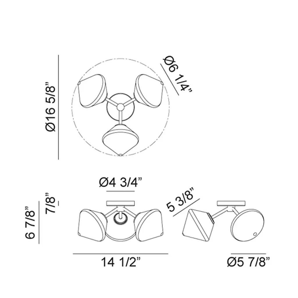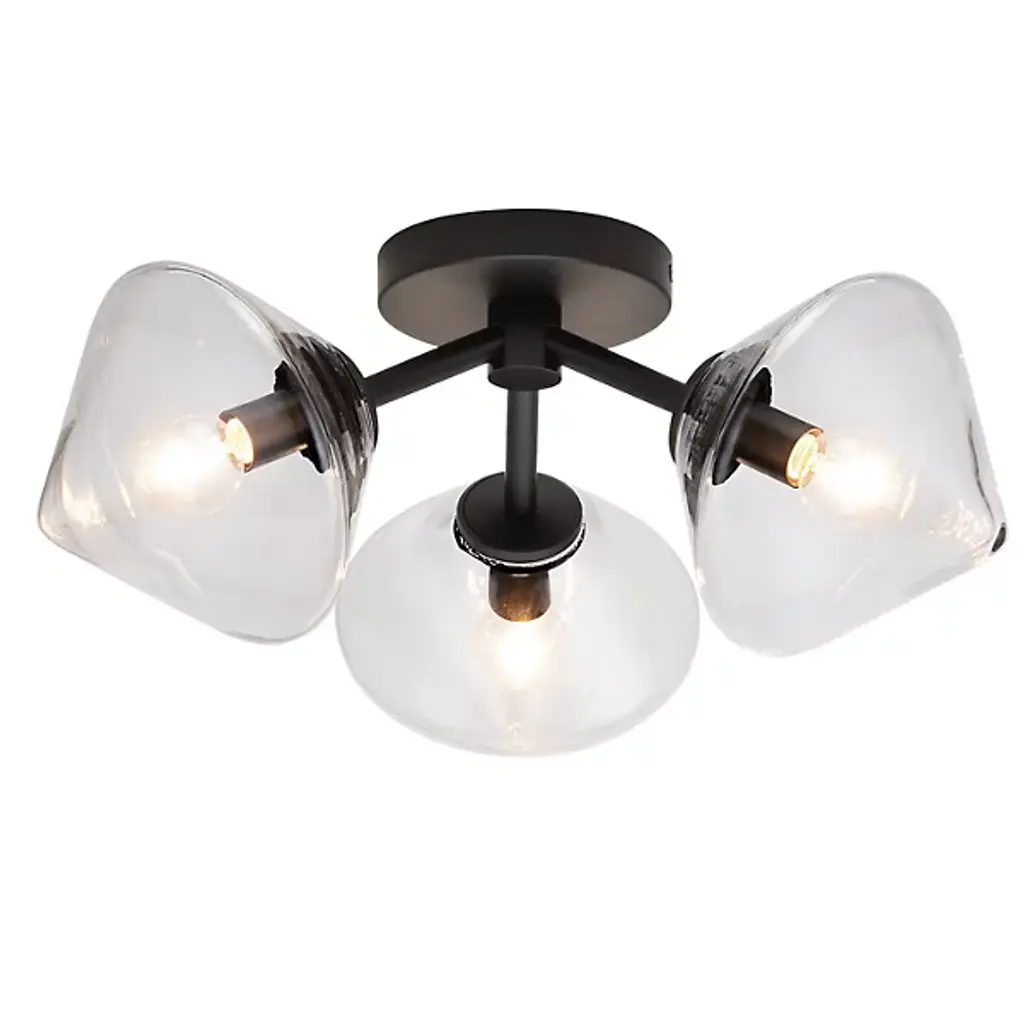 The Adelina Diamond Flush Mount Ceiling Light. by Huxe enlivens all sorts of indoor décor with an artful simplicity that blends modern elegance with clean, contemporary lines. A sleek circular metal canopy secures the versatile fixture, while a central hub extends an array of three slender arms out at even intervals, each one terminating in a single candelabra-base lamp contained by a wraparound glass diffuser. Each diffuser obscures the bright glare from the lamping, dispatching a bright, encompassing glow in all directions.