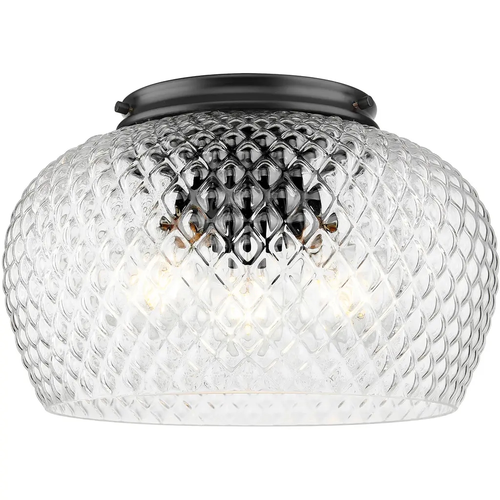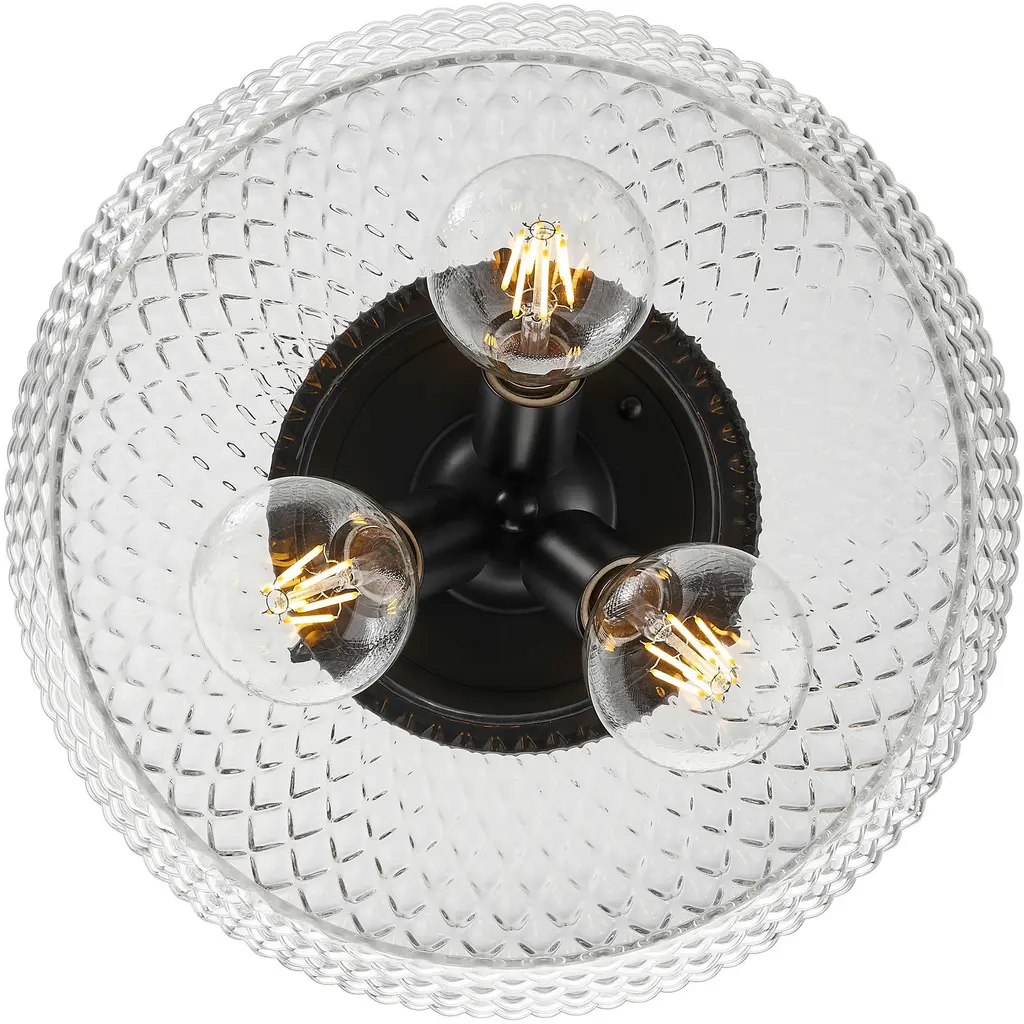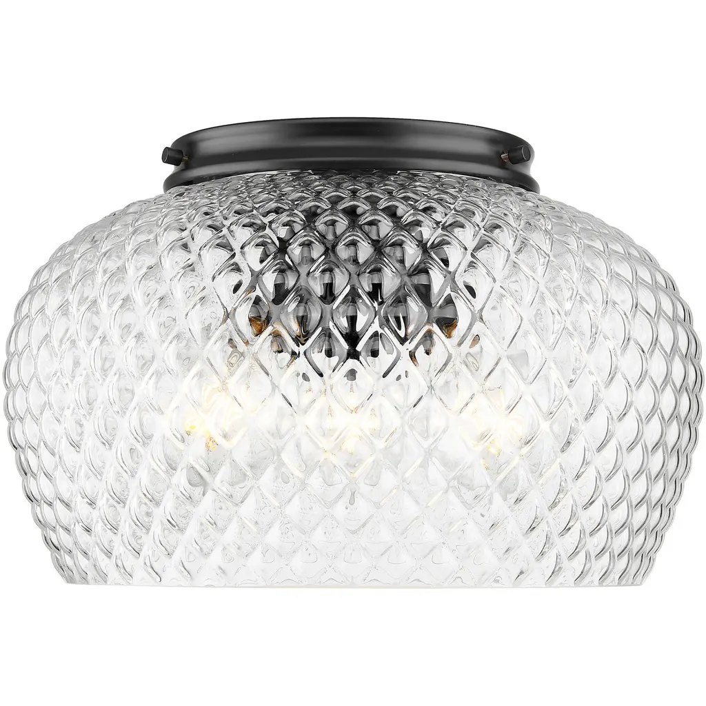 Elevate your space with the inviting farmhouse elegance of the Golden Lighting Adeline 3-light Flush Mount. Featuring a glass shade and a Matte Black frame, it creates a welcoming atmosphere throughout your home.The clear glass shade offers brilliant, unobstructed light, enhancing the cozy feel of this fixture. Textured glass shaped by skilled craftsmanship complements its sophisticated design, ensuring high-quality illumination for any area.The Matte Black finish is timeless, boasting a non-reflective surface that absorbs light while allowing the fixture to blend effortlessly with a variety of decors, from industrial to contemporary. This flush mount is perfect for low ceilings in hallways, closets, bathrooms, and more, rated for damp locations, making it suitable for spaces with occasional moisture.With overall dimensions of 14"W x 8.63"H x 14"D, it requires three E26 medium base bulbs (not included), with a maximum wattage of 60 per bulb.Bring charm and sophistication to your home with this quality fixture that promises to illuminate your surroundings beautifully.