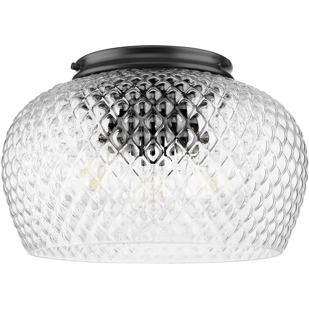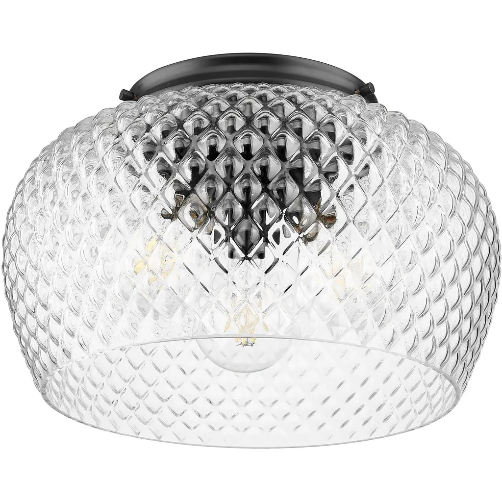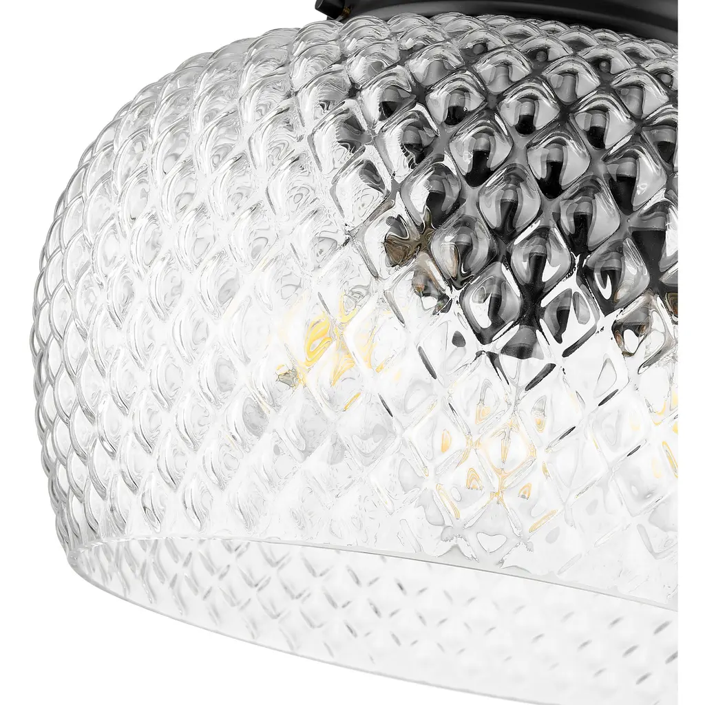 Elevate your space with the inviting farmhouse elegance of the Golden Lighting Adeline 3-light Flush Mount. Featuring a glass shade and a Matte Black frame, it creates a welcoming atmosphere throughout your home.The clear glass shade offers brilliant, unobstructed light, enhancing the cozy feel of this fixture. Textured glass shaped by skilled craftsmanship complements its sophisticated design, ensuring high-quality illumination for any area.The Matte Black finish is timeless, boasting a non-reflective surface that absorbs light while allowing the fixture to blend effortlessly with a variety of decors, from industrial to contemporary. This flush mount is perfect for low ceilings in hallways, closets, bathrooms, and more, rated for damp locations, making it suitable for spaces with occasional moisture.With overall dimensions of 14"W x 8.63"H x 14"D, it requires three E26 medium base bulbs (not included), with a maximum wattage of 60 per bulb.Bring charm and sophistication to your home with this quality fixture that promises to illuminate your surroundings beautifully.