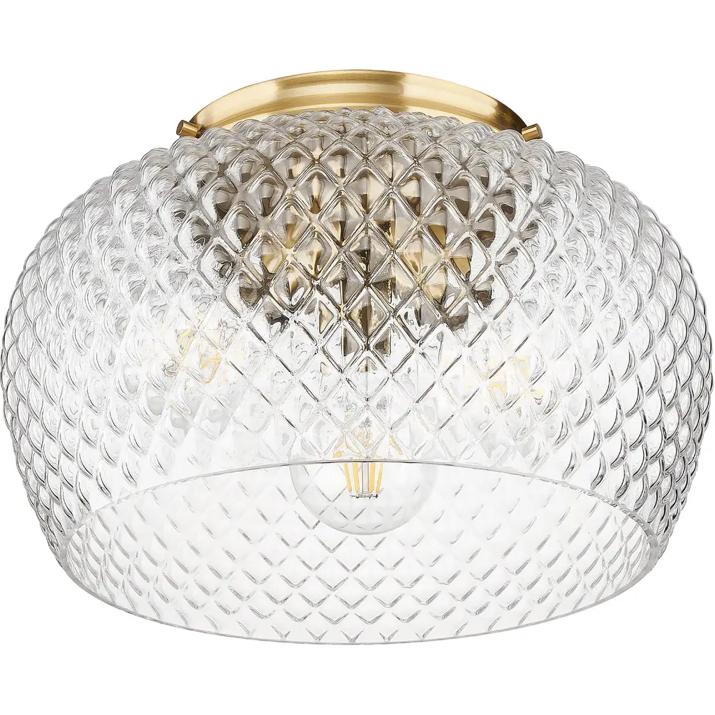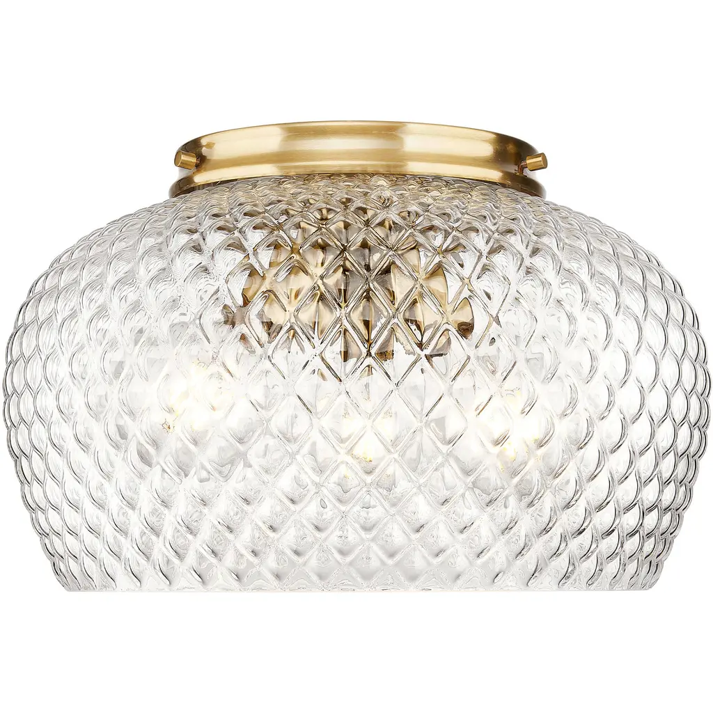 Brighten your space with the luxurious Modern Brushed Gold elegance of the Golden Lighting Adeline 3-light Flush Mount. This striking fixture features a glass shade that enhances its warm glow, creating an inviting atmosphere.The clear glass shade delivers unobstructed light, elevating the visual appeal of this timeless piece. With its polished and glossy finish, the glass complements the rich texture of the fixture, making it a centerpiece in any room.The Modern Brushed Gold finish radiates warmth, presenting a sophisticated sheen that diffuses light gracefully, ideal for a myriad of decor from vintage to modern. Designed for low ceilings in various spaces such as hallways, closets, or bathrooms, it is damp rated for areas exposed to occasional moisture.At dimensions of 14"W x 8.63"H x 14"D, this fixture requires three E26 medium base bulbs (not included), with a maximum wattage of 60 per bulb.Transform your home with this elegant lighting solution that merges quality and aesthetic appeal effortlessly.