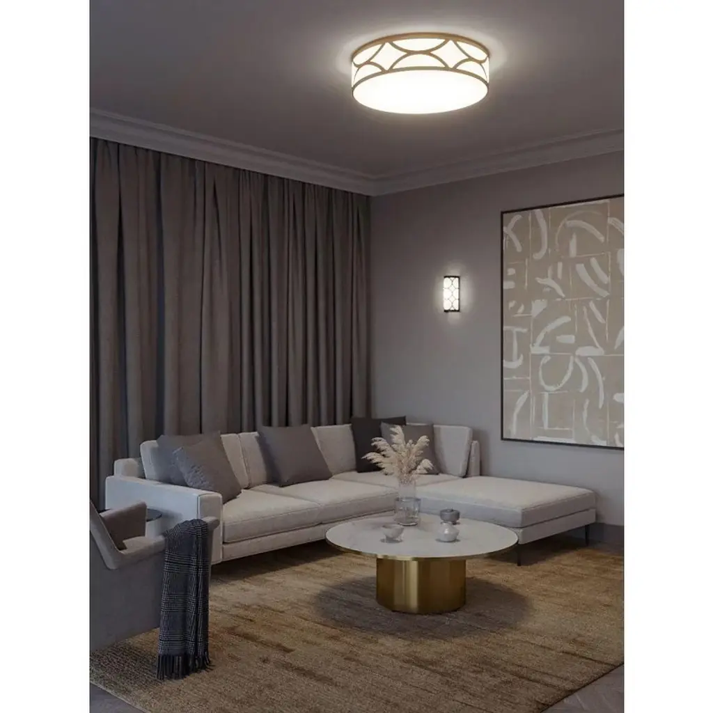 The Lake Flush Mount is a sophisticated lighting fixture that seamlessly blends contemporary and transitional aesthetics. Its dimmable feature allows for customizable illumination, making it suitable for a variety of settings. With its sleek drum-shaped design and damp location rating, it's not only visually appealing but also adaptable for both indoor and outdoor spaces. Traditional, replaceable bulb socket(s) allow you to tailor your lighting to suit your mood and needs. / Fixture is dimmable / Damp location / Contemporary and transitional in style / Drum fixture shape. ,